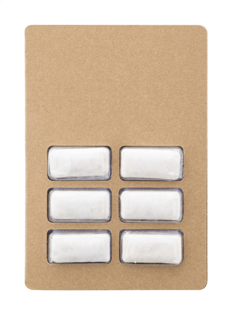 6 Stück zuckerfreier Kaugummi im Blister mit individuell gestalteter, vollfarbig bedruckter, perforierter Kraftpapierhülle. Mindestmenge: 100 Stk.