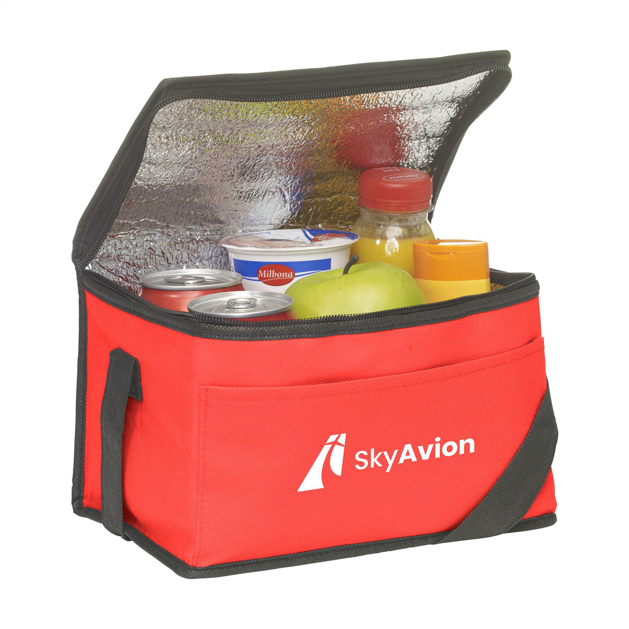 Kühltasche aus nonwoven recyceltem Polyester (80 g/m²). Geeignet für 6 Getränkedosen oder Lebensmittel. Funktional, kompakt, leicht und stark. Mit Trageriemen. GRS-zertifiziert. Recyceltes Material insgesamt: 82%. Fassungsvermögen ca. 4 Liter.