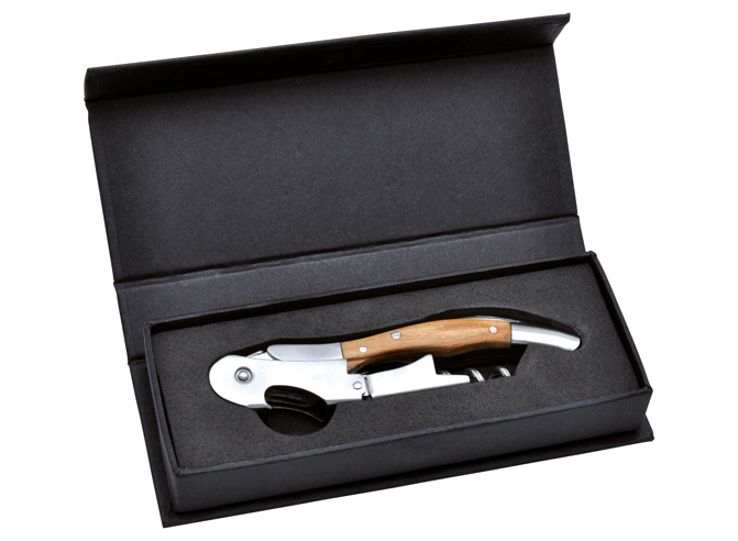 Professioneller Doppelhebel-Korkenzieher. Griff aus Olivenholz. Zwei geschmiedete Heftbacken aus rostfreiem Edelstahl. Korkenzieher-Spirale mit fünf Windungen aus Edelstahl, einer mikroverzahnten Kapselschneiderklinge und einem Flaschenöffner. Wird in einer schwarzen Geschenkbox geliefert. Die Vorteile in Kürze: - Cleveres Doppelhebel-System ermöglicht geräuschloses und müheloses Ziehen aller Korken. - Korkenzieher mit fünf Spiralen, mit der Sie selbst beschädigte Korken ziehen können. Das Gewinde reduziert Druck und Reibung und lässt während des Eindringens in den Korken allmählich Luft entweichen. - Der zusätzliche Flaschenöffner spart wertvolle Zeit. - Der Griff aus Olivenholz verleiht Eleganz und Authentizität auf jedem Tisch. - Wird in einer eleganten Geschenkbox präsentiert.
