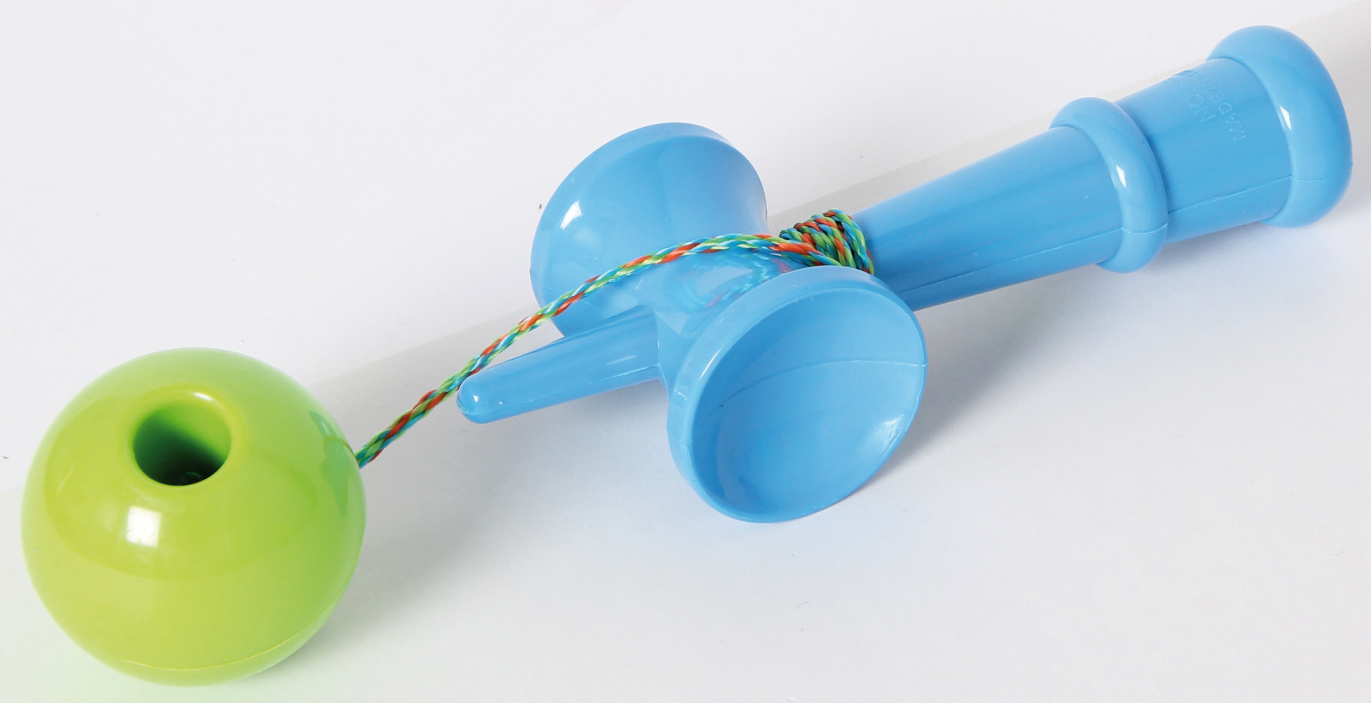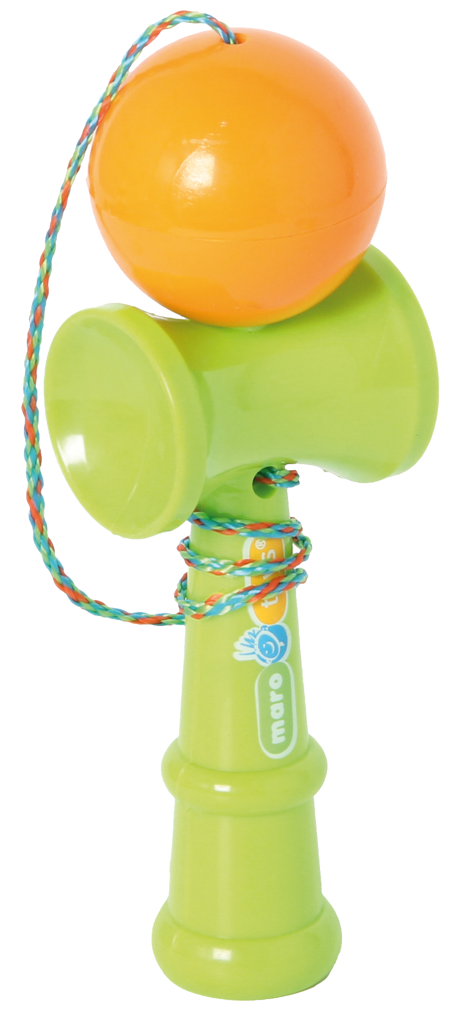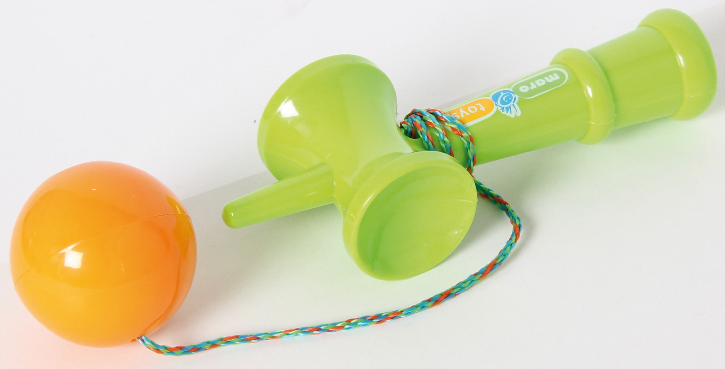 Die Kugel ist mit einer Schnur mit dem Griff verbunden. Es gilt, den Ball zu fangen. Dazu hat der Griff an den Seiten verschiedene Vertiefungen und einen Stift. In drei Farbkombinationen sortiert. Aus Kunststoff.