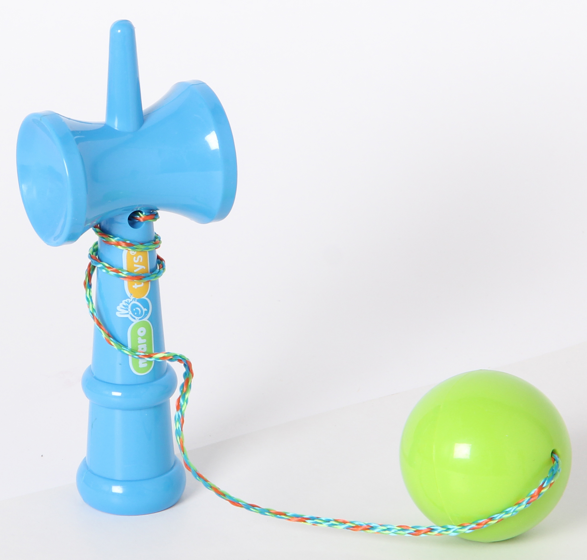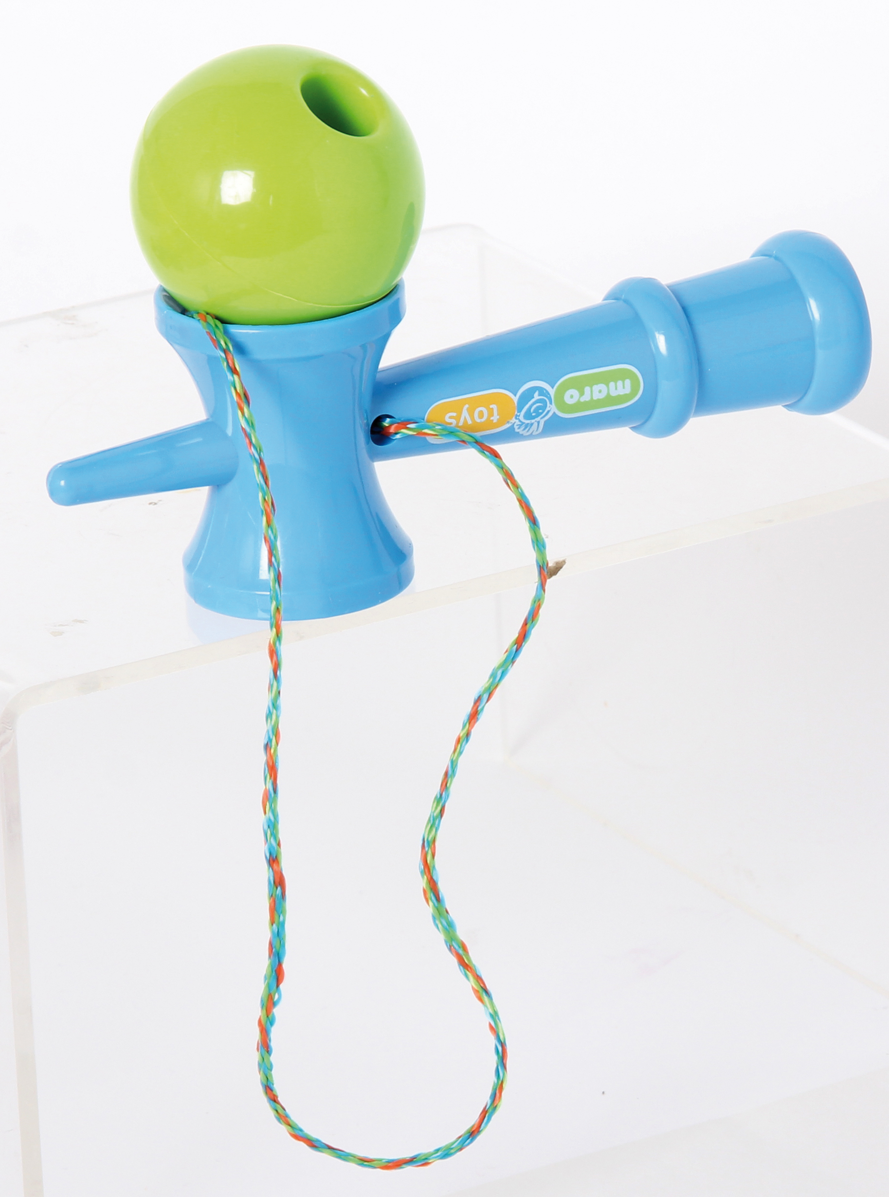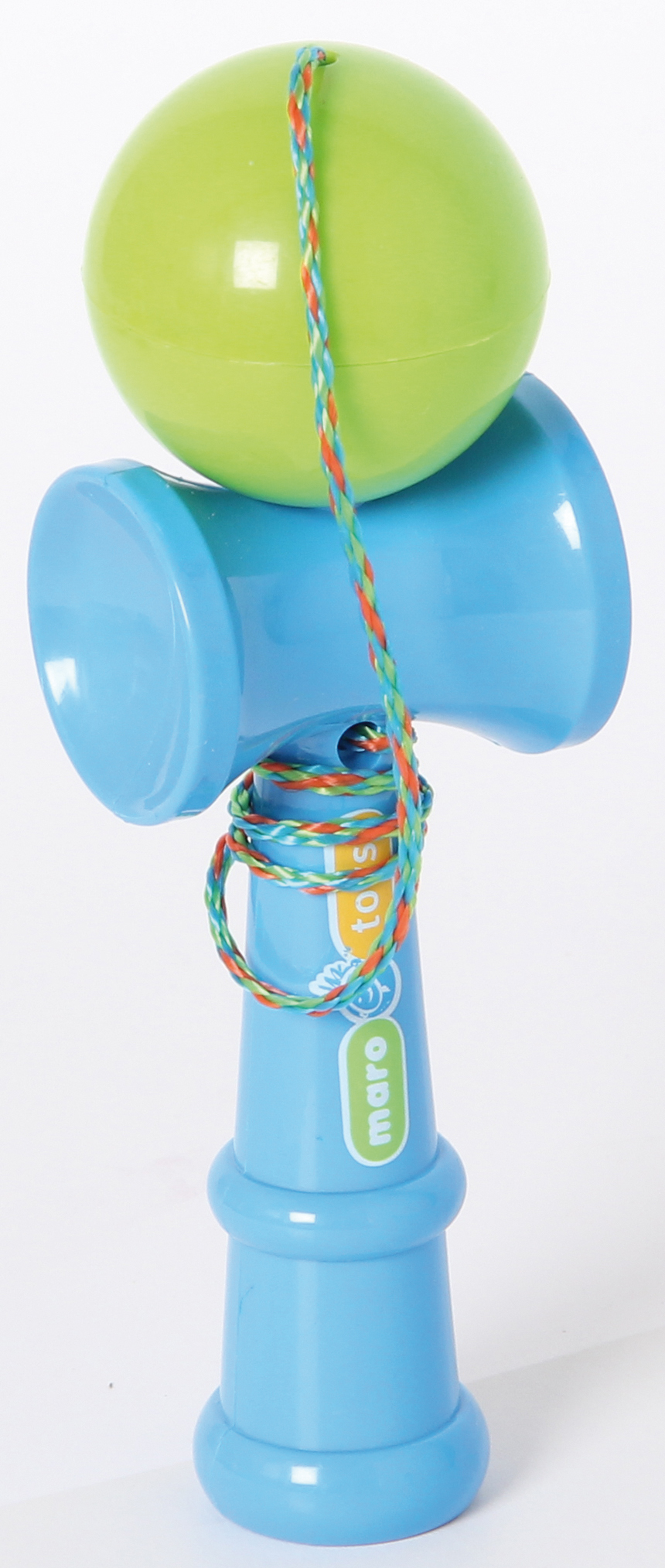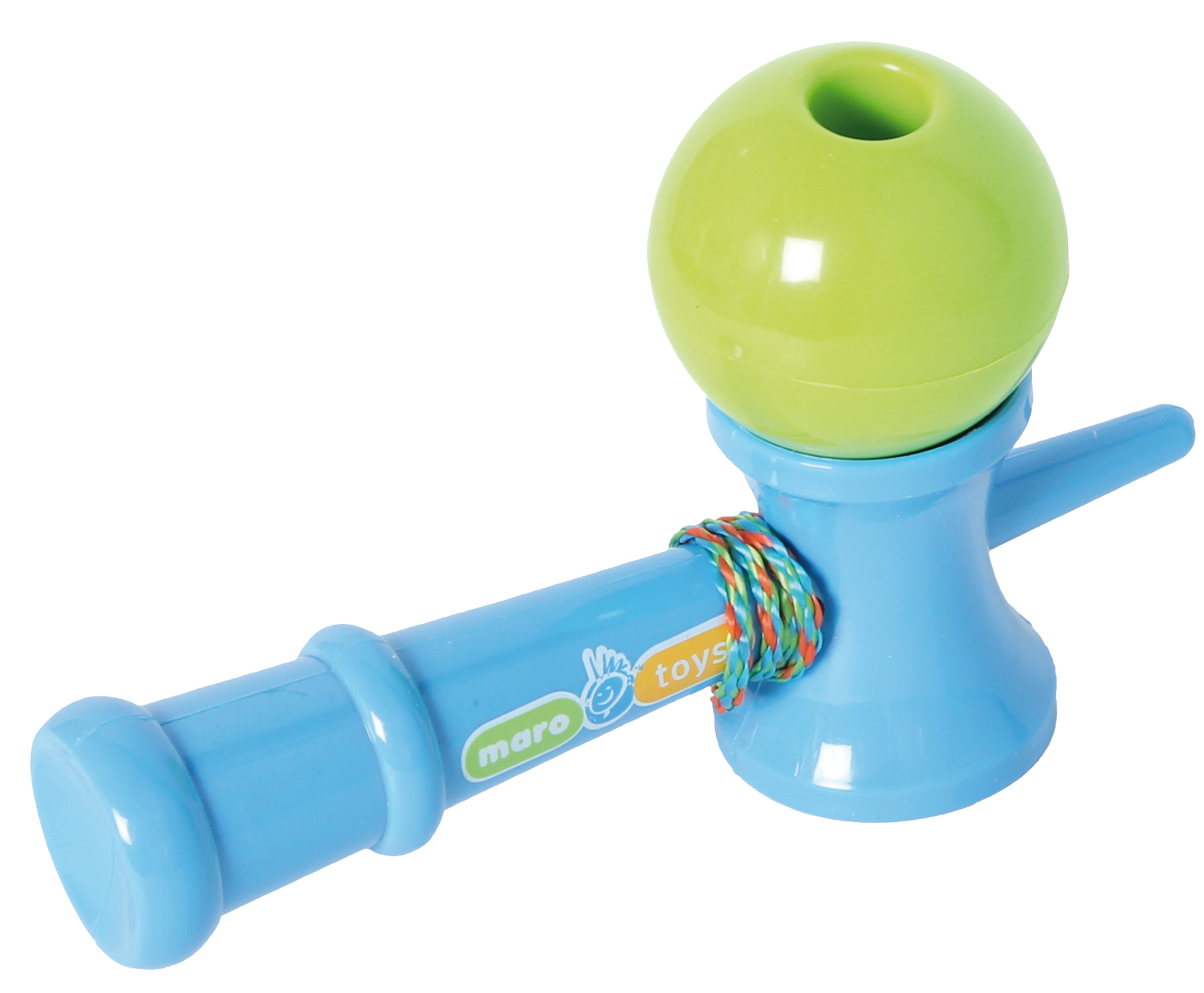Die Kugel ist mit einer Schnur mit dem Griff verbunden. Es gilt, den Ball zu fangen. Dazu hat der Griff an den Seiten verschiedene Vertiefungen und einen Stift. In drei Farbkombinationen sortiert. Aus Kunststoff.