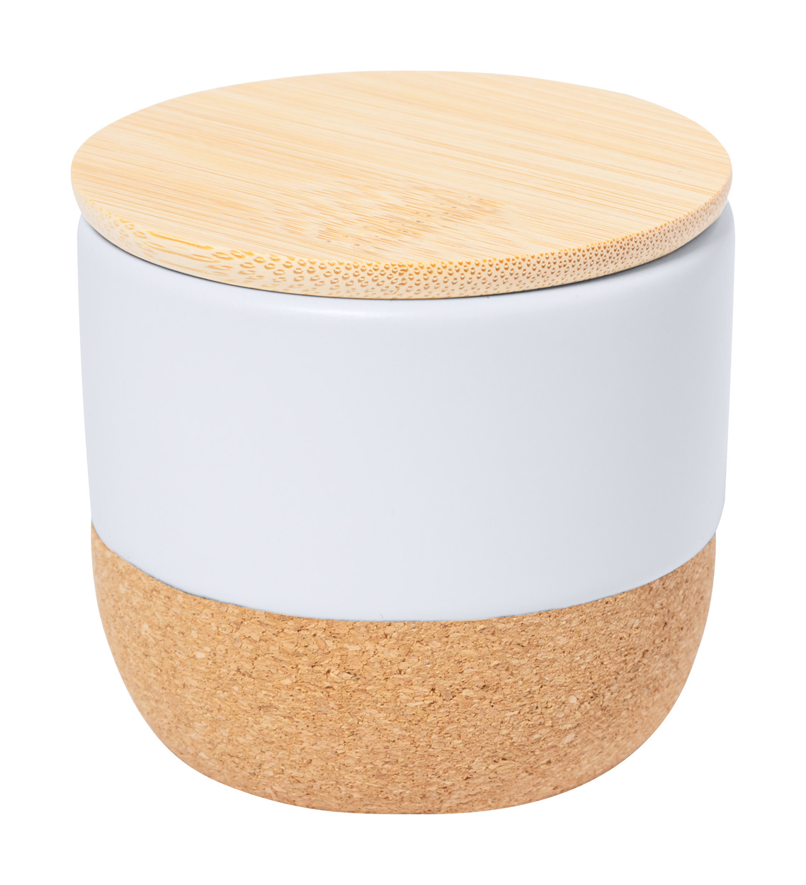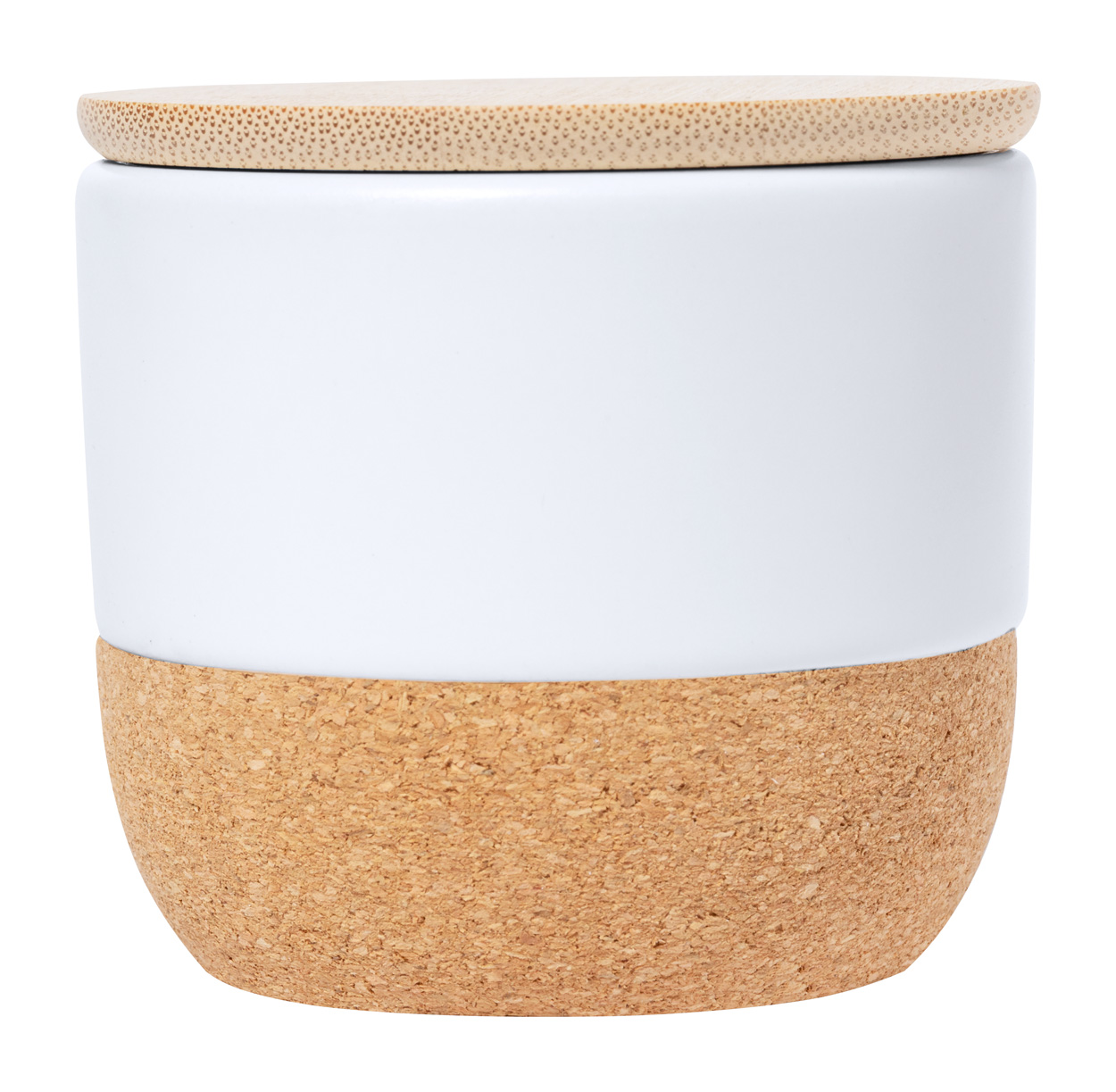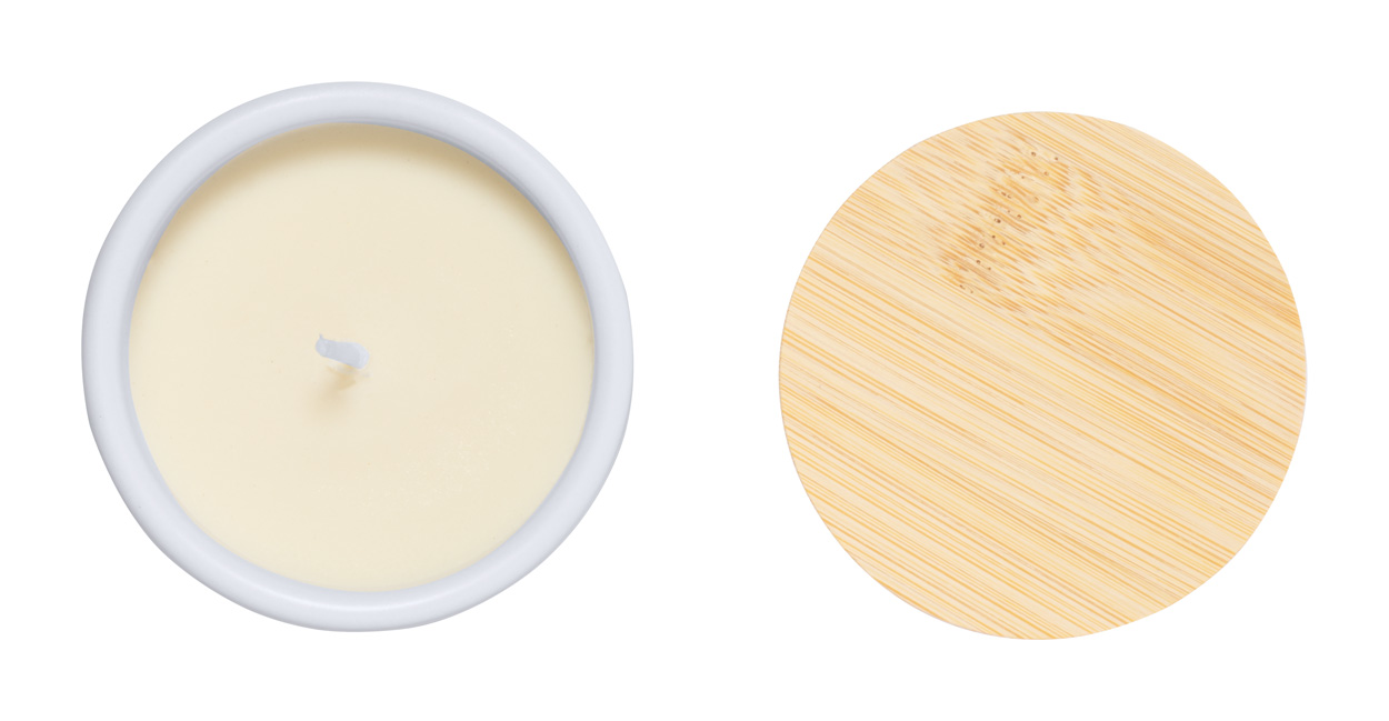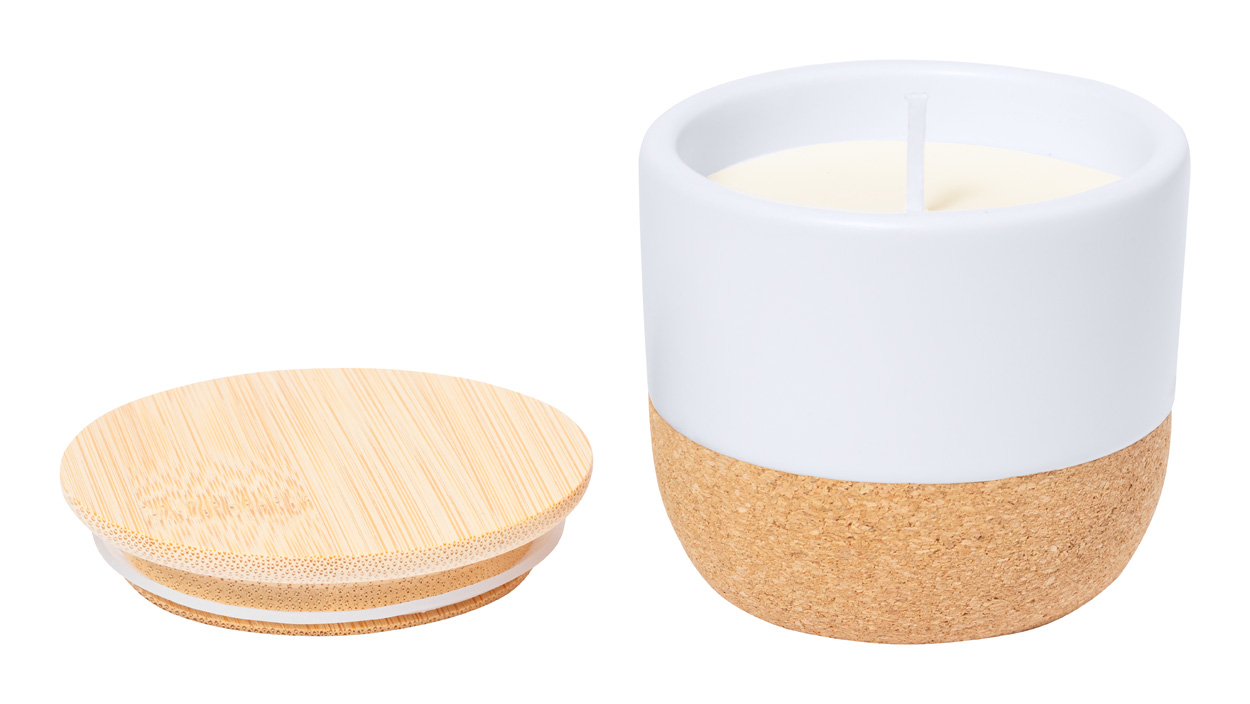 Pflanzliche Wachskerze mit Vanilleduft in einem Keramikhalter mit Naturkorkboden und Bambusdeckel.