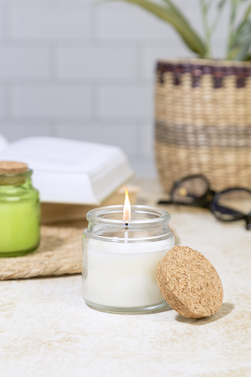 Vanille-Duftkerze aus pfanzenbasiertem Wachs im Glas mit Deckel aus natürlichem Kork. Mit 80 Gramm Wachs, Brenndauer: 16 Stunden. Verpackt in Kraftpapierbox.