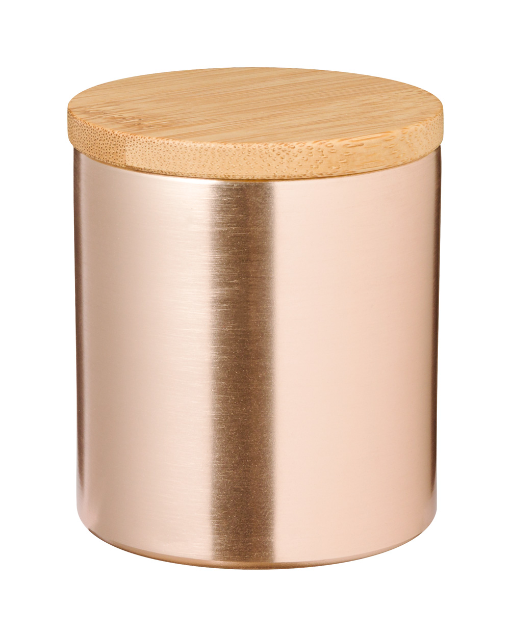 Vanille-Duftkerze in Behälter aus Aluminium mit Bambusdeckel.