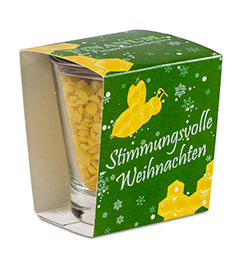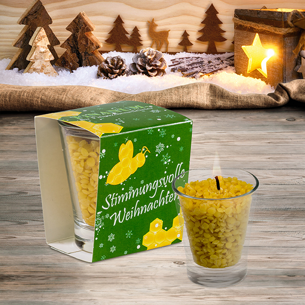 Bienen produzieren mit viel Fleiß dieses natürliche Wachs, welches danach vom Imker mit Liebe gewonnen wird. Brennt die Kerze, entsteht ein gemütliches Licht und es duftet herrlich. Geliefert wird das hochwertige Bienenwachs-Granulat - Made in Germany - mit einem Docht in einem edlen Glas, welches nach dem Abbrennen ganz sicher eine weitere Verwendung findet. Verpackt mit einer individuell gestaltbaren Banderole, bleibt für die Werbebotschaft viel Platz. Restbestand: verfügbar bis 1.300 Stück - weitere Mengen auf Anfrage!