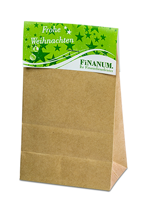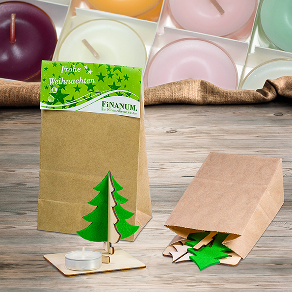 Der Kerzenständer mit Tannenbaum und Teelicht, ist eine Anlehnung an unsere beliebten Steckfiguren aus Filz und Holz. Der Kunde kann seine eigene kleine Weihnachtswelt auf dem Schreibtisch oder Fenstersims basteln und ins rechte Licht setzen. Verpackt in einer braunen Kraftpapier-Tüte, bietet das Präsent mit dem gestaltbaren Werbereiter ausreichend Platz für die individuelle Werbebotschaft. Ein Teelicht ist im Lieferumfang enthalten. Eine Lasergravur auf dem Sockel bietet eine nachhaltige Werbebotschaft.
