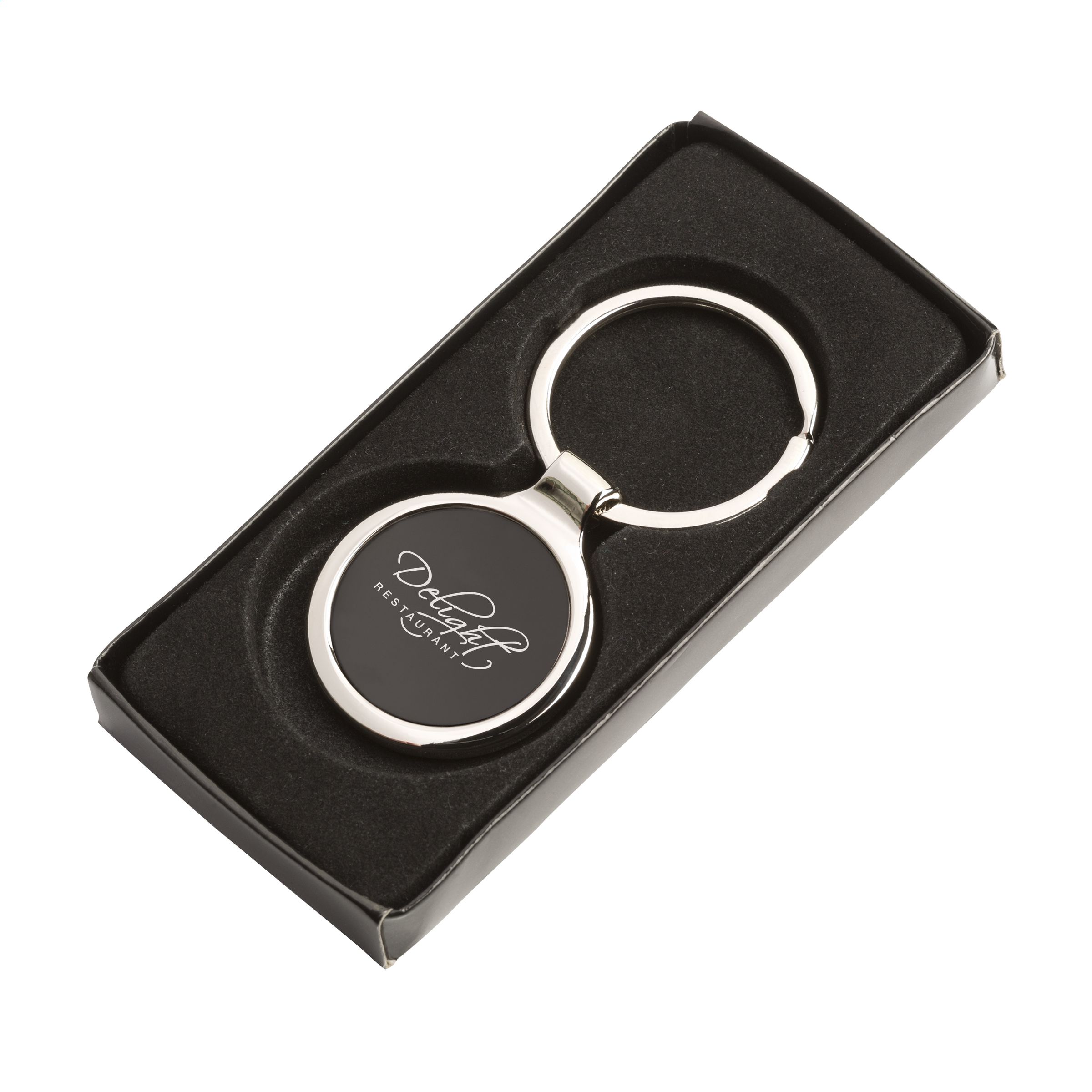 Runder, hochglänzender Schlüsselanhänger aus Nickel mit schwarzem Metall-Inlay und festem Schlüsselring. Schick und exklusiv. Wird einzeln in einem Umschlag aus Kraftpapier geliefert.