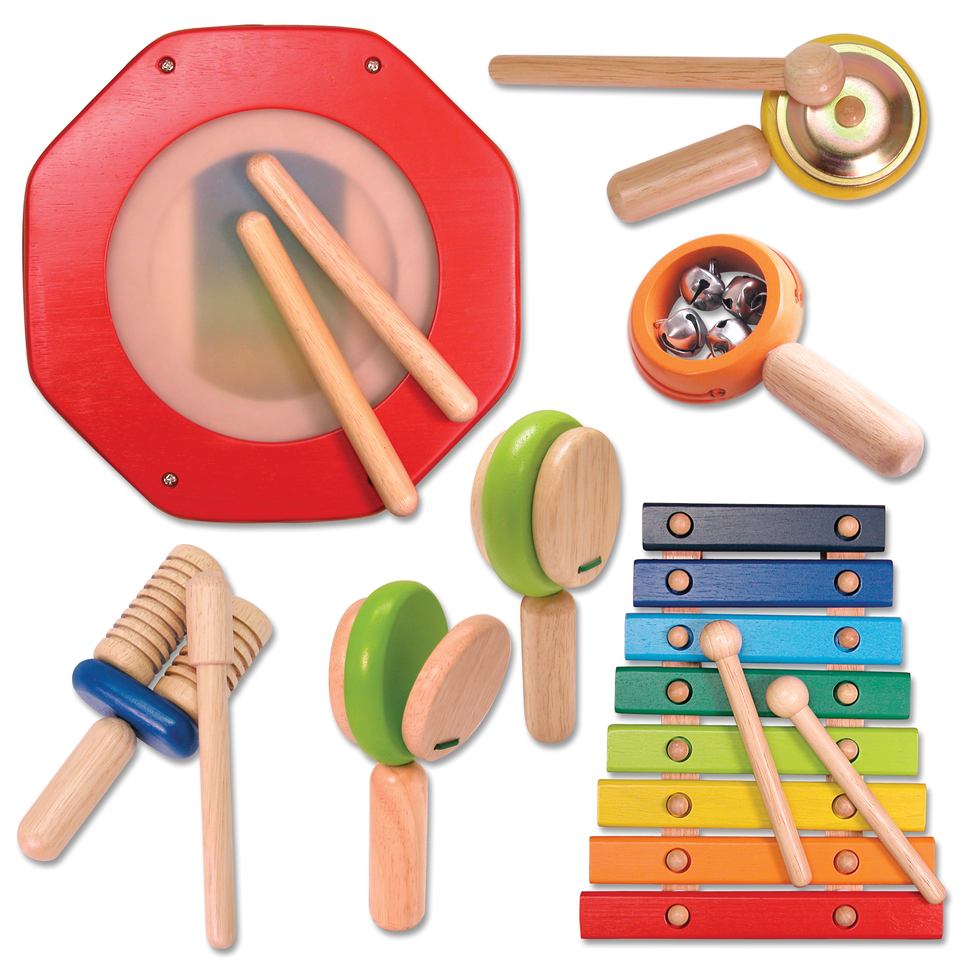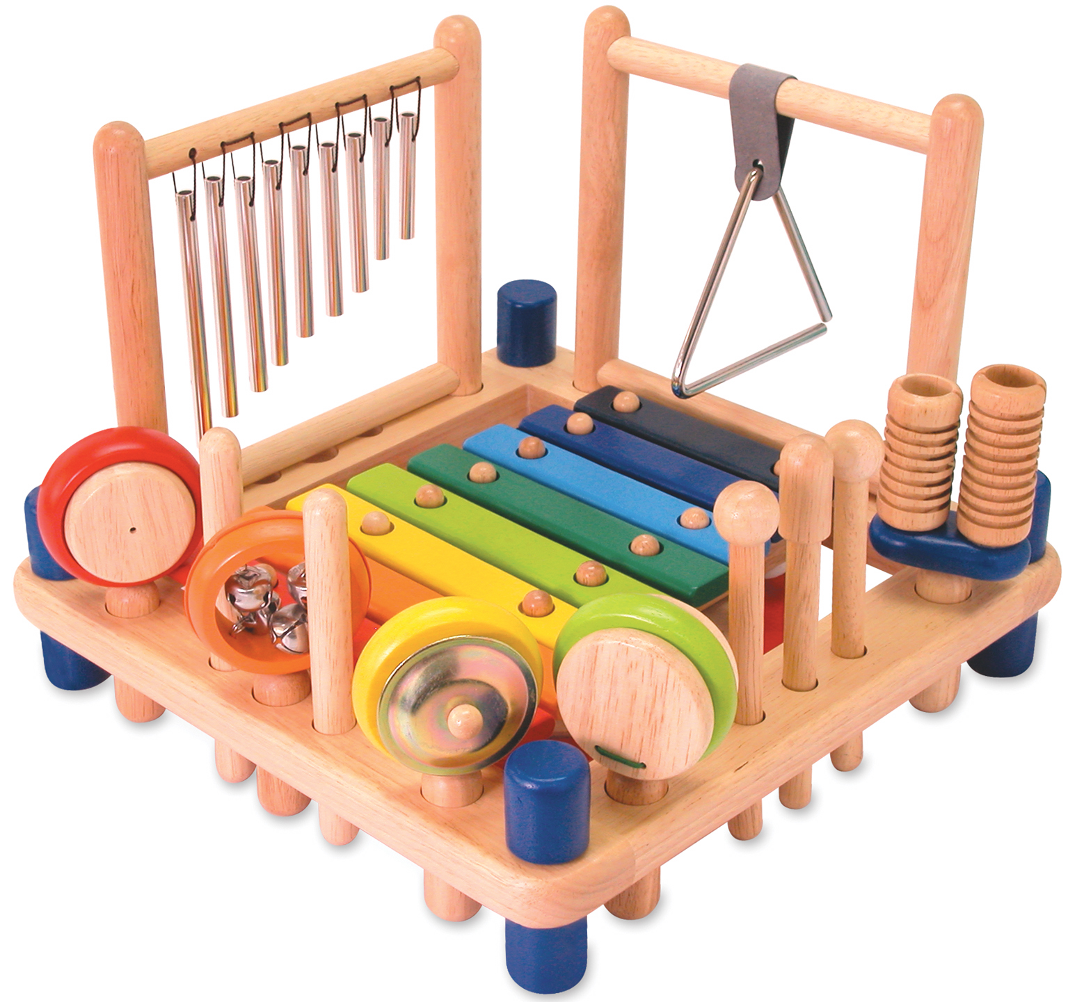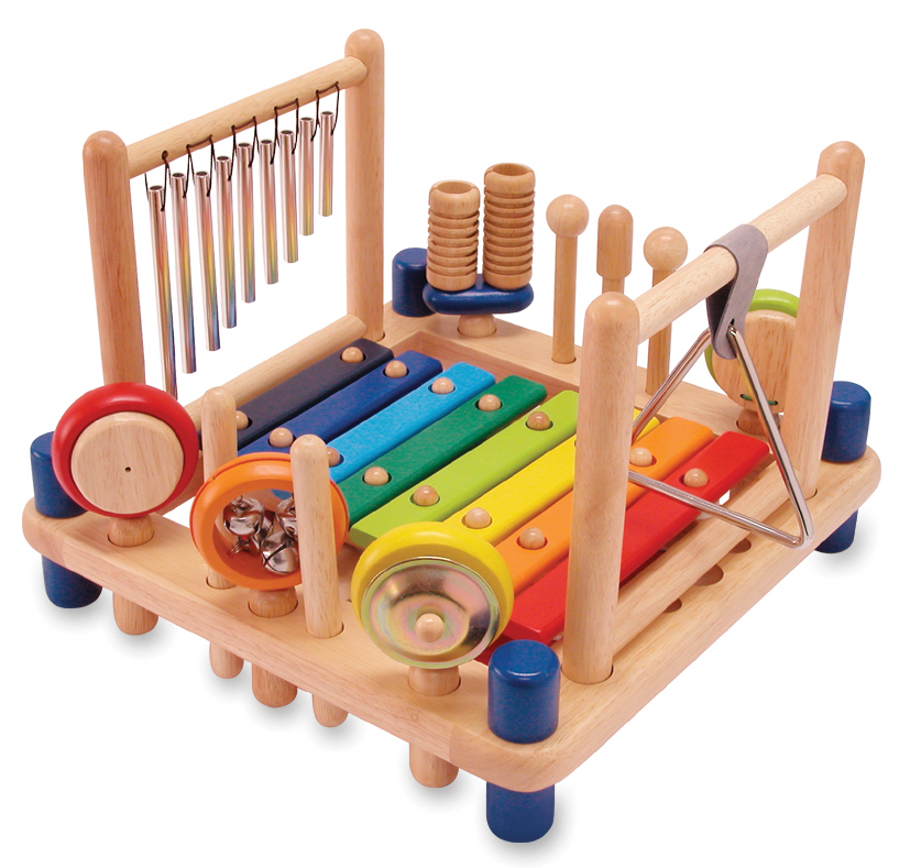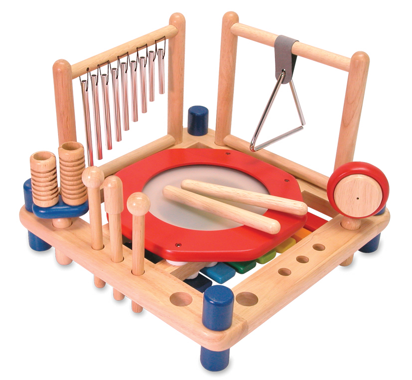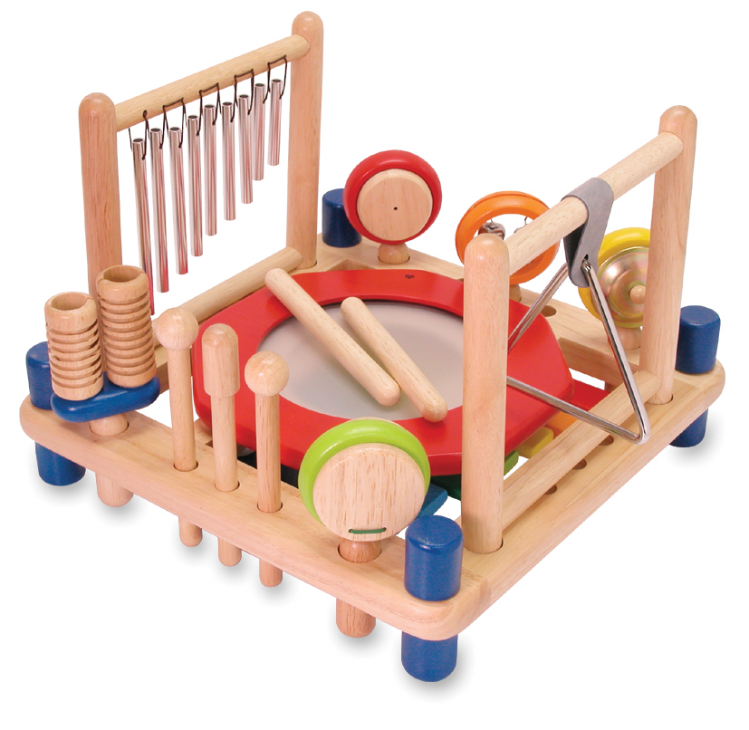 Die Spielstation aus Holz präsentiert zehn Musikinstrumenten: Xylophon, Trommel, Klangspiel, Triangel, Mini-Zimbel, Glocken, Marracas, Kastagnetten, Schellenkranz, ein paar Rhythmusstäbe, zwei Schläger und ein Scraper. Ab 3 Jahren.