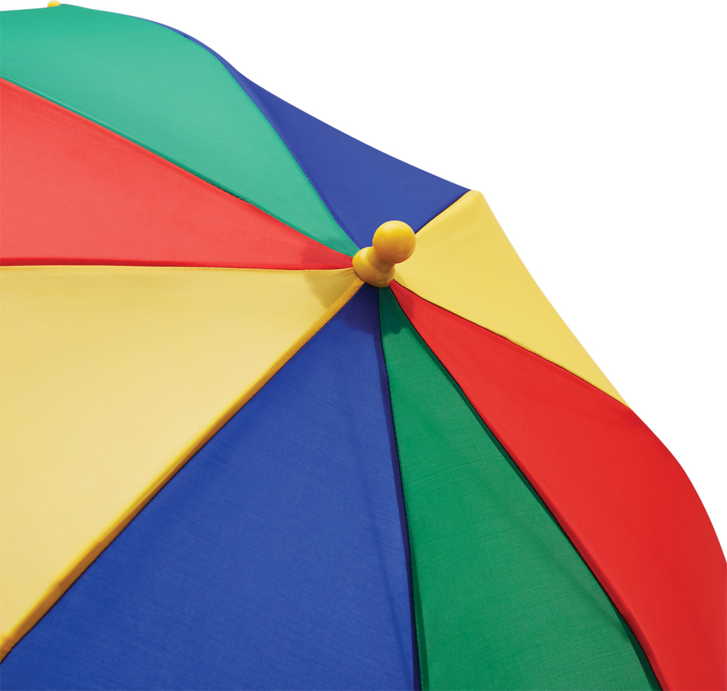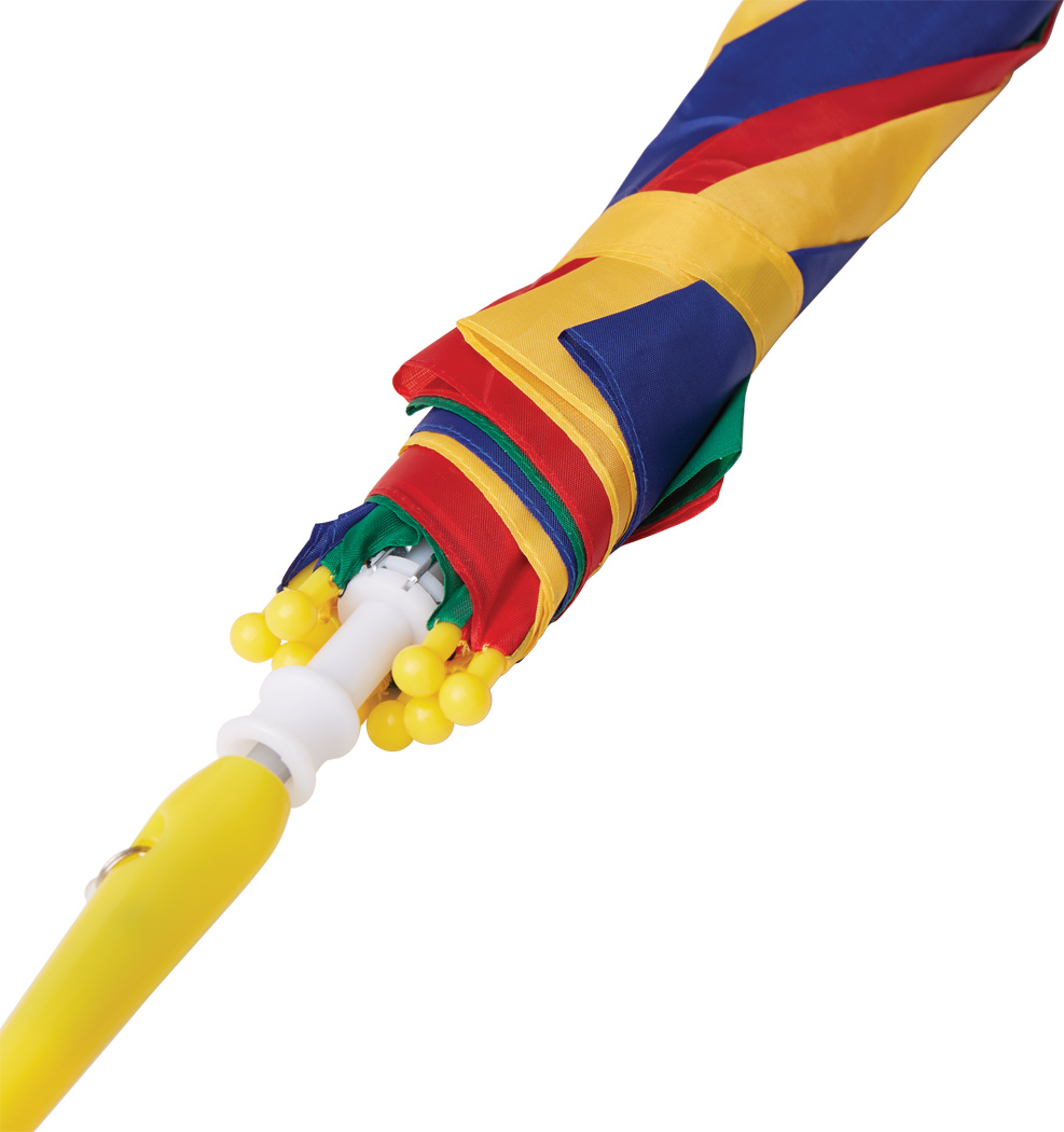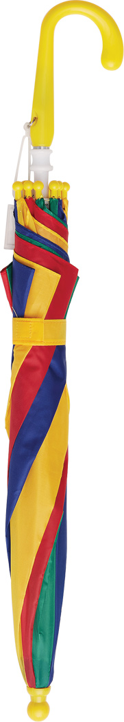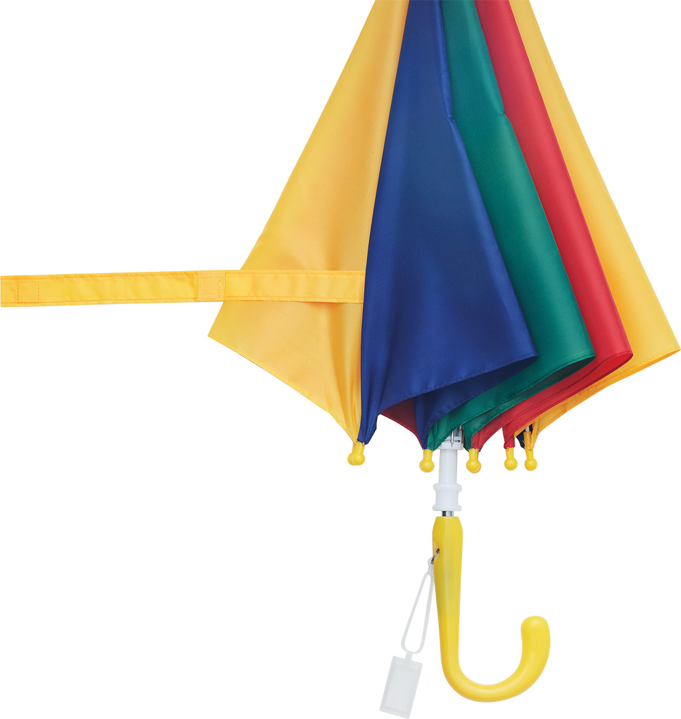Kinderschirm LOLLIPOP mit Sicherheitsöffnung: Metallstock und Fiberglasspeichen, Kunststofftips und -Rundhakengriff, Polyester-Bespannung, Schließband mit Klettverschluss