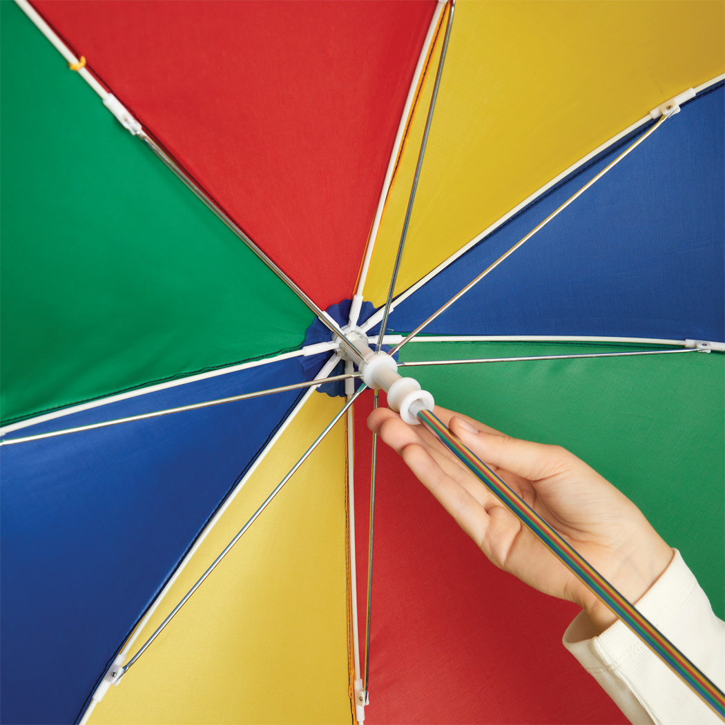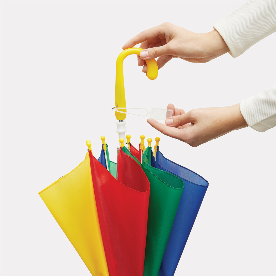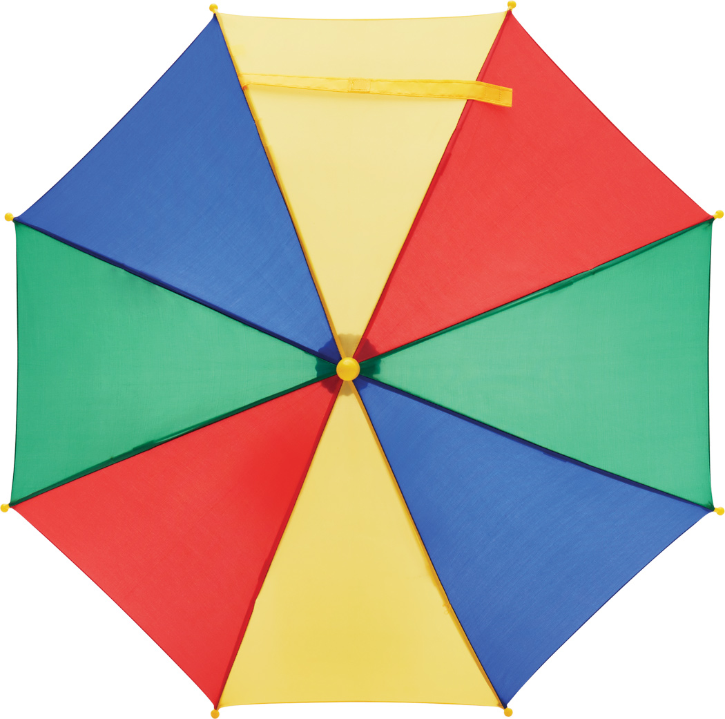 Kinderschirm LOLLIPOP mit Sicherheitsöffnung: Metallstock und Fiberglasspeichen, Kunststofftips und -Rundhakengriff, Polyester-Bespannung, Schließband mit Klettverschluss