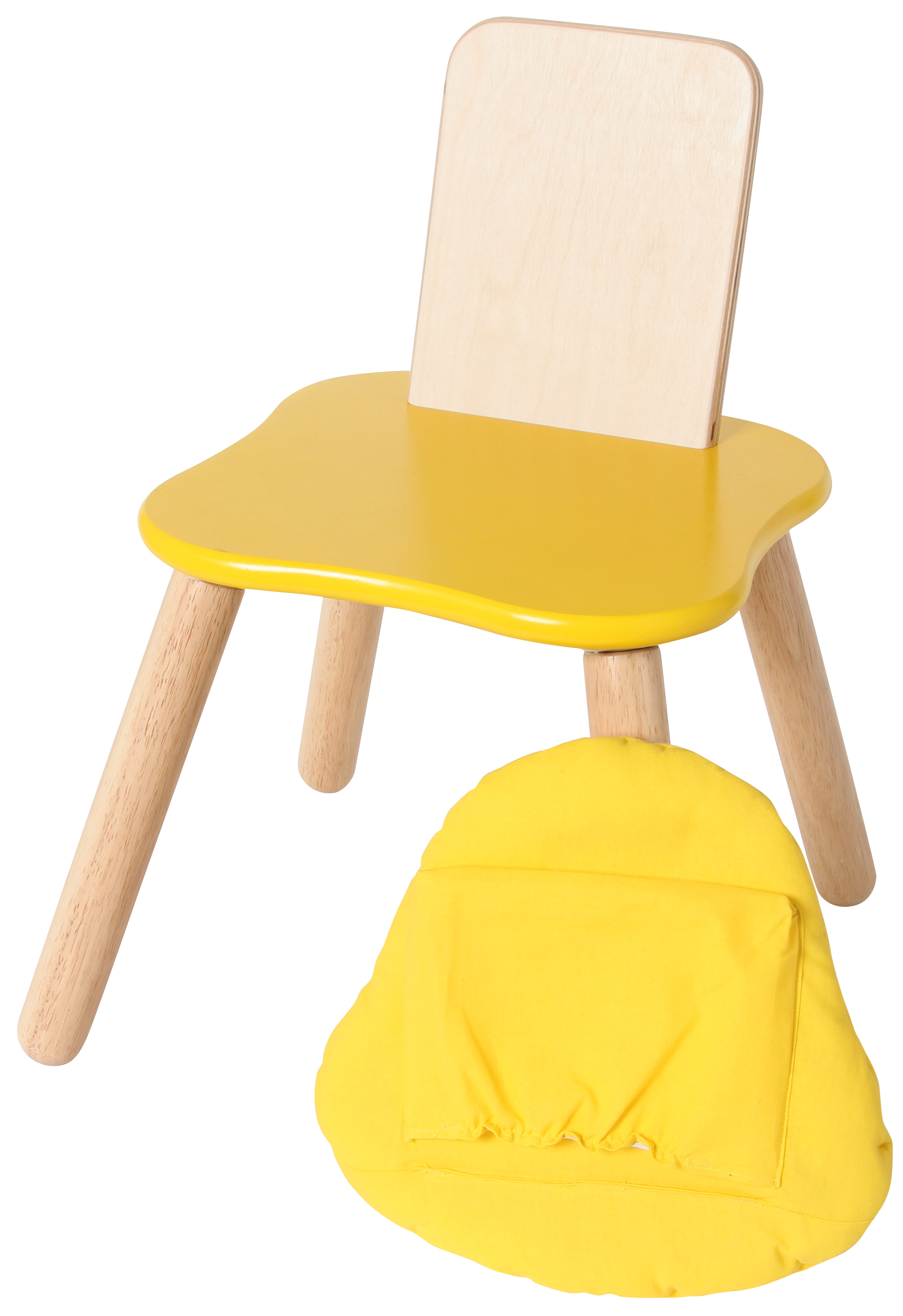 Massiver Holzstuhl mit abgerundeten Ecken und Kanten. Das weiche Kissen der Rückenlehne ist abnehm- und waschbar. Stuhlhöhe: 46 cm. Sitzhöhe: 28 cm.