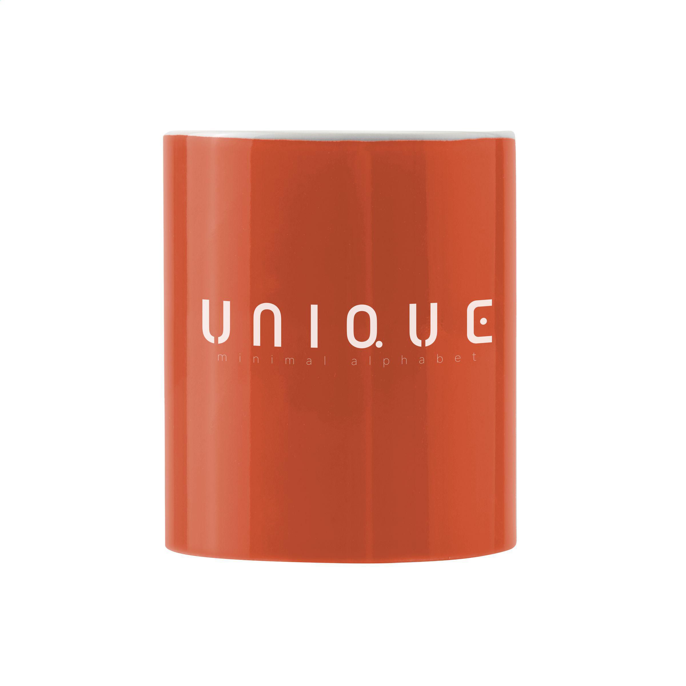 Becher aus hochwertiger Keramik. Komplett in weiß oder mit farbiger Außenseite. Spülmaschinengeeignet. Der Aufdruck ist spülmaschinengeprüft und nach EN 12875-2 zertifiziert. Fassungsvermögen 350 ml.