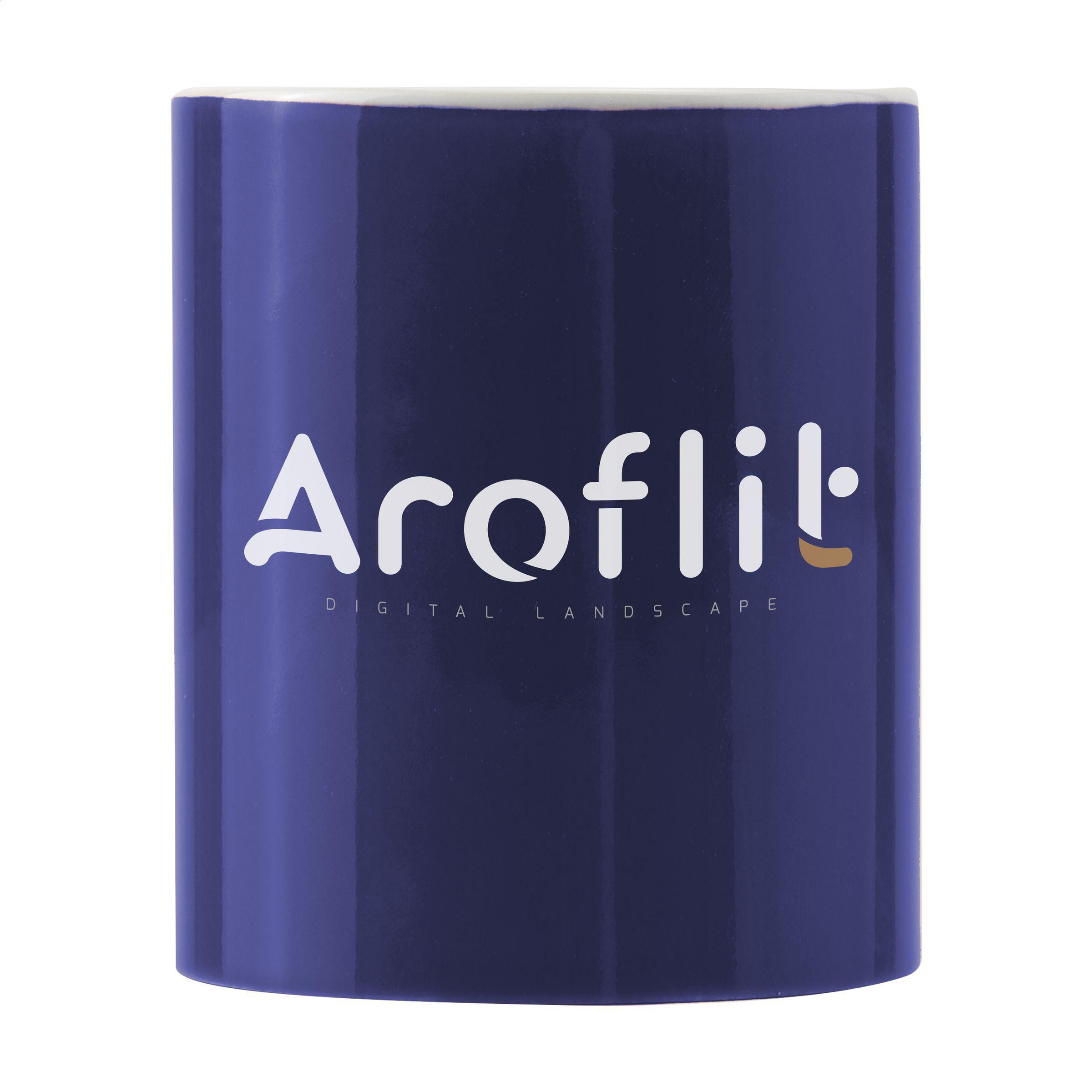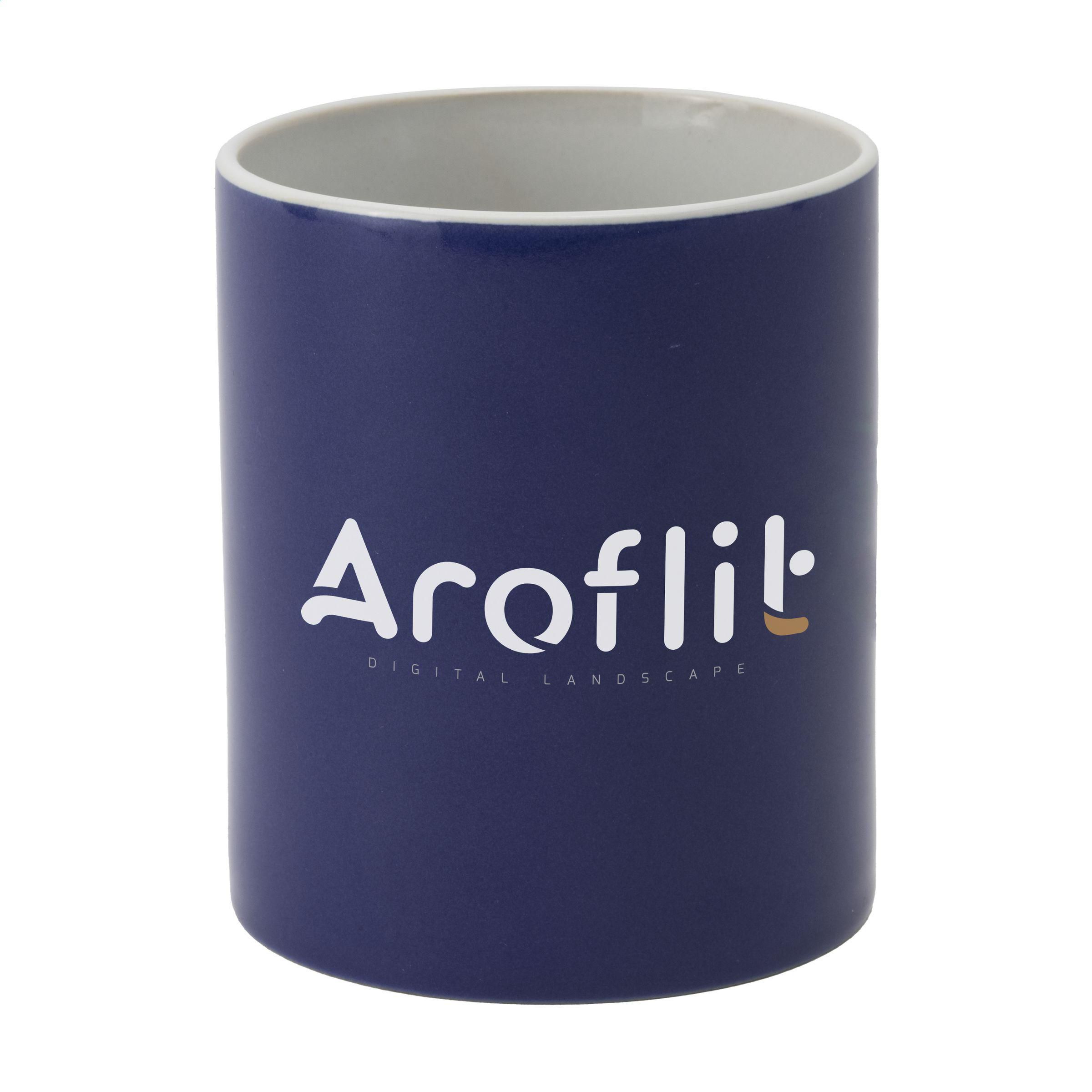 Becher aus hochwertiger Keramik. Komplett in weiß oder mit farbiger Außenseite. Spülmaschinengeeignet. Der Aufdruck ist spülmaschinengeprüft und nach EN 12875-2 zertifiziert. Fassungsvermögen 350 ml.
