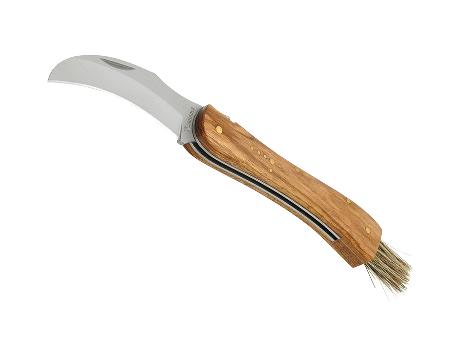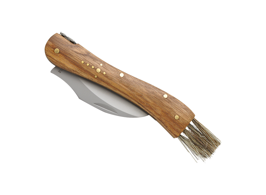 Klappbares Pilz Messer ‘Laguiole’. Geschwungene Klinge aus 420er Edelstahl. Griff aus exotischer Eschenholz. Wildschweinhaarbürste zur Säuberung der Pilze.