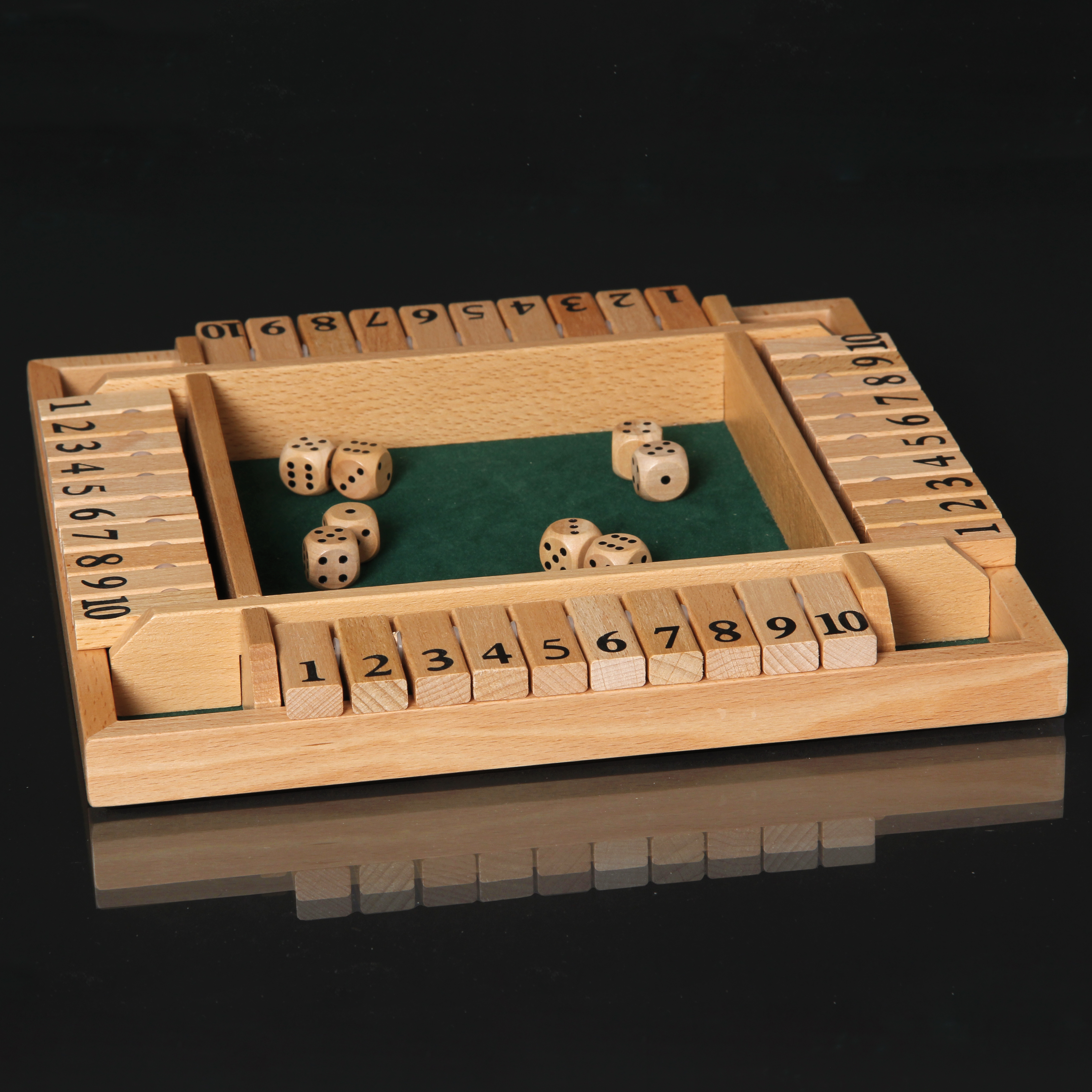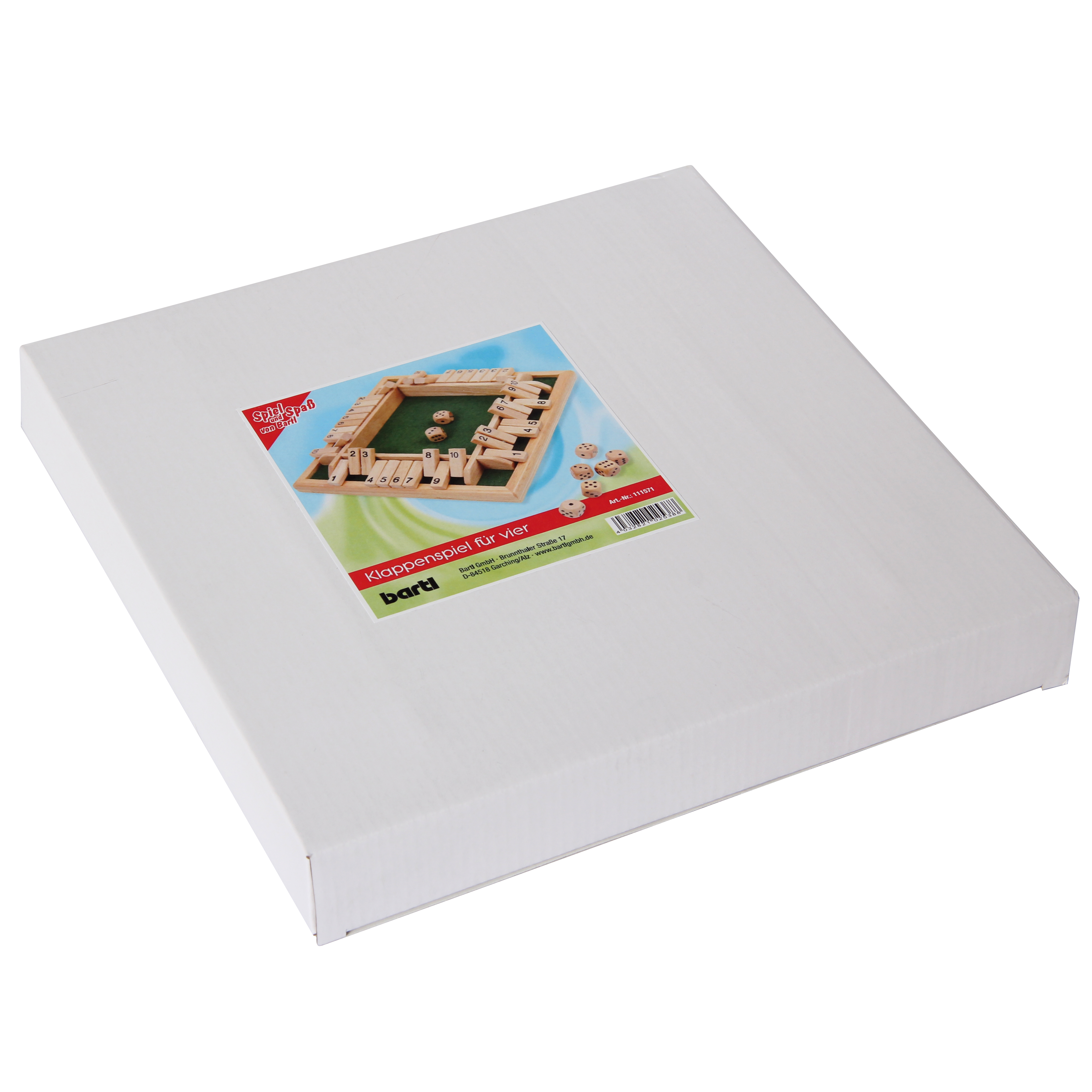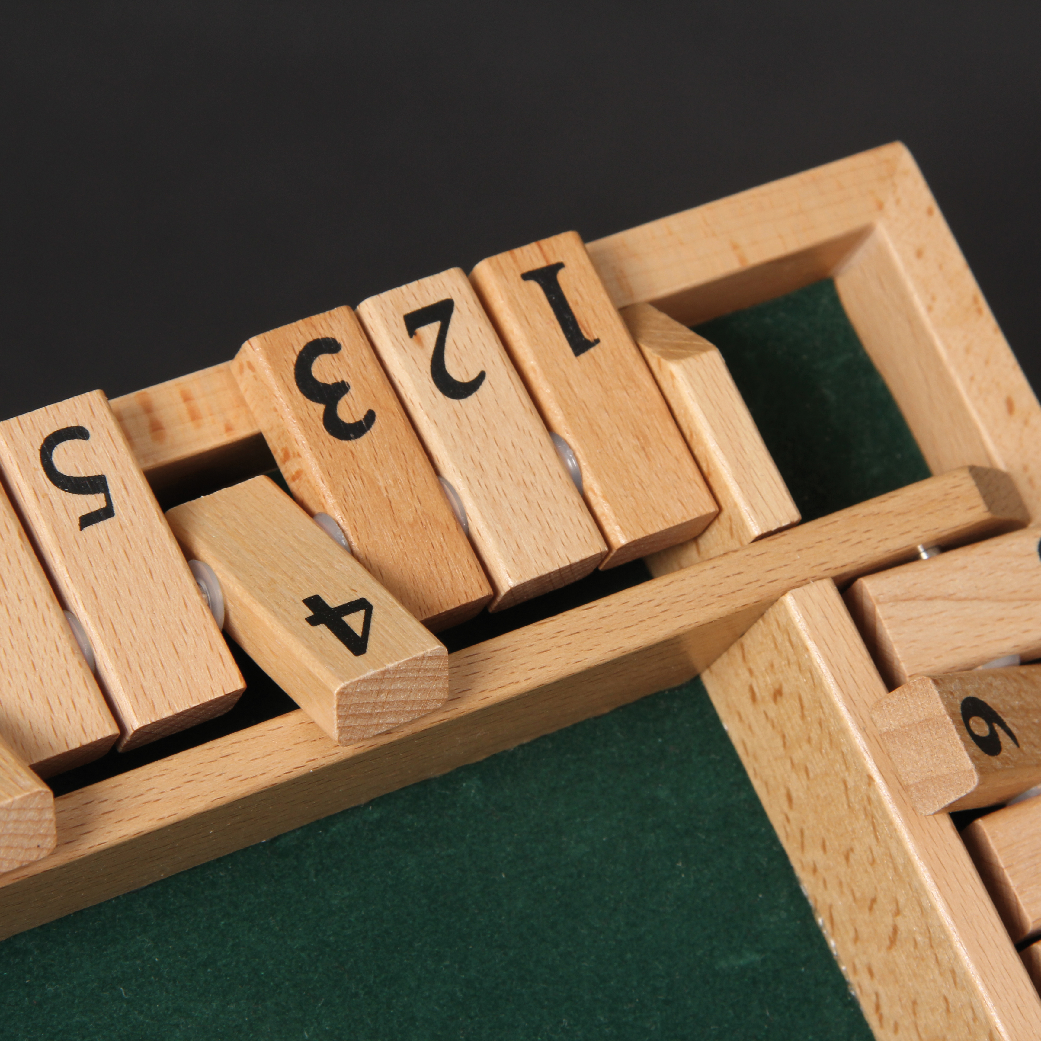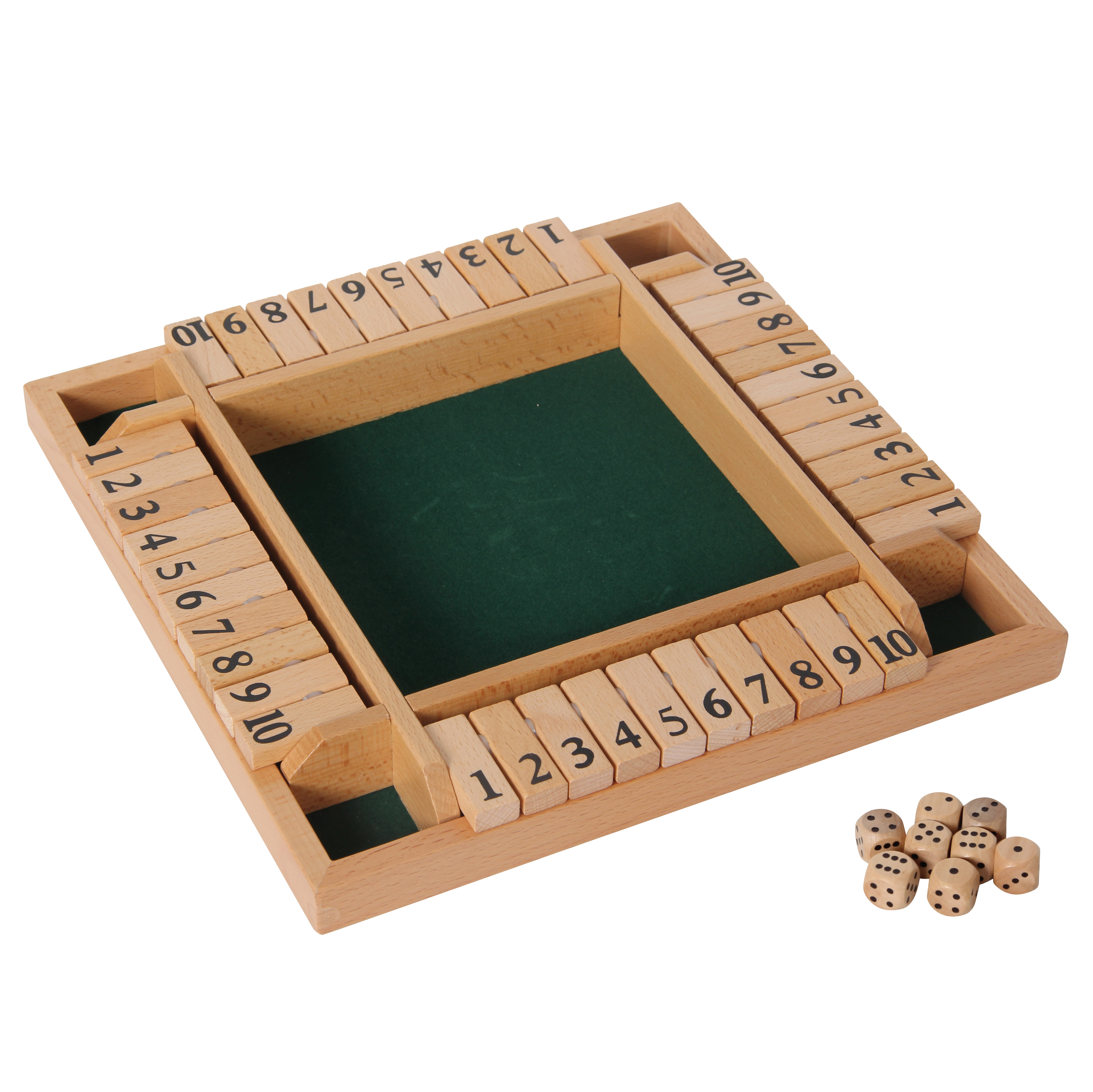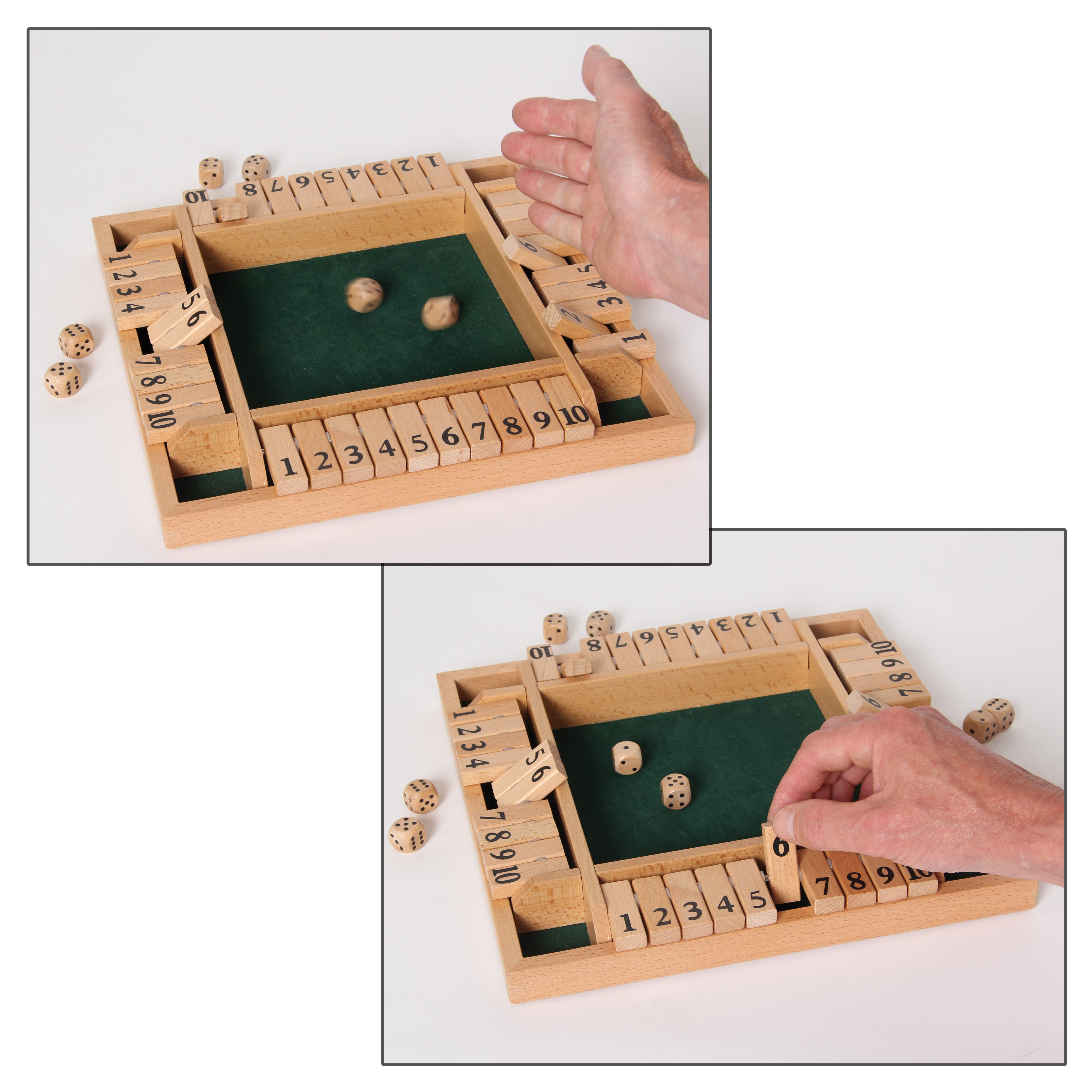 Ein lustiges Würfelspiel aus Holz für zwei bis vier Spieler. Es gilt, die passenden Klappen zu den gewürfelten Augen umzulegen, dafür dürfen diese auch addiert werden. Es können bis zu vier Spieler gleichzeitig spielen, wer als erster alle Klappen umgelegt hat, ist Sieger.