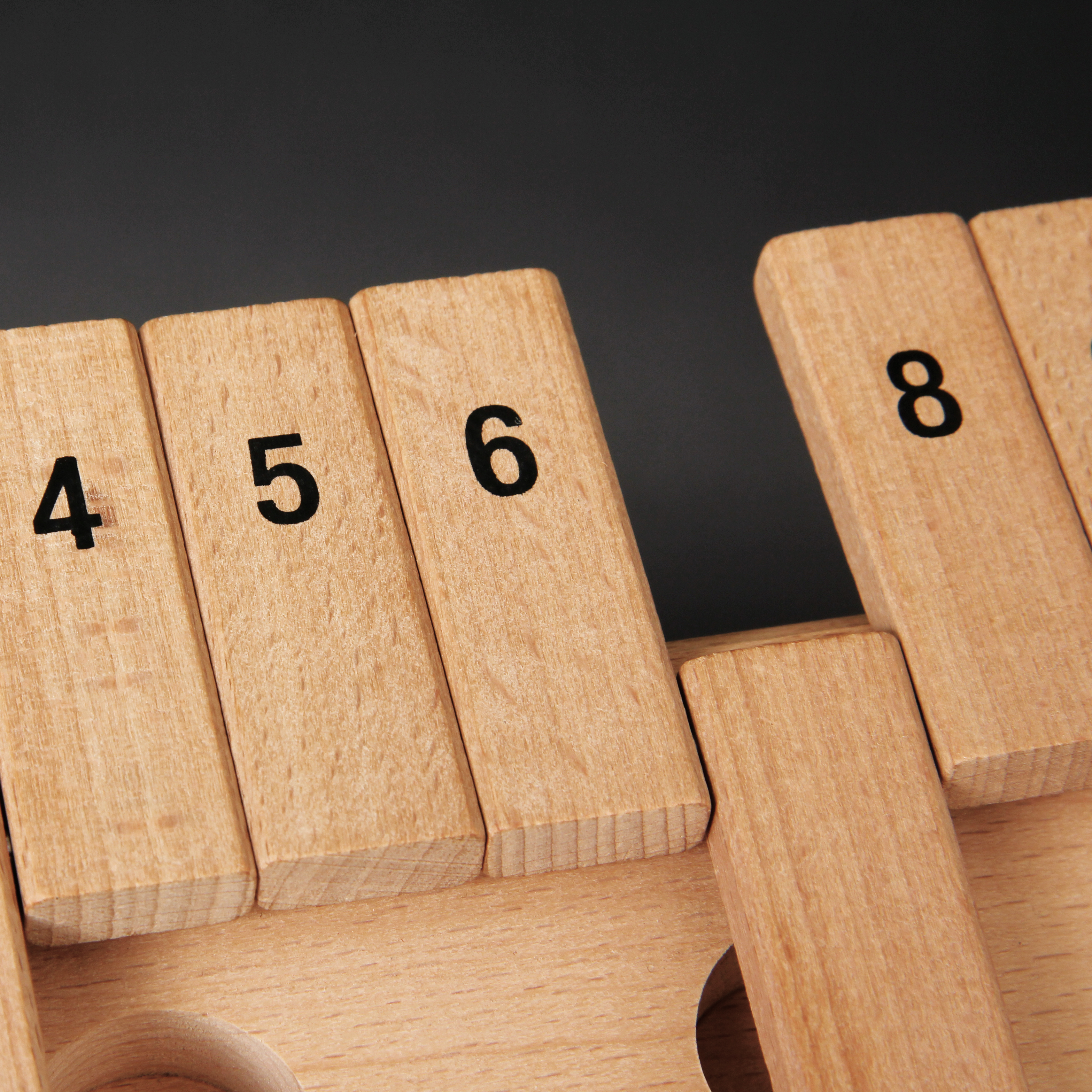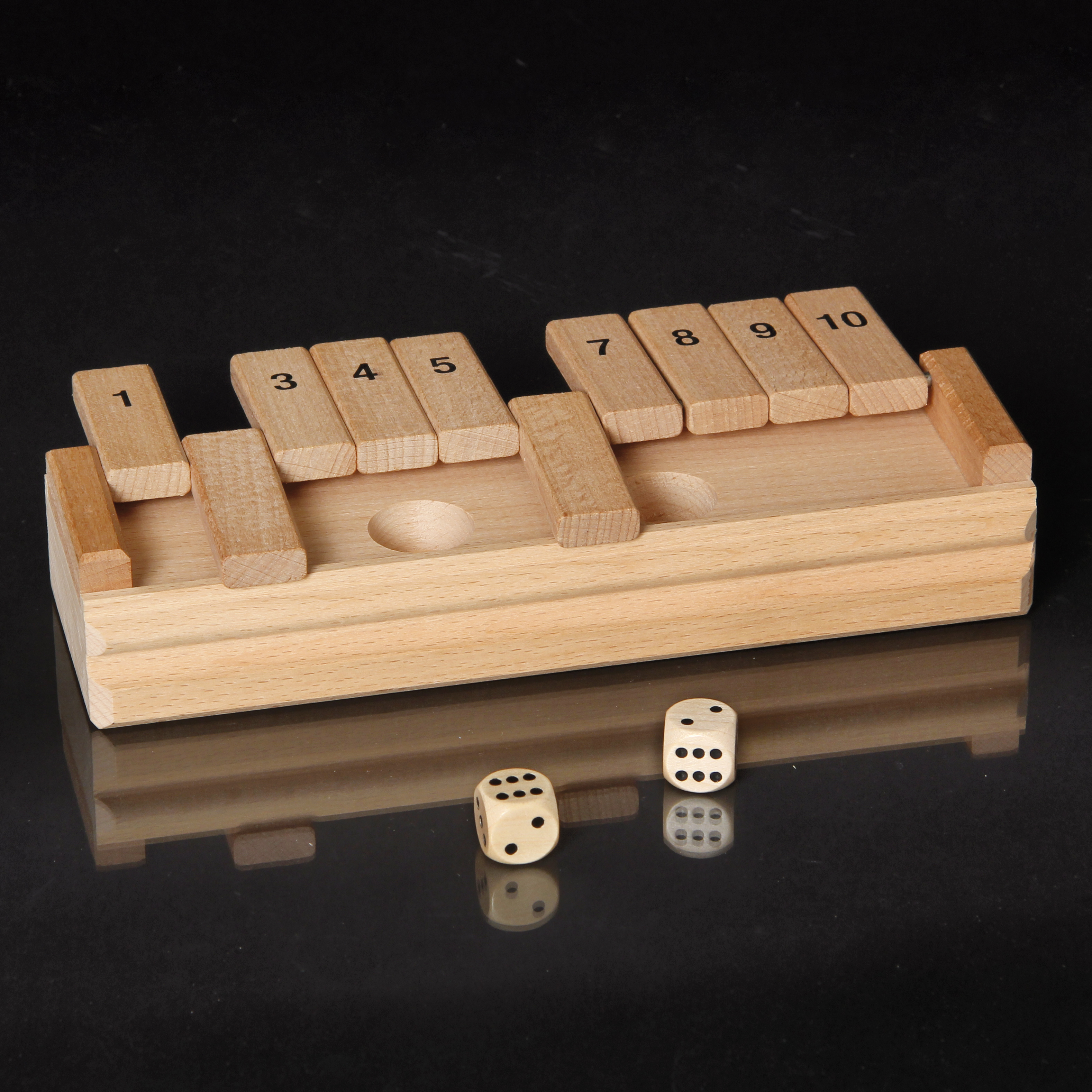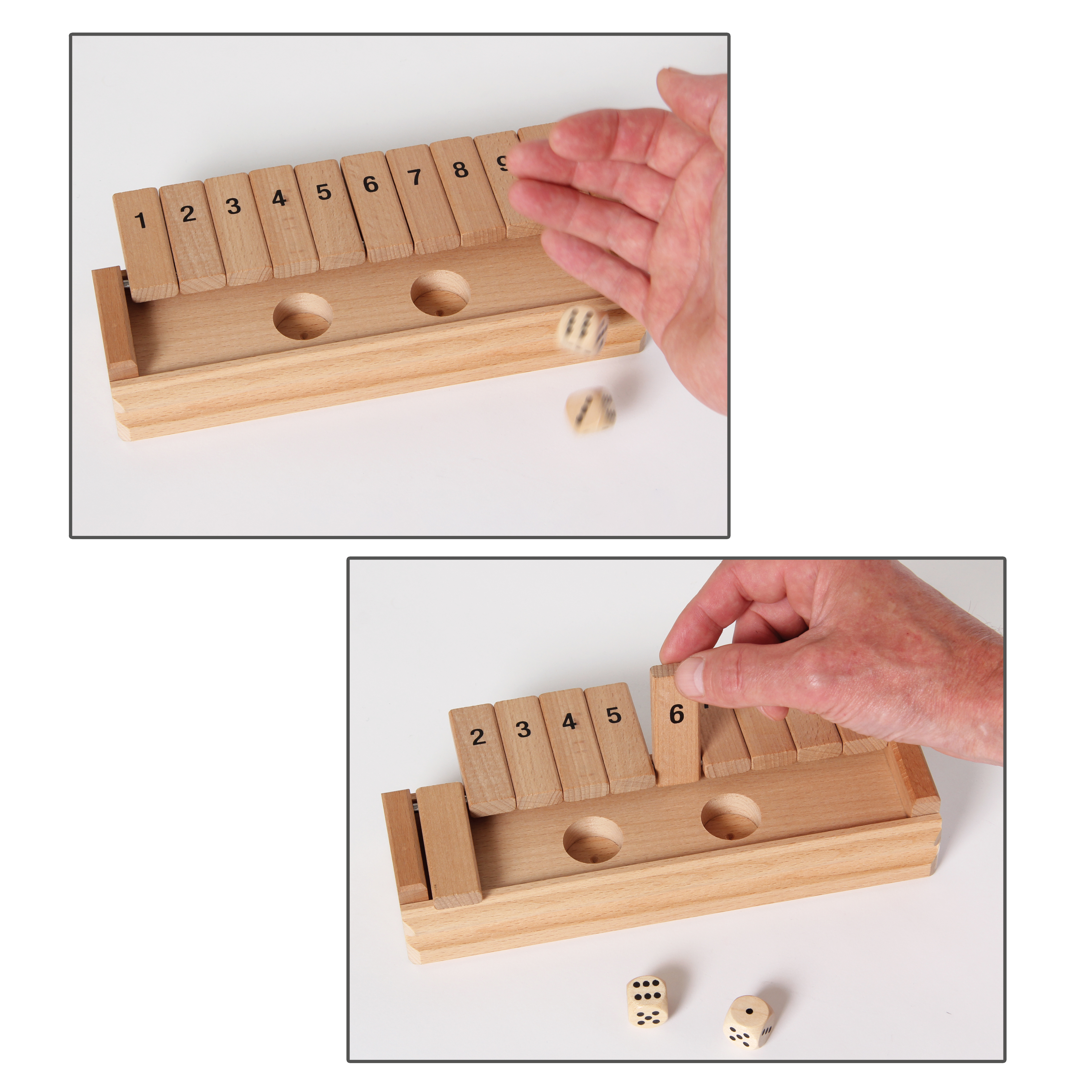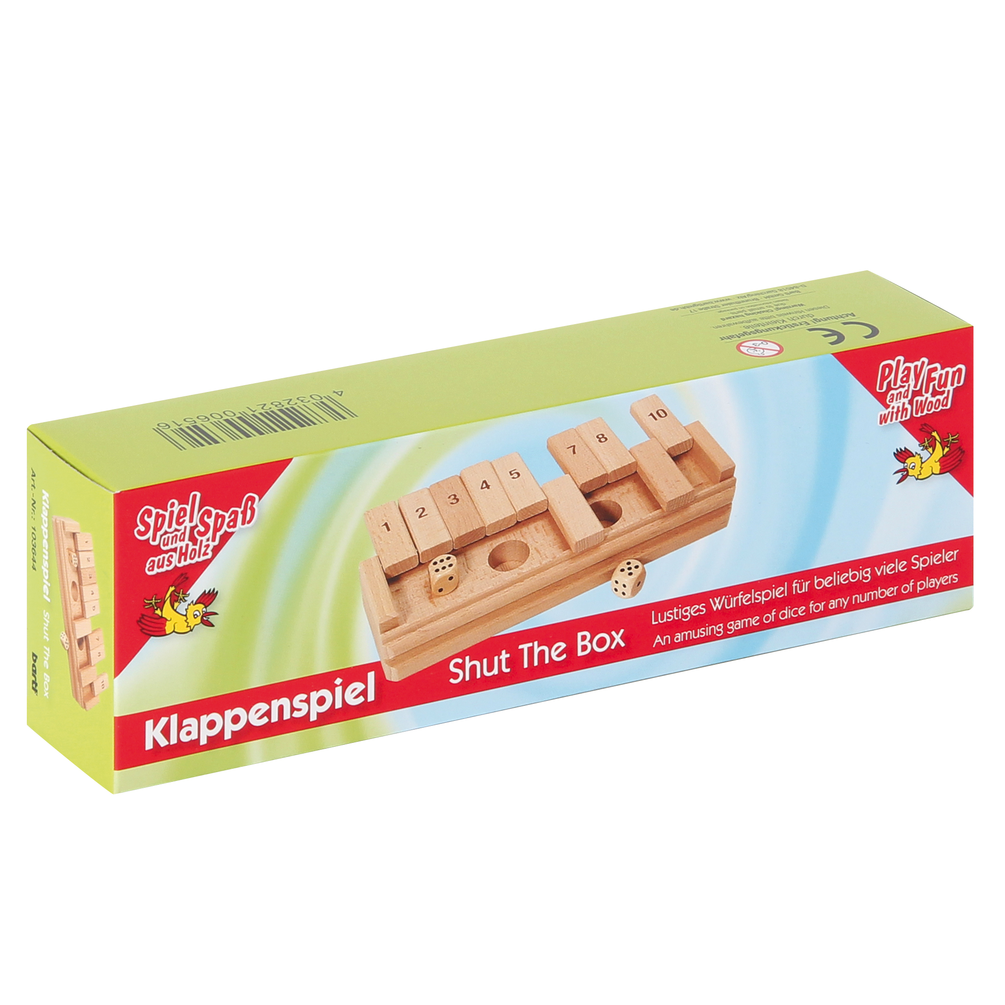 Exklusive Ausführung aus Holz. Mit zwei Würfeln. Der Würfelspiele-Klassiker für Klein & Groß! Entsprechend der gewürfelten Augenzahlen werden zwei Klappen oder eine Klappe mit der Augensumme umgeklappt. Wer nicht mehr klappen kann, verliert.