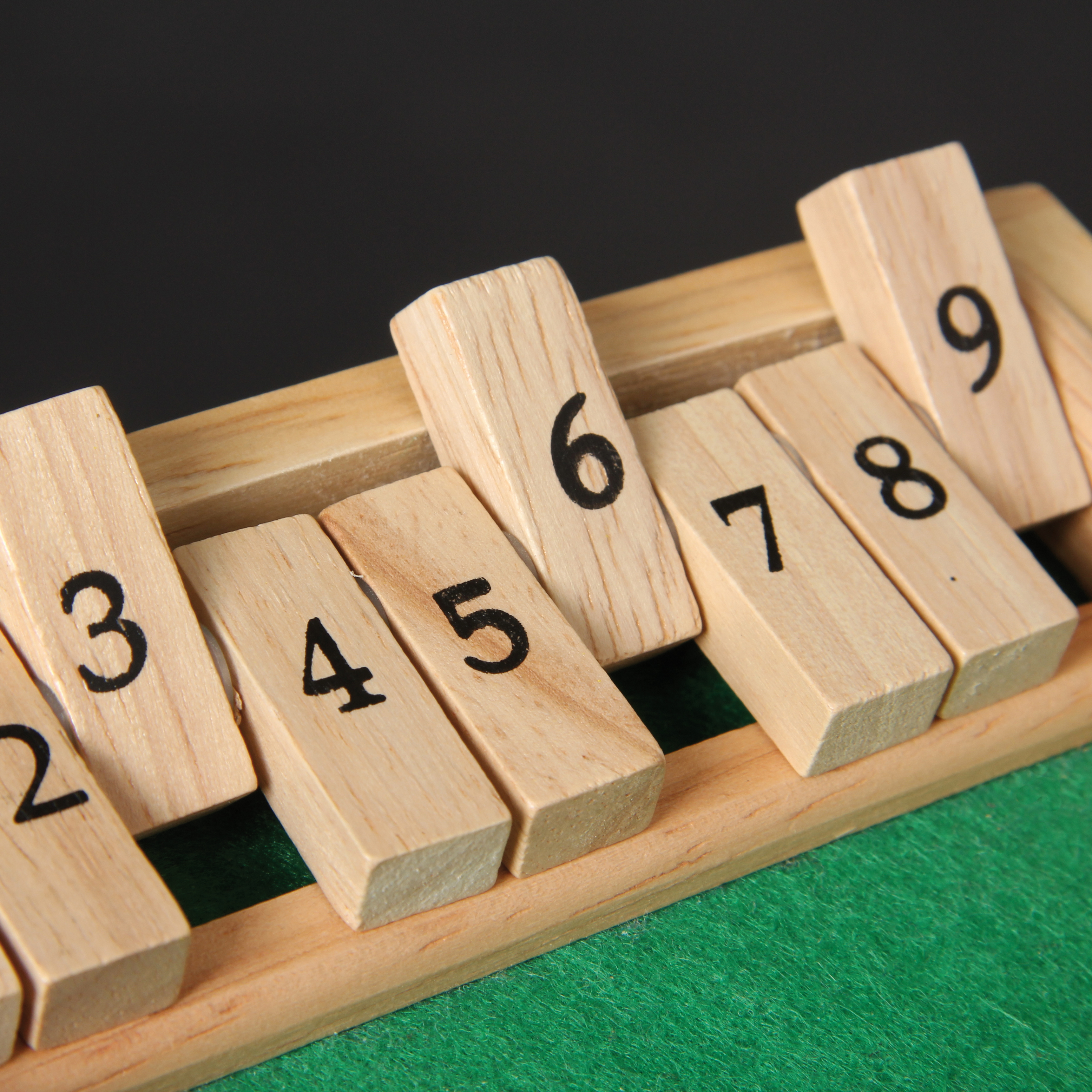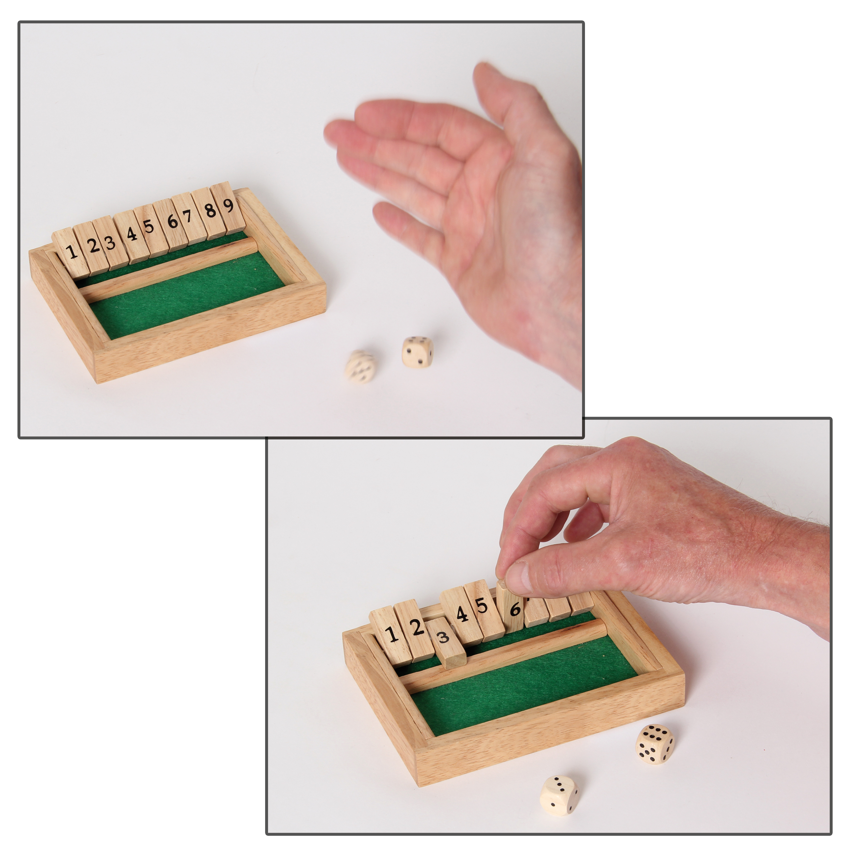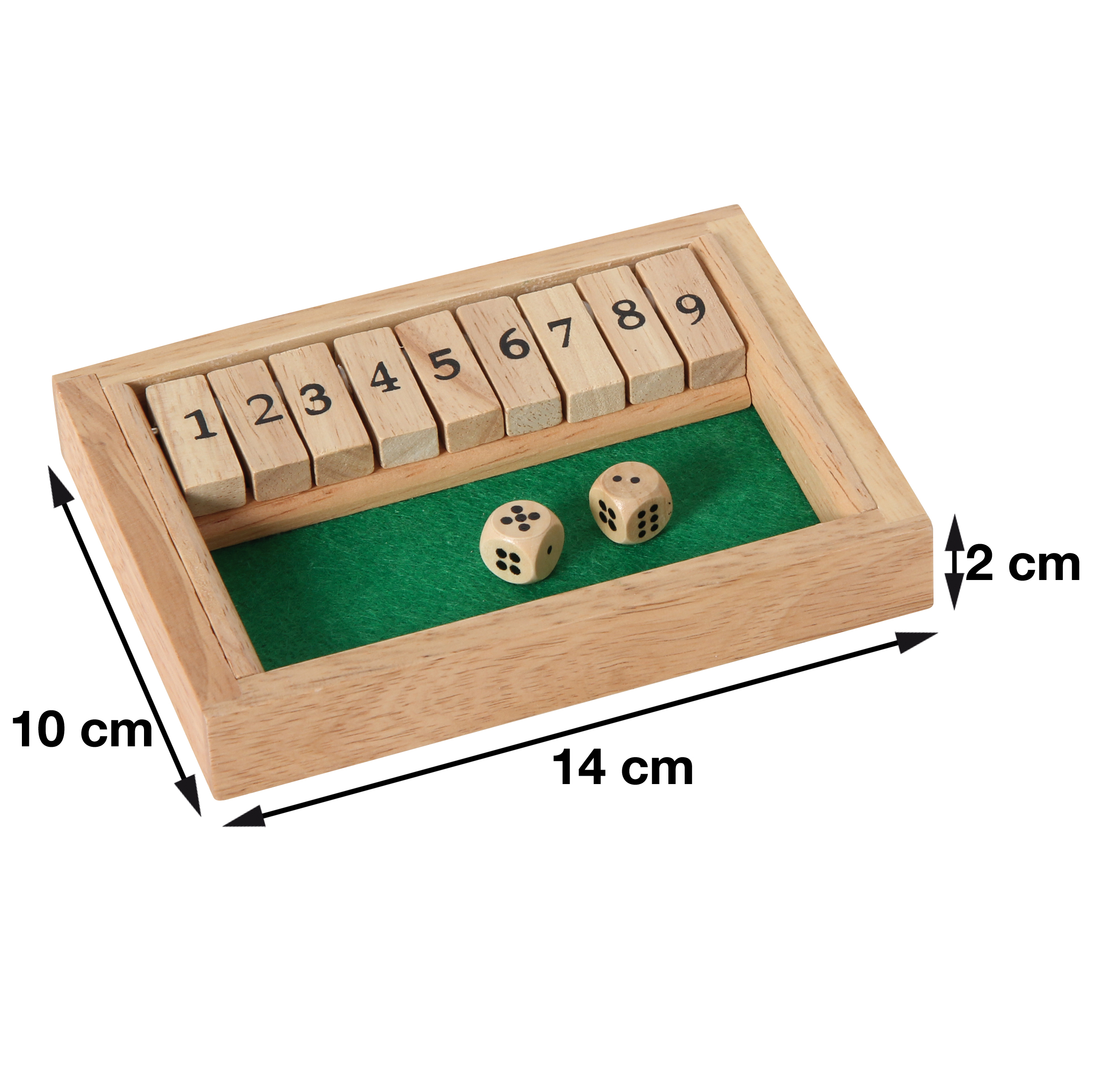 Supergünstiger Würfelspiele-Klassiker aus Holz für Klein & Groß! Mit Würfelfläche und 9 Klappen. Inklusive 2 Würfeln. Entsprechend der gewürfelten Augenzahlen werden 2 Klappen oder 1 Klappe mit der Augensumme umgeklappt. Wer nicht mehr klappen kann, verliert.