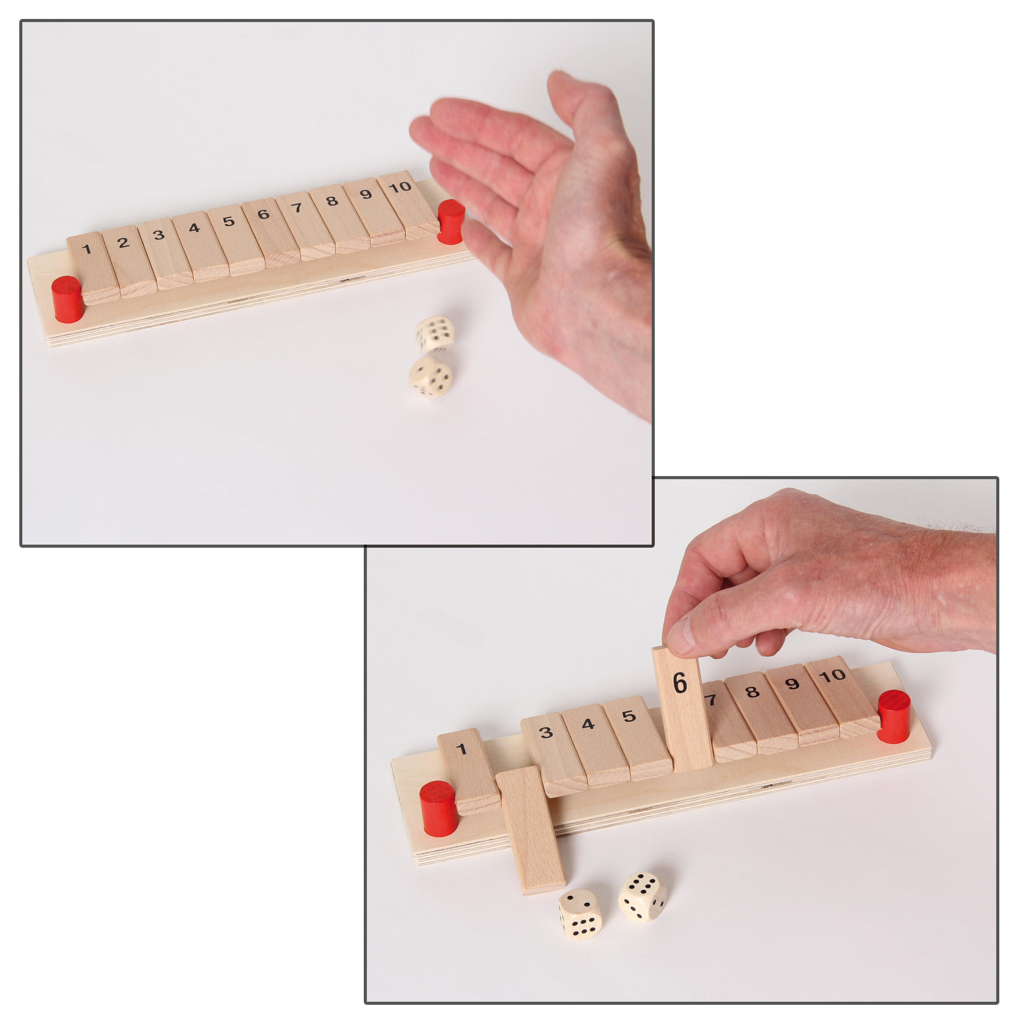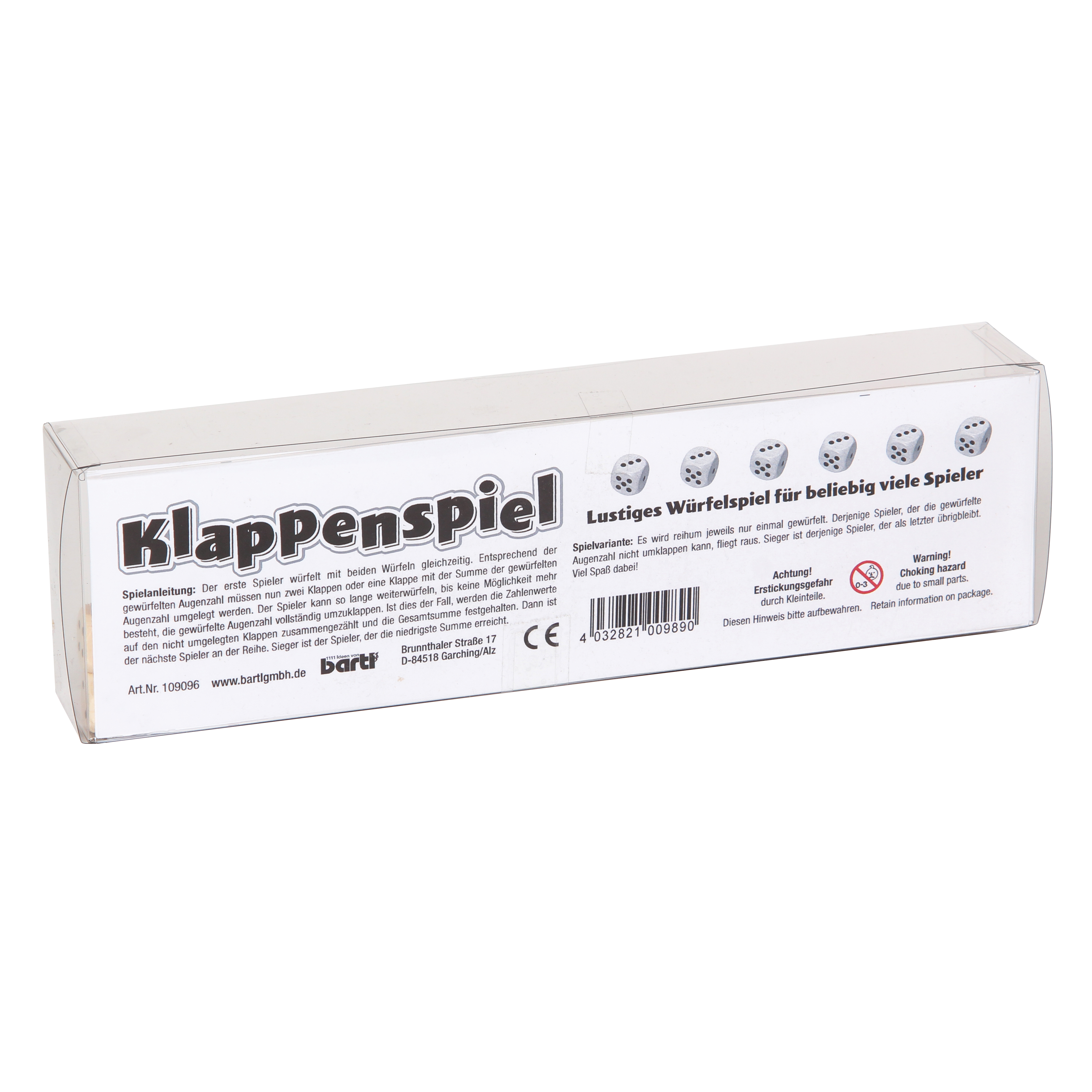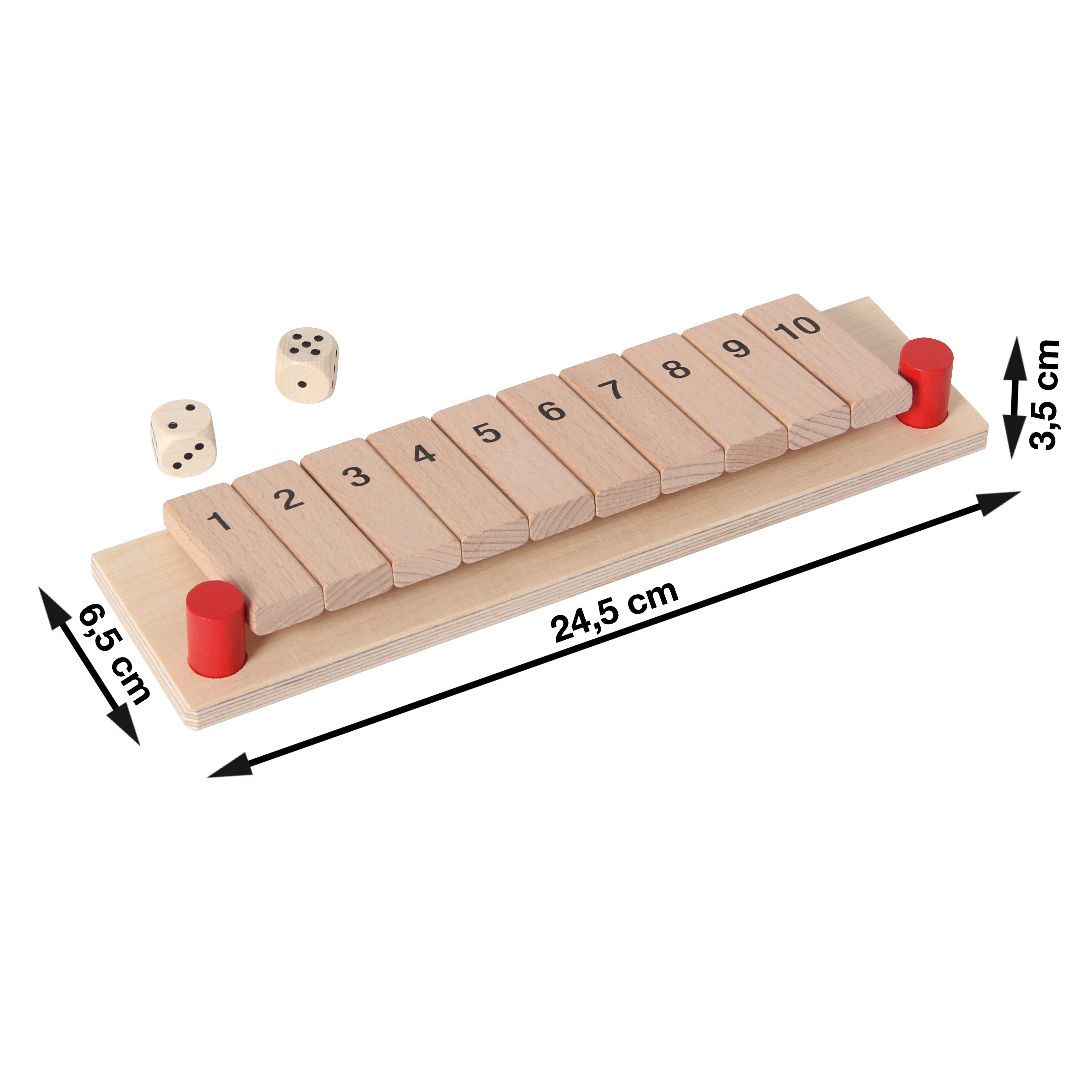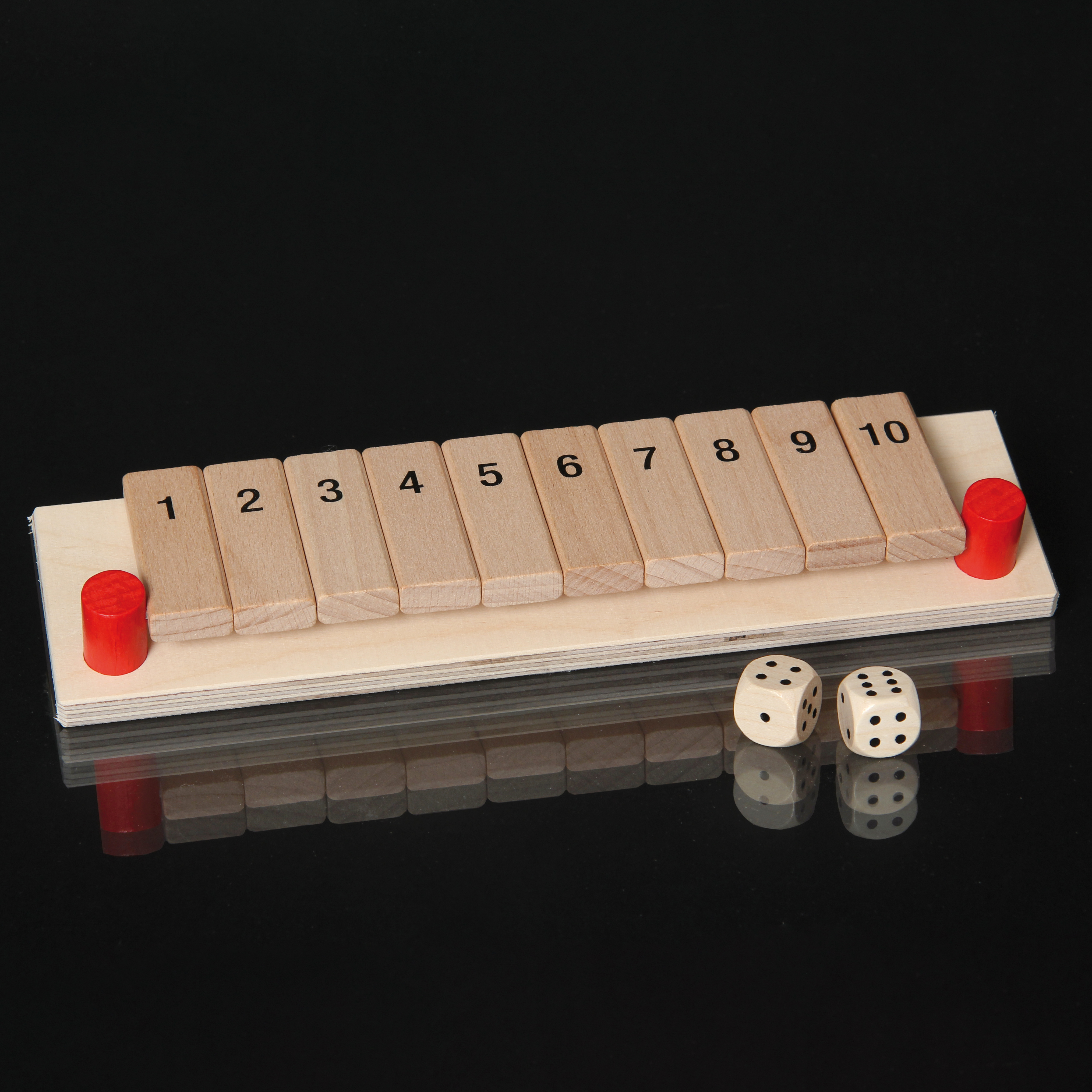 Standard-Ausführung aus Holz zum super Preis! Mit zwei Würfeln. Der Würfelspiele-Klassiker für Klein und Groß. Entsprechend der gewürfelten Augenzahl werden zwei Klappen oder eine Klappe mit der Augensumme umgeklappt. Wer nicht mehr klappen kann, verliert!