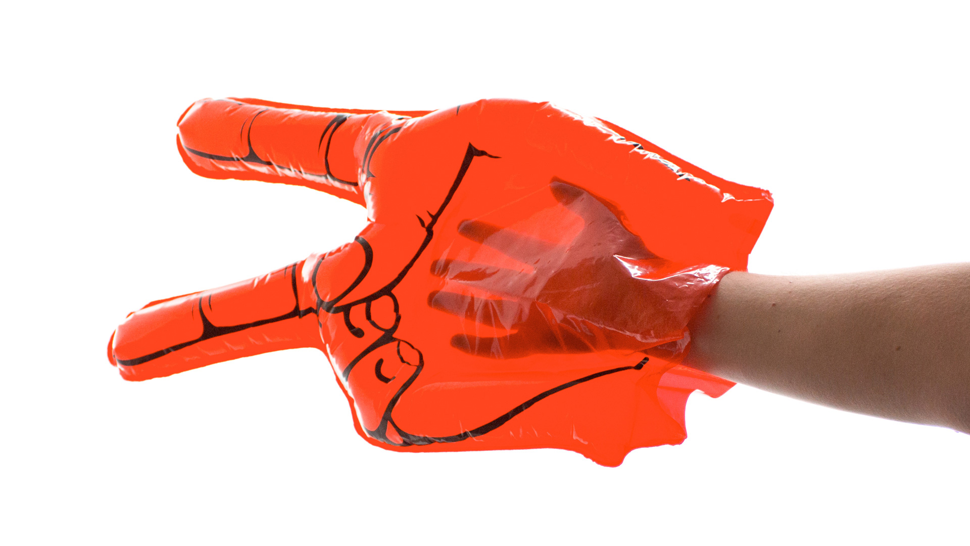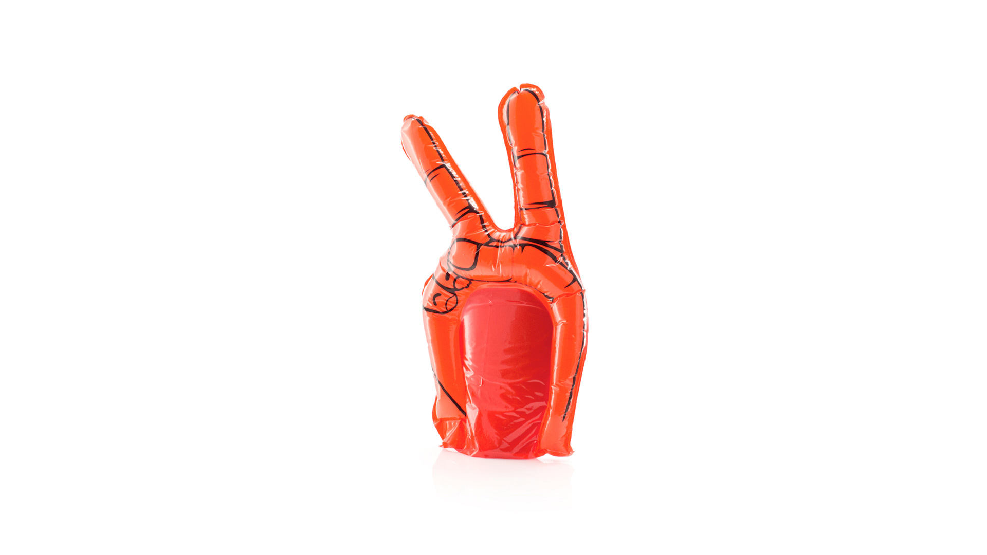 Tolle Hand mit Victory-Zeichen aus robustem LDPE-Material in leuchtenden Farben. Wiederverwendbar und mit Ventil.