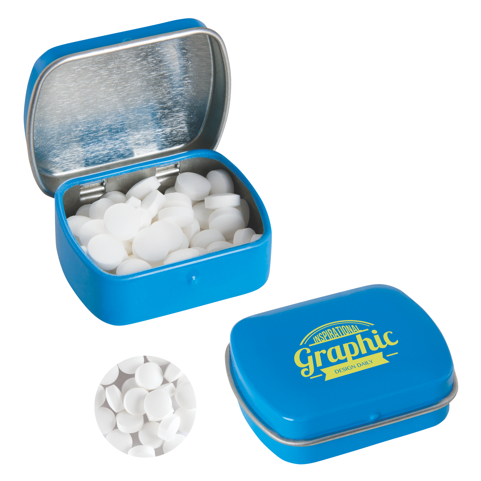 Kleine Scharnierblechdose, 42 x 33 x 14 mm mit ca. 10 gr. extra strong Minties `Triangle`, verfügbar in vielen Farben, mit Glanzschicht mit verschiedenen Füllungen: Schokoperlen gold, knuspriger Schokoladen festival, knusprige schokoladen Juwelen, goldglitzer Milchschokolade, kleine Herzen gold, kleine Herzen rot / weiß, marmorgold Schoko dunkel, mikro Milchschokoladeneier, mini Schokoperlen gold, mini Schokoperlen kupfer, roseglitzer Milchschokolade, silberglitzer Milchschokolade oder sommerkonfetti Schoko dunkel.