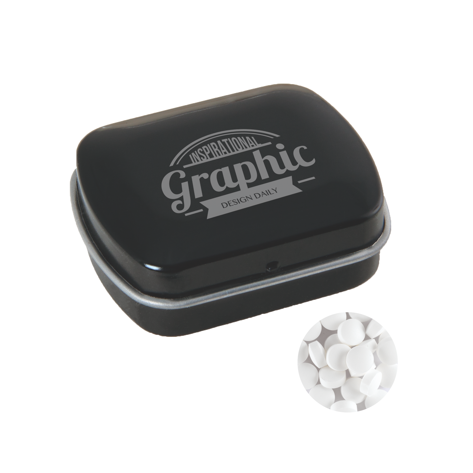 Kleine Scharnierblechdose, 42 x 33 x 14 mm mit ca. 10 gr. extra strong Minties `Triangle`, verfügbar in vielen Farben, mit Glanzschicht mit verschiedenen Füllungen: Schokoperlen gold, knuspriger Schokoladen festival, knusprige schokoladen Juwelen, goldglitzer Milchschokolade, kleine Herzen gold, kleine Herzen rot / weiß, marmorgold Schoko dunkel, mikro Milchschokoladeneier, mini Schokoperlen gold, mini Schokoperlen kupfer, roseglitzer Milchschokolade, silberglitzer Milchschokolade oder sommerkonfetti Schoko dunkel.