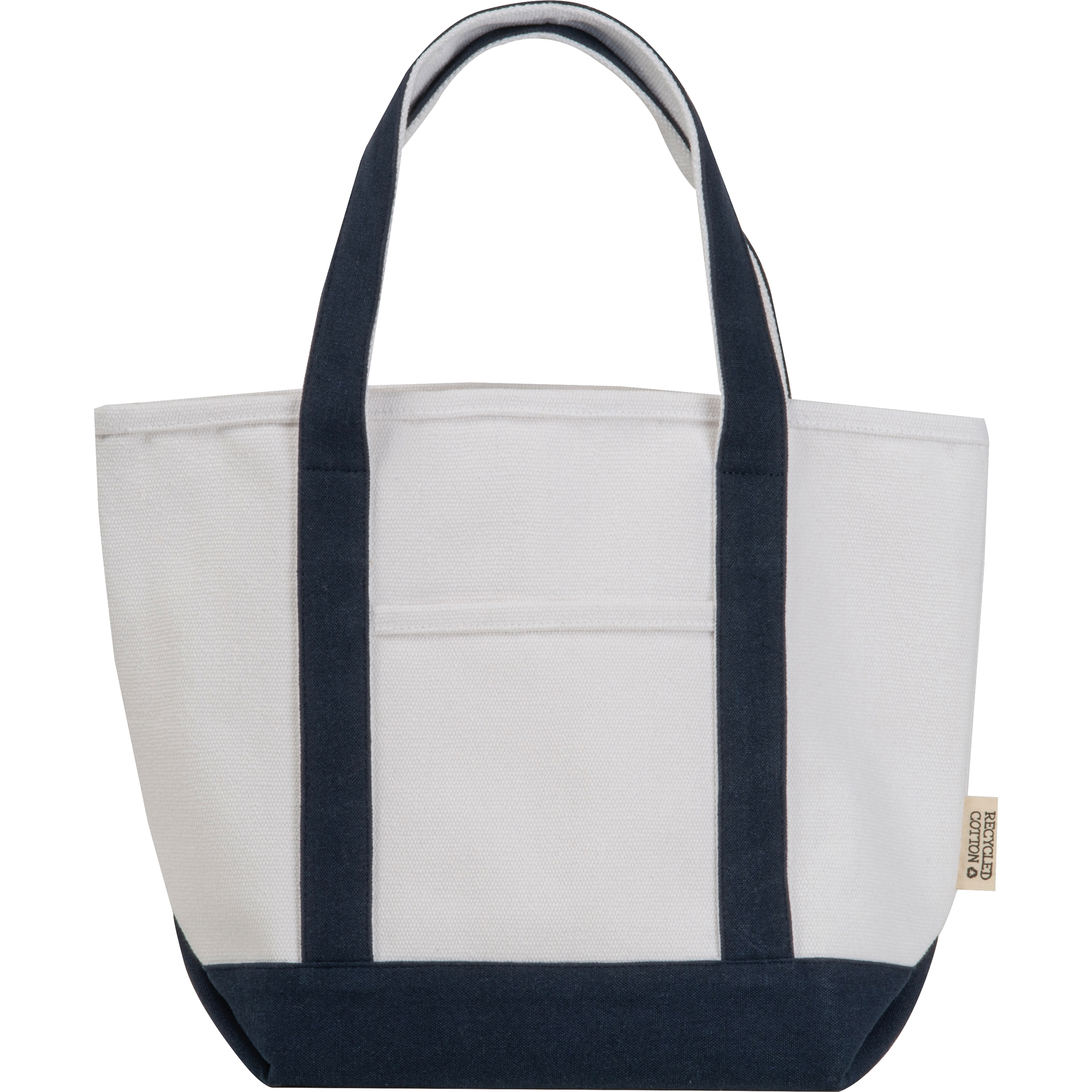 Kleine Tragetasche aus recycelter Baumwolle (730 g / m²) mit zwei farbigen langen Henkeln und stabiler Bodenfalte. Vielseitig einsetzbar z. B. Einkaufen, Strand, etc. Praktische Einschubtasche an der Vorderseite. Ihre Werbung drucken wir auf die vordere Einschubtasche.