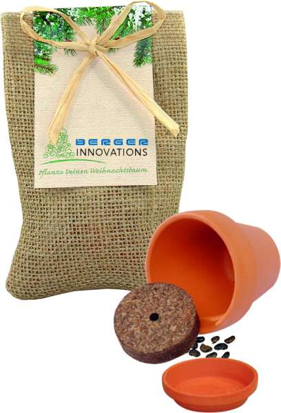 Ein Stück Natur beinhaltet dieses kleine Jutesäckchen. Neben der Pflanzanleitung ist alles dabei für die Anzucht einer kleinen Fichte-Pflanze: Tontopf 4 cm, Samen und Erdtablette. Platz für den Werbedruck ist auf dem Standardmotiv des Headers oder eine eigene Gestaltung, jeweils bereits ab 250 Stück.