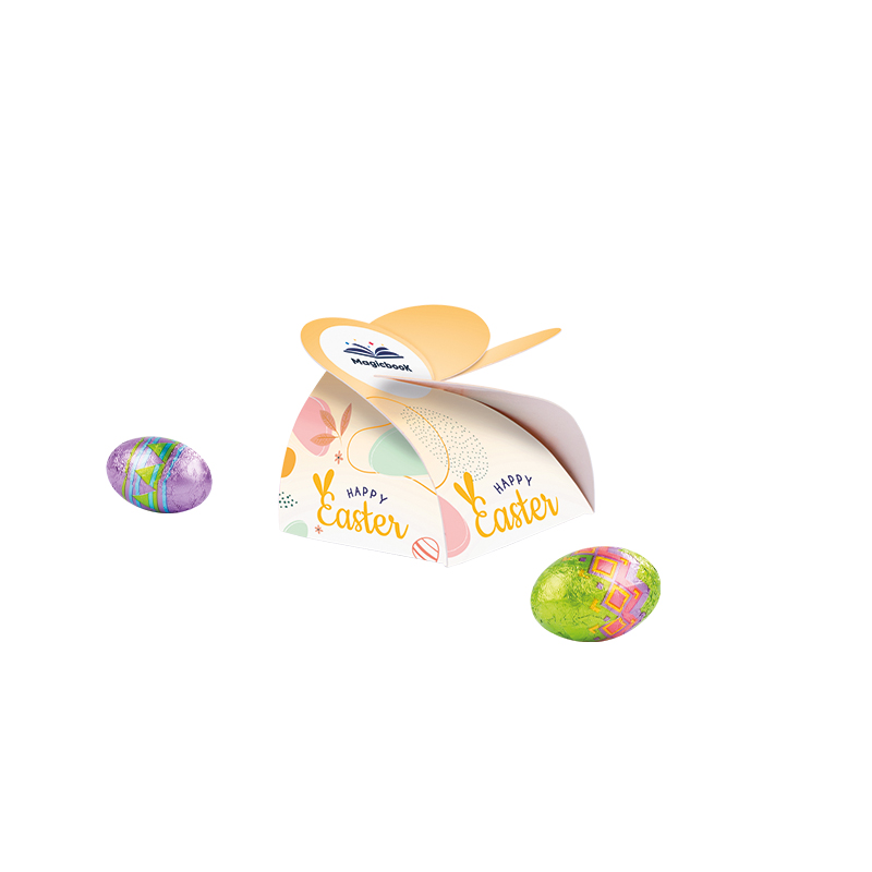 Kleine Werbebox aus Karton mit Steckverschluss, individuell bedruckt. Inhalt: 1 Klett Osterei aus feinster Vollmilchschokolade in bunter Alufolie, 6,3 g. Farbe nicht wählbar. Saisonartikel - solange der Vorrat reicht!