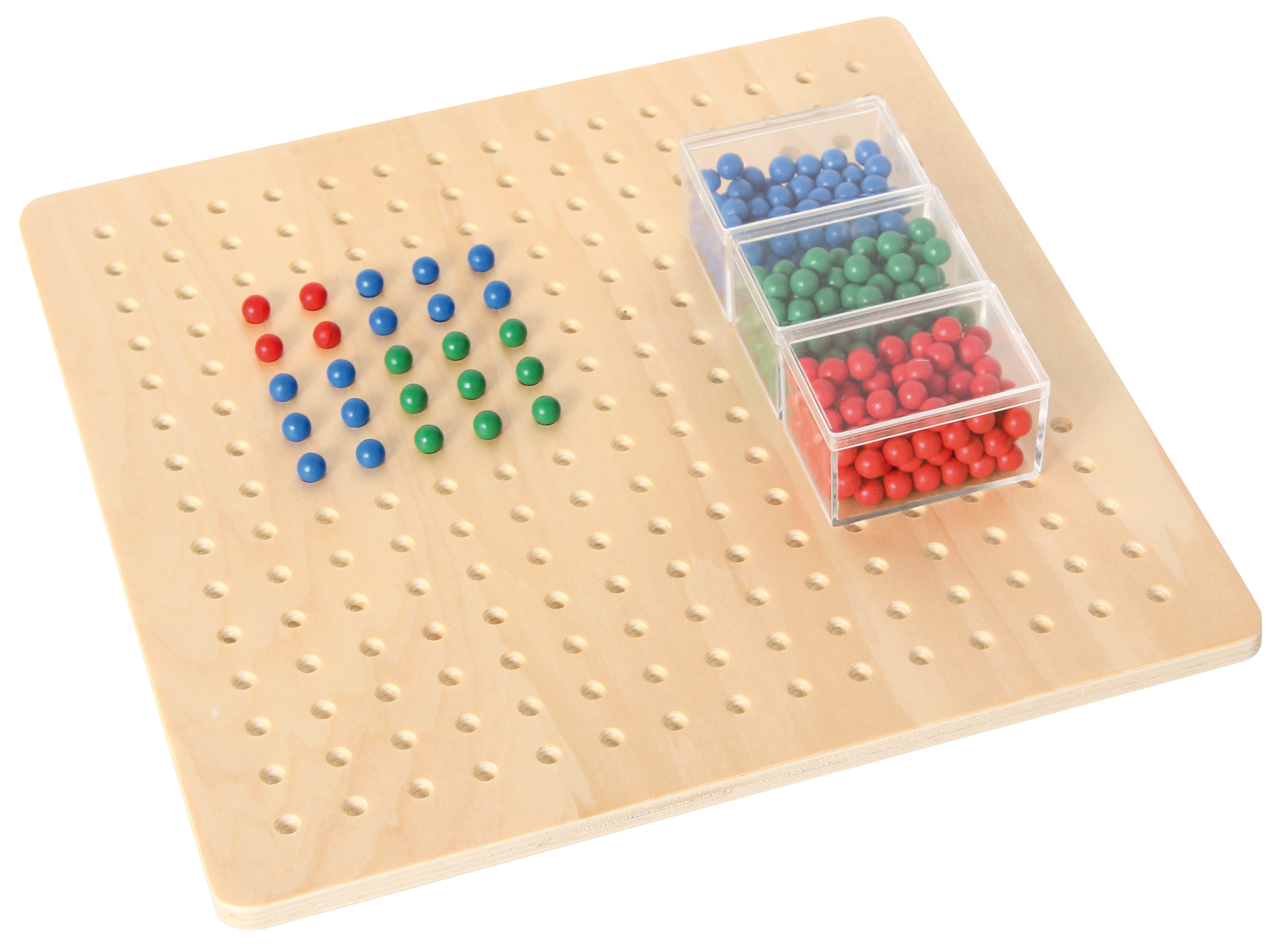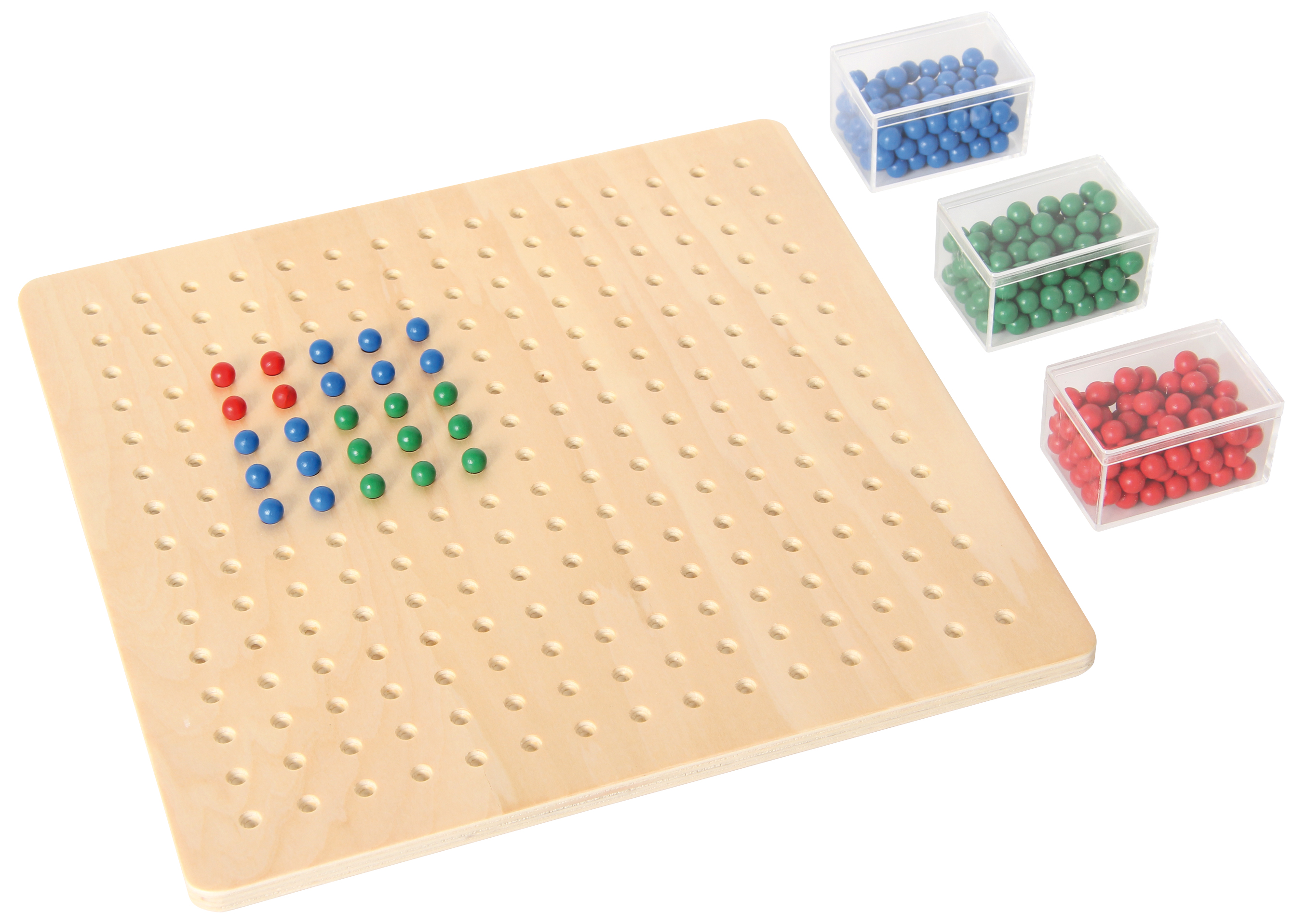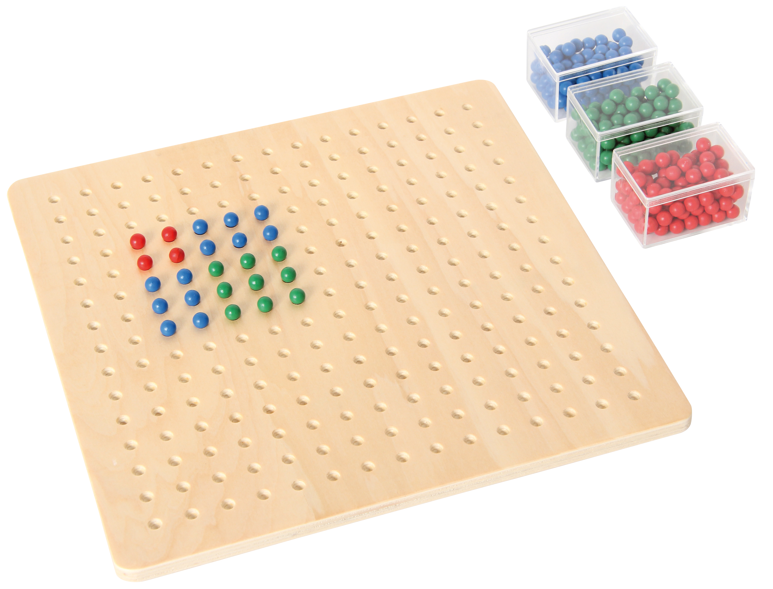 Mit dem Wurzelbrett erlernen Kinder mit allen Sinnen das Wurzelziehen und Potenzieren. Darüberhinaus übt man das Zerlegen in Faktoren, sucht den größten gemeinsamen Divisor, oder das kleinste gemeinsame Vielfache ... Die geometrische Darstellung der Rechenaufgabe erleichtert das Lernen. Das Material besteht aus: - einem Holzbrett mit 15 x 15 Vertiefungen - je 100 grünen, blauen und roten Perlen in drei Kunststoffboxen. Selbstkontrolle durch Abzählen und Vergleichen. Größe des Brettes: 32 x 32 x 1 cm. Ab 5 Jahren.