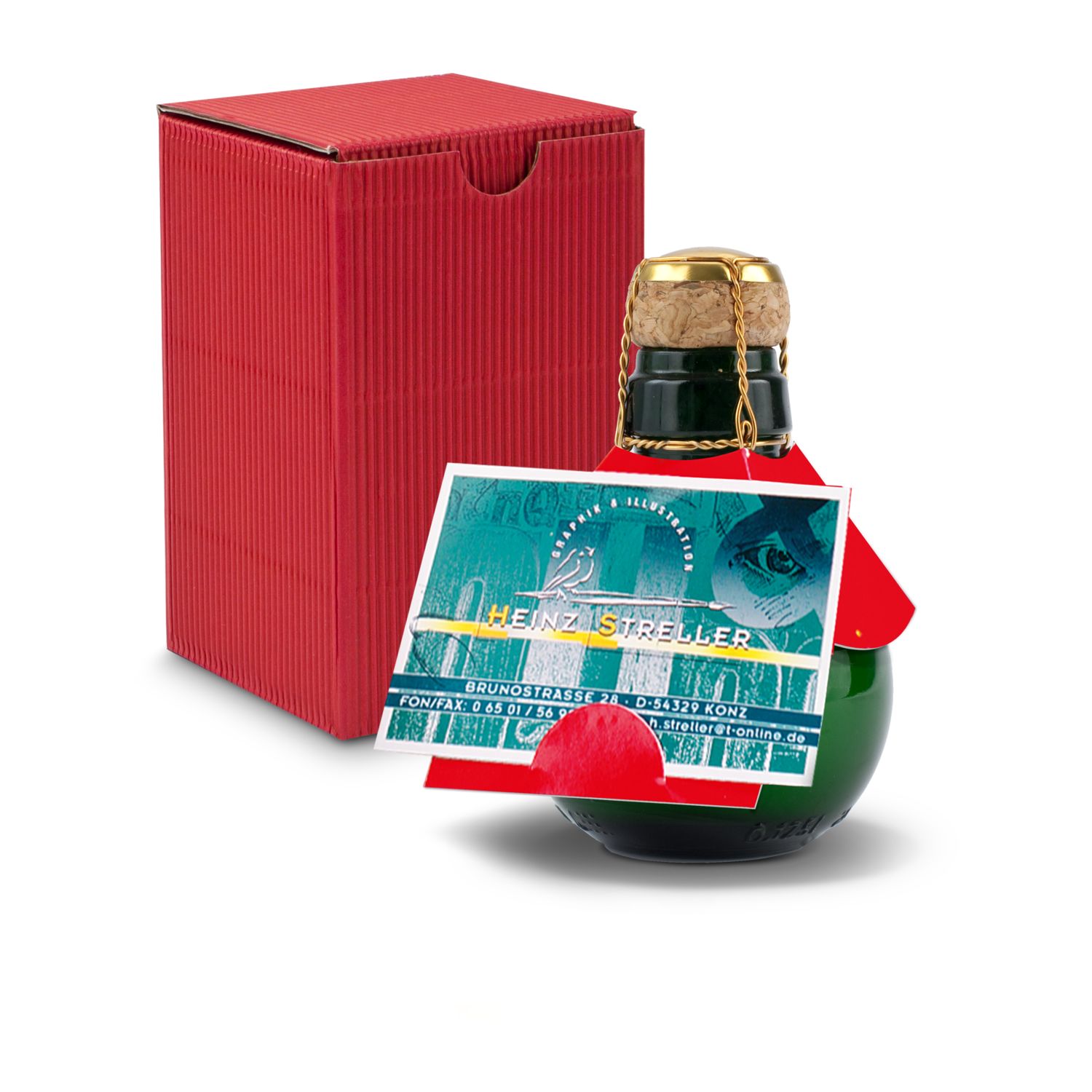 Eine Kleinere gibt es nicht: 0,125 l hochwertiger Sekt brut in origineller Flasche mit Naturkork und Agraffe, Alkohol 12% Vol., inklusive 0,17 € Schaumweinsteuer in Deutschland! Präsentiert in origineller Schmuckwelle - in 4 Farben erhältlich. In verschiedenen Standarddesigns ab 1 Stück oder in individuellem Design ab 120 Stück erhältlich. Auf Wunsch auch ohne Schmuckwelle erhältlich.