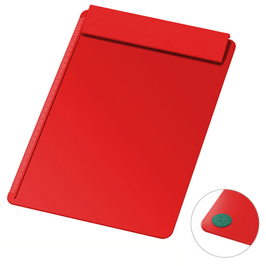 Klemmbrett DIN A4 "Alpha" mit Klemmleiste, seitlichem Anschlag und 30 cm Skala, ohne Papier, mit 4 geräuschdämpfenden Filzpunkten auf der Plattenrückseite, ohne Papier.