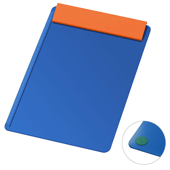 Klemmbrett DIN A4 "Alpha" mit Klemmleiste, seitlichem Anschlag und 30 cm Skala, ohne Papier, mit 4 geräuschdämpfenden Filzpunkten auf der Plattenrückseite, ohne Papier.