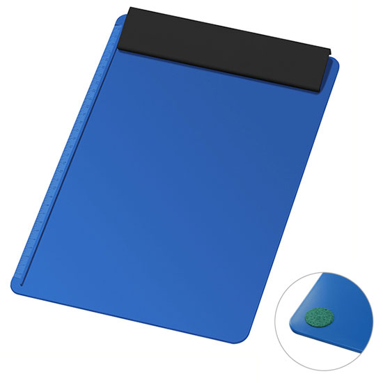 Klemmbrett DIN A4 "Alpha" mit Klemmleiste, seitlichem Anschlag und 30 cm Skala, ohne Papier, mit 4 geräuschdämpfenden Filzpunkten auf der Plattenrückseite, ohne Papier.