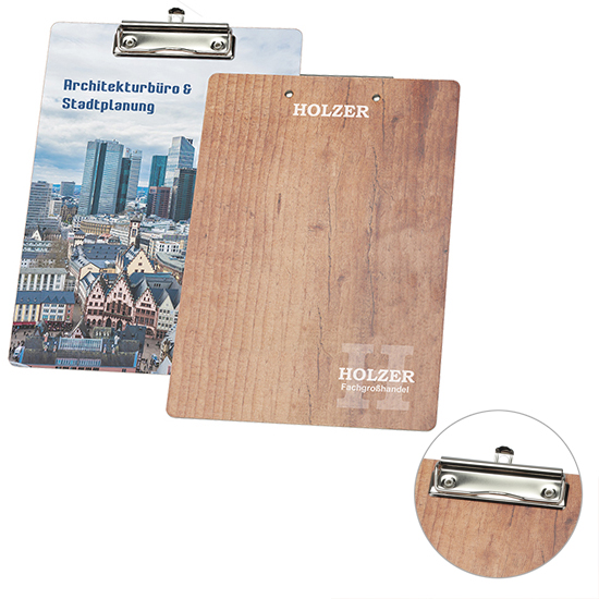 Klemmbrett DIN A4 Karton mit Metallklemme und ausziehbarer Aufhängung, inkl. individueller 5-farbiger Vorder- und Rückseitengestaltung nach CMYK + weiß, ohne Papier