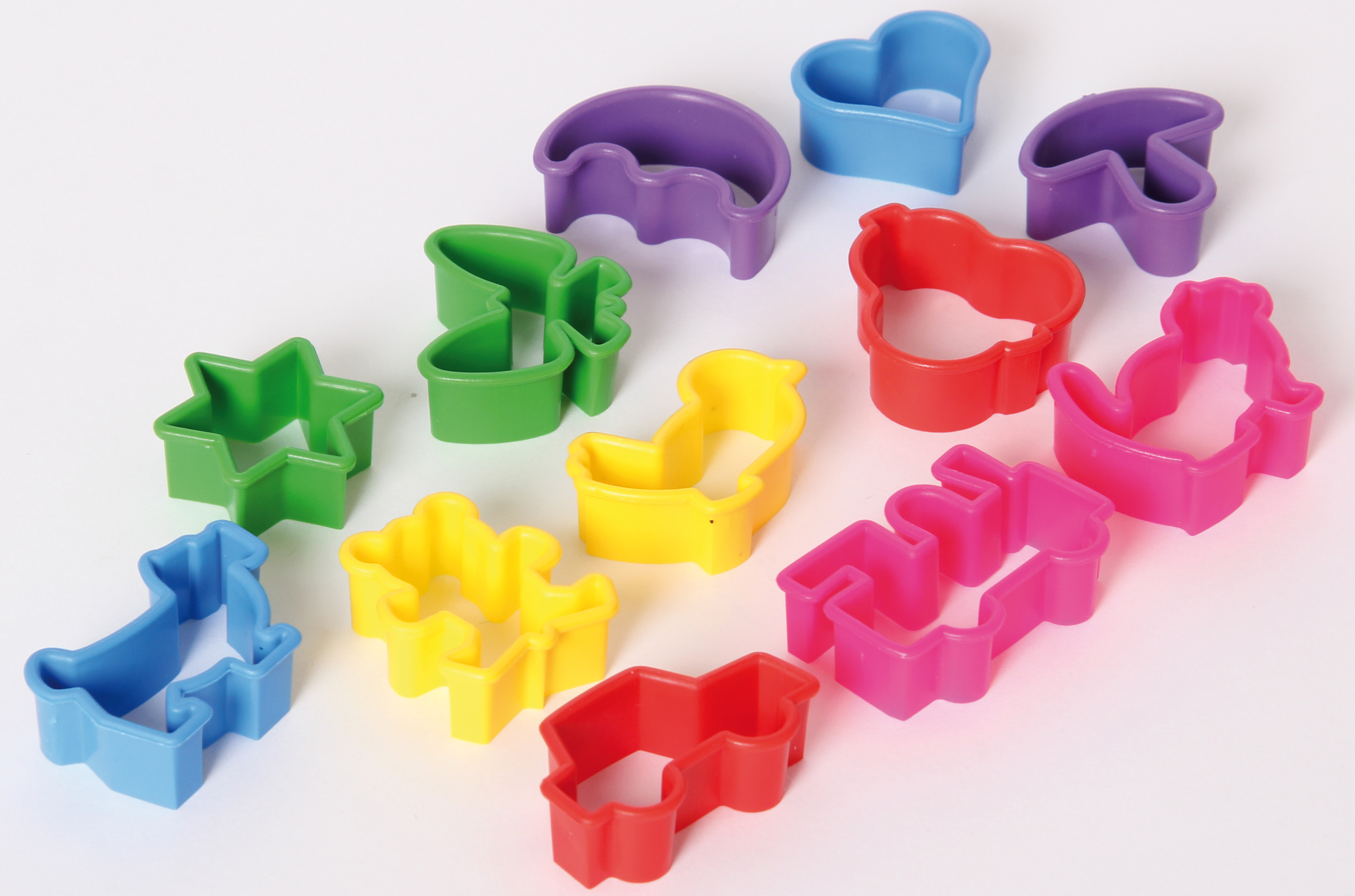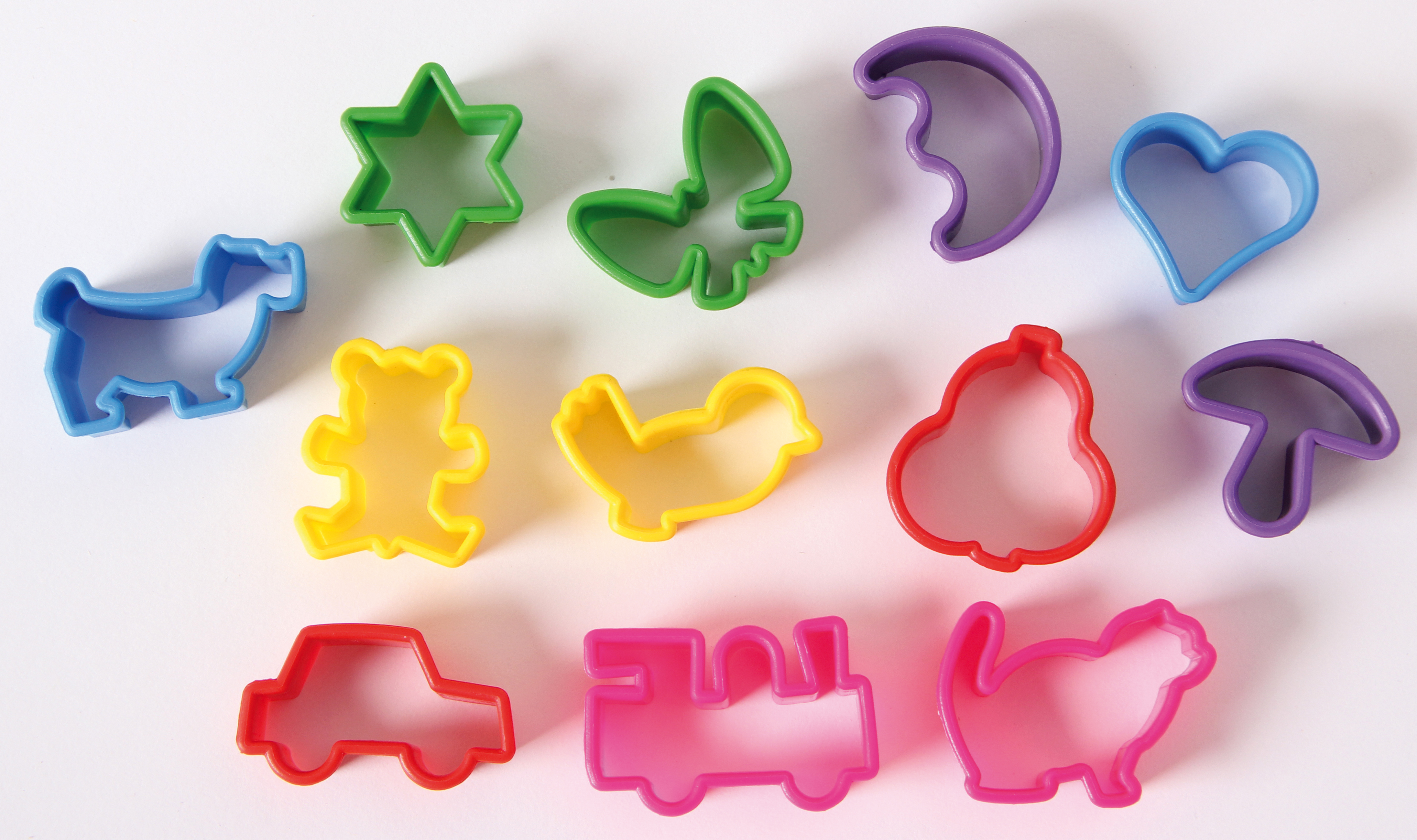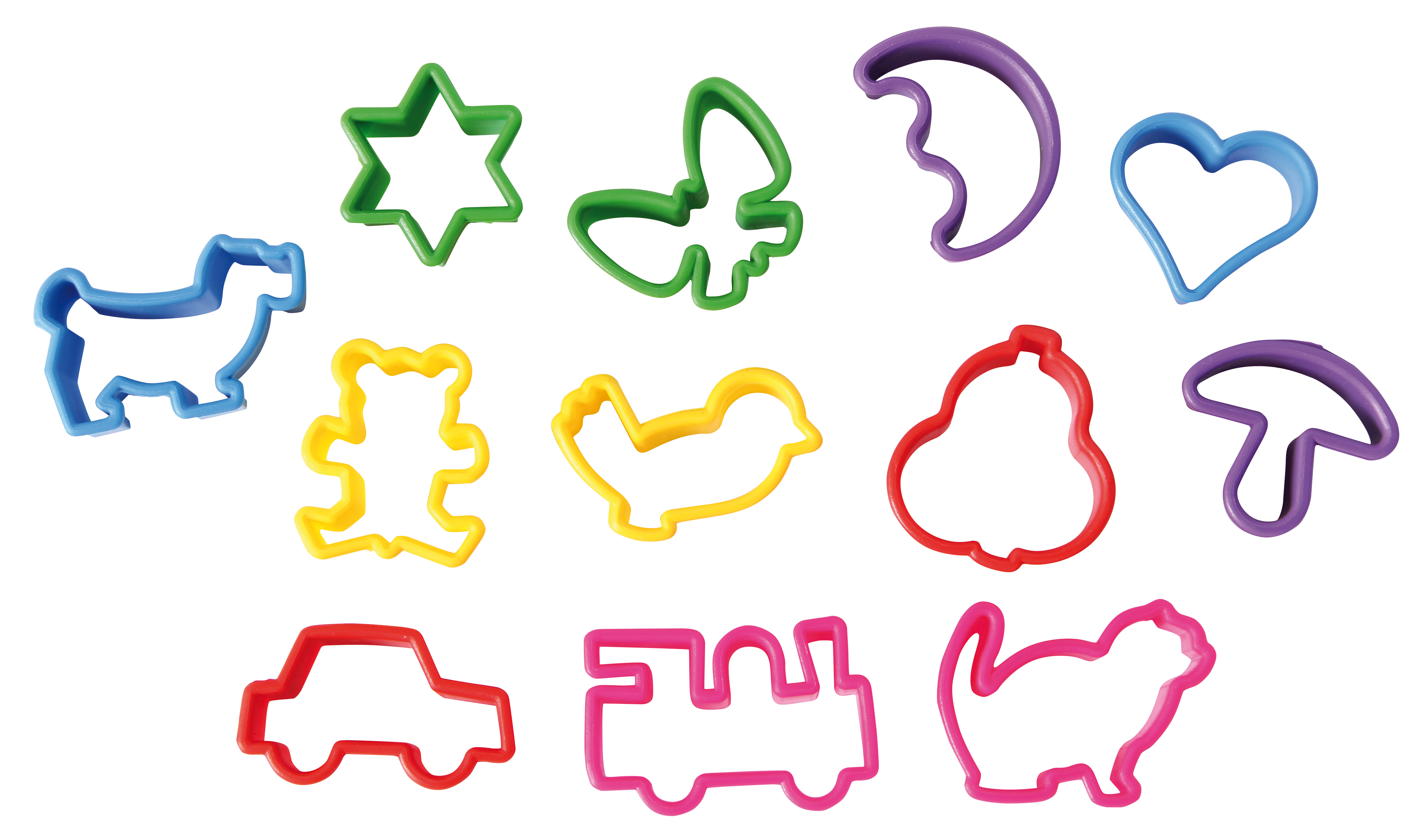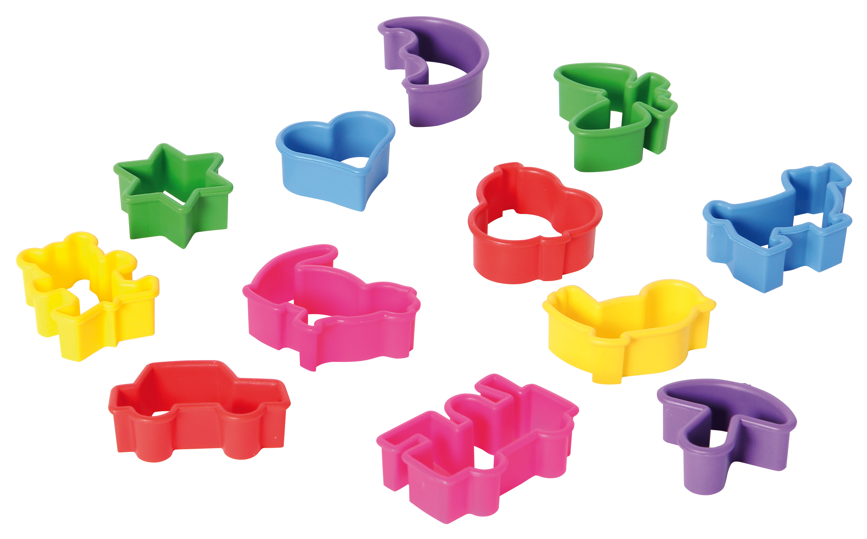 Bunte Knet- und Back-Ausstechformen in 12 kindgerechten Designs. Verpackt in einer Klarsicht-Runddose.