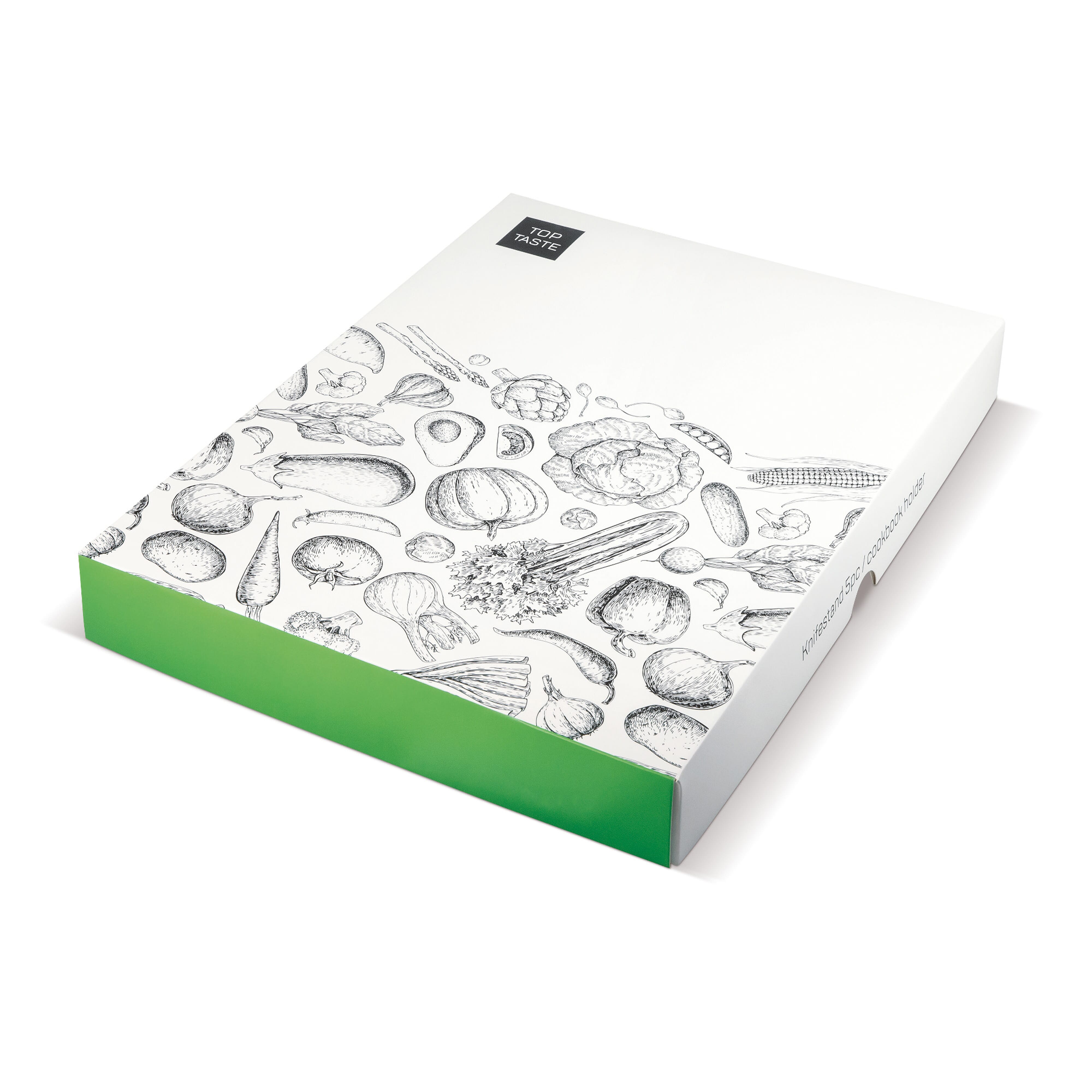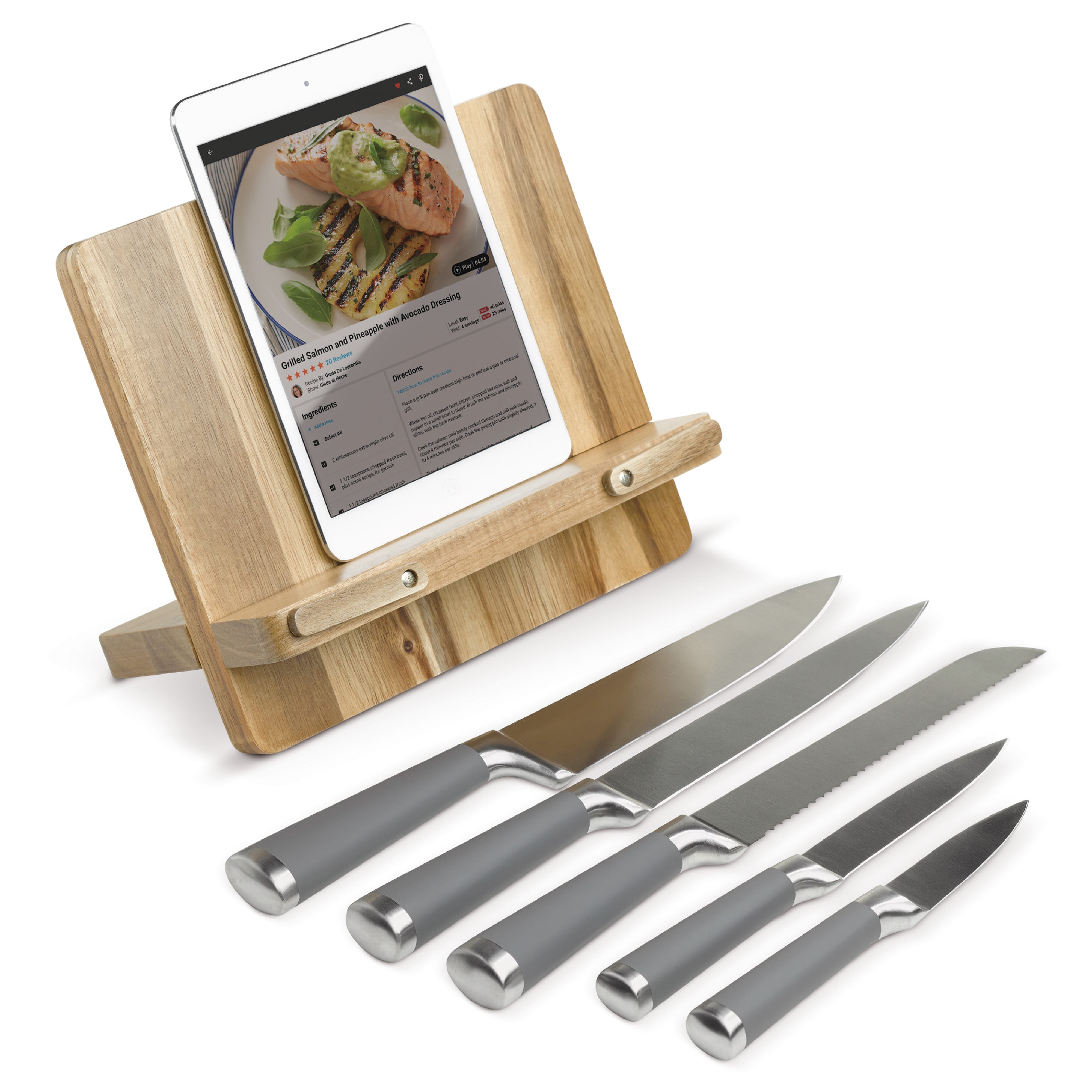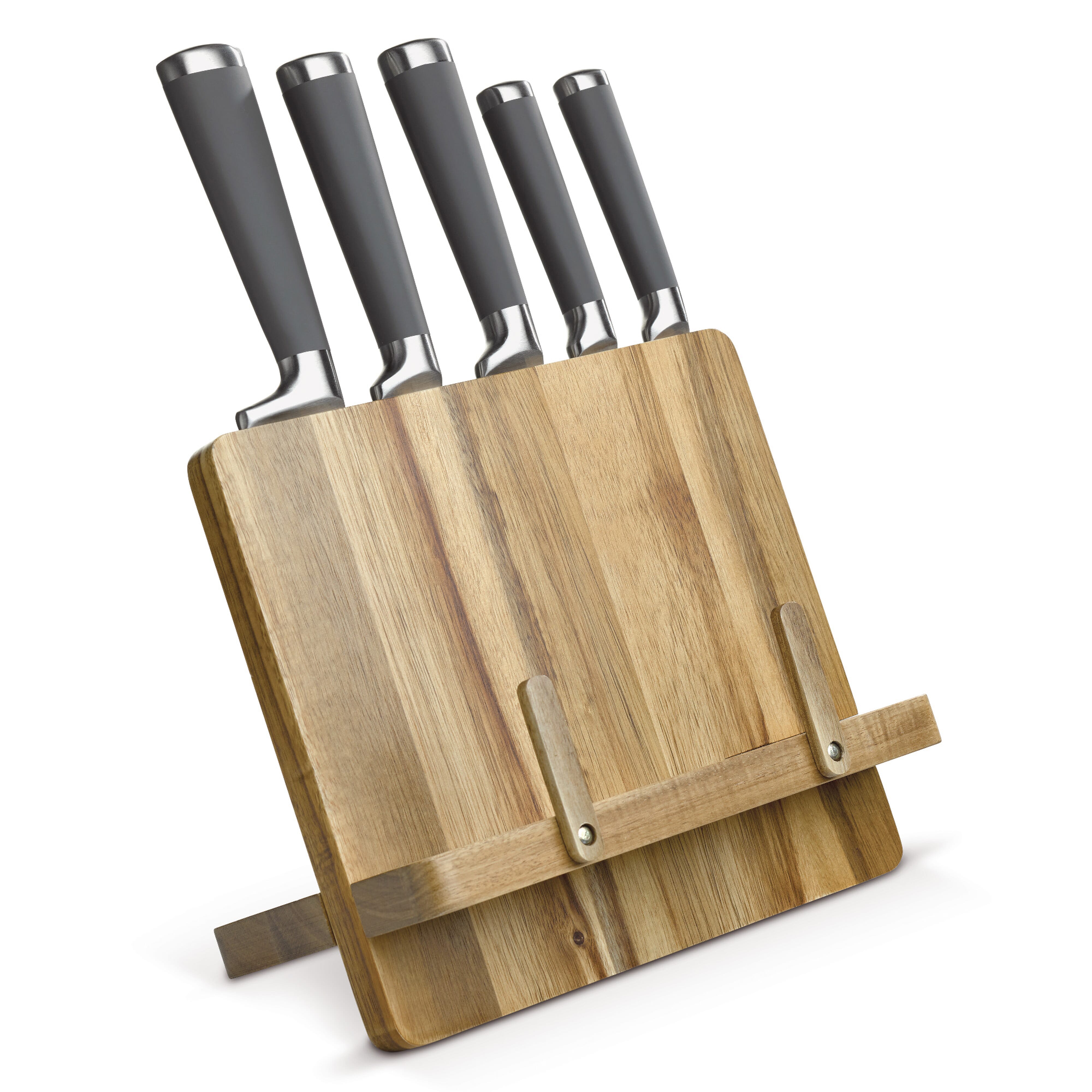 Hochwertiger Kochbuchständer aus Akazienholz. Wird mit fünf verschiedenen Messern geliefert. Verpackt in einer Geschenkbox.