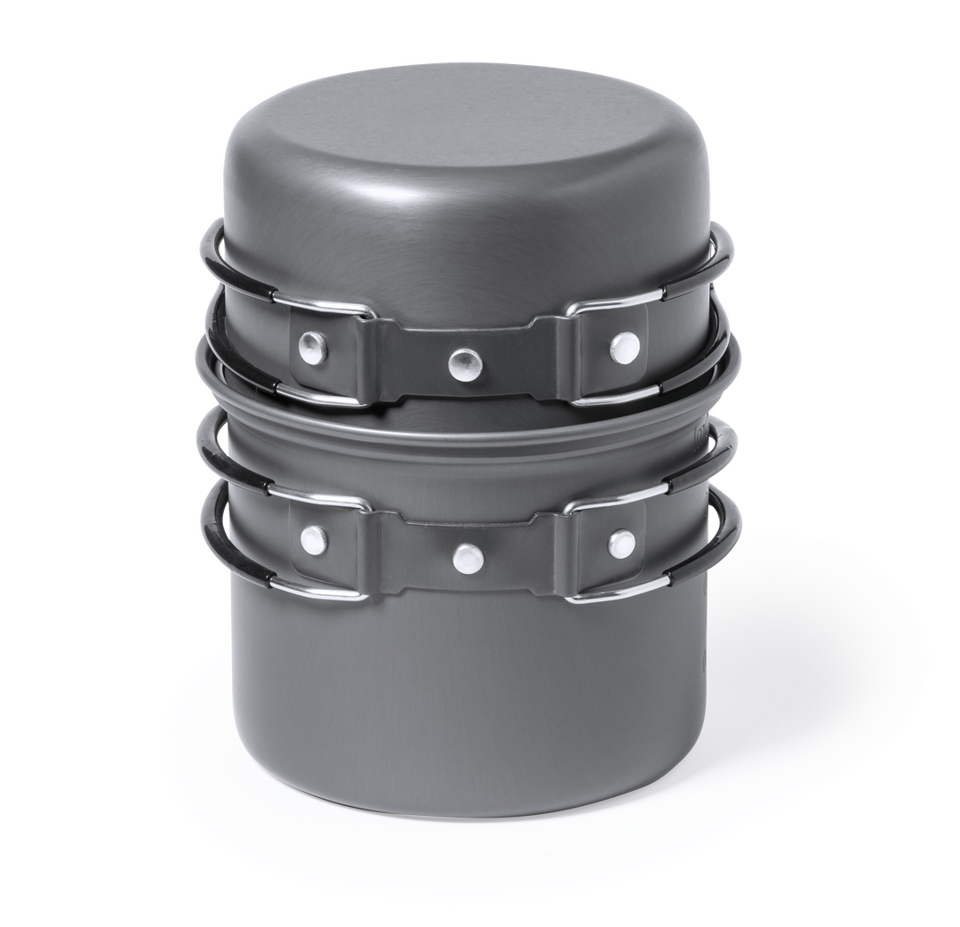 Ein komplettes Set von Campingutensilien in einem ultrakompakten Format. Präsentiert in einem robusten RPET-Beutel mit Kordelzugverschluss, passendem Zubehör und Außenetikett mit RPET-Logo. Inhalt:1 Aluminiumtopf in mattgrauer Ausführung. Fassungsvermögen 800 ml Durchmesser 13 cm x Höhe 10 cm. Faltbare Griffe mit Verbrühungsschutz.1 Stieltopf aus Aluminium, mattgrau lackiert. 600 ml Fassungsvermögen 12 cm Durchmesser x 6,5 cm hoch. Klappbare Griffe mit Verbrühungsschutz. Klapplöffel, Messer und Gabel aus rostfreiem Stahl. Mit gestanztem Griff und Sicherheitsschlössern. Geliefert in einzelnen RPET-Beuteln mit Kordelzug. Das RPET-Material der Beutel wird aus recyceltem Kunststoff hergestellt, um die Wiederverwendung von Kunststoffabfällen zu fördern und die Nachhaltigkeit unseres Planeten zu unterstützen.