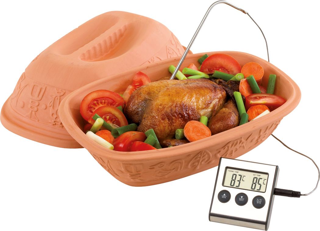 Kochthermometer GOURMET: mit Edelstahlfront, Spieß mit hitzebeständigem Kabel, Hitzealarm für Ziel-Temperatur, Timer (auch als Eieruhr verwendbar), 3 Kontrollknöpfe und LCD-Anzeige (für °C und °F), batteriebetrieben (1xAAA Batterien nicht enthalten), in Box
