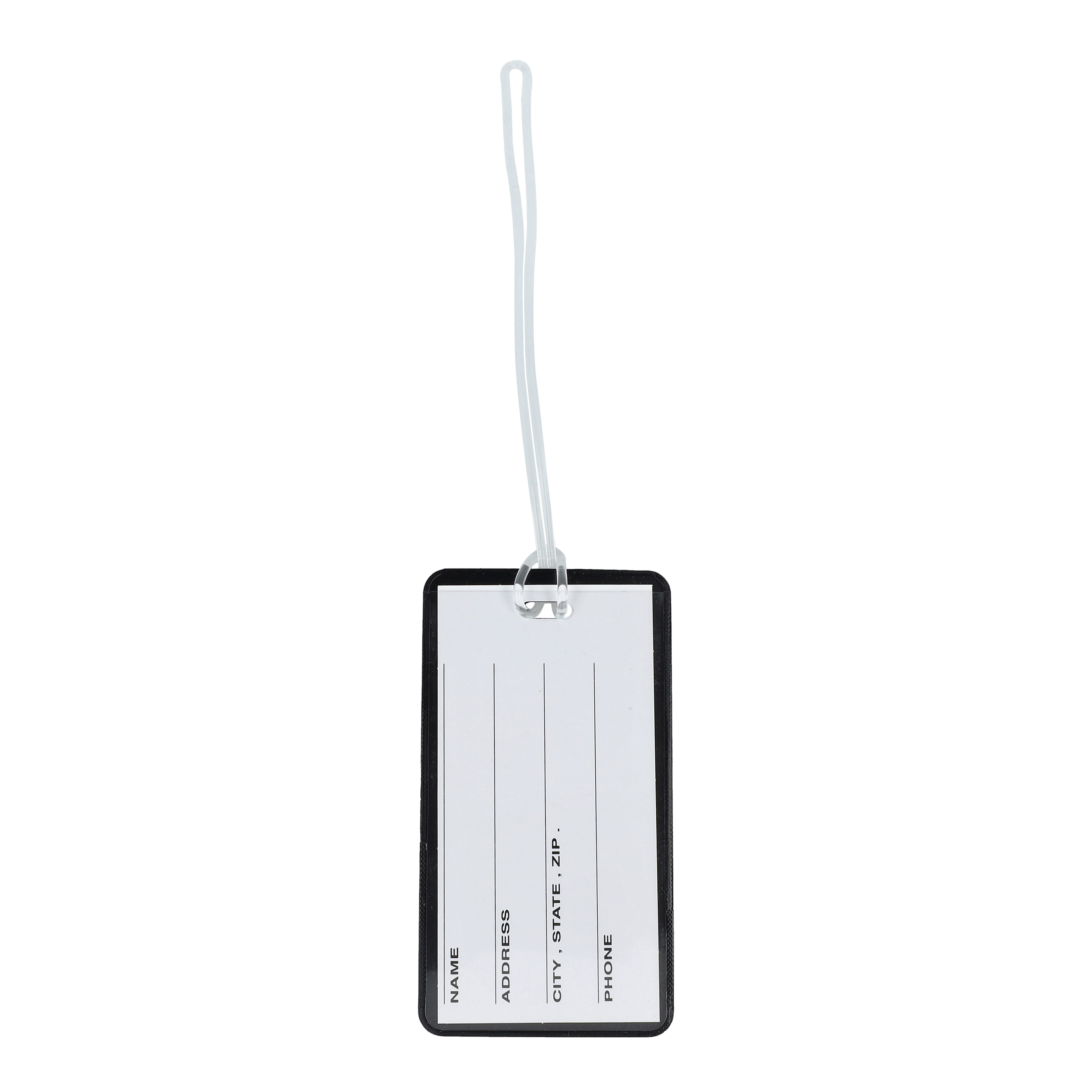 Praktischer Kofferanhänger aus PVC mit einer großen Werbefläche. Im Inneren des Etiketts befindet sich eine herausnehmbare Karte, auf die Sie Ihre Adressdaten schreiben können.