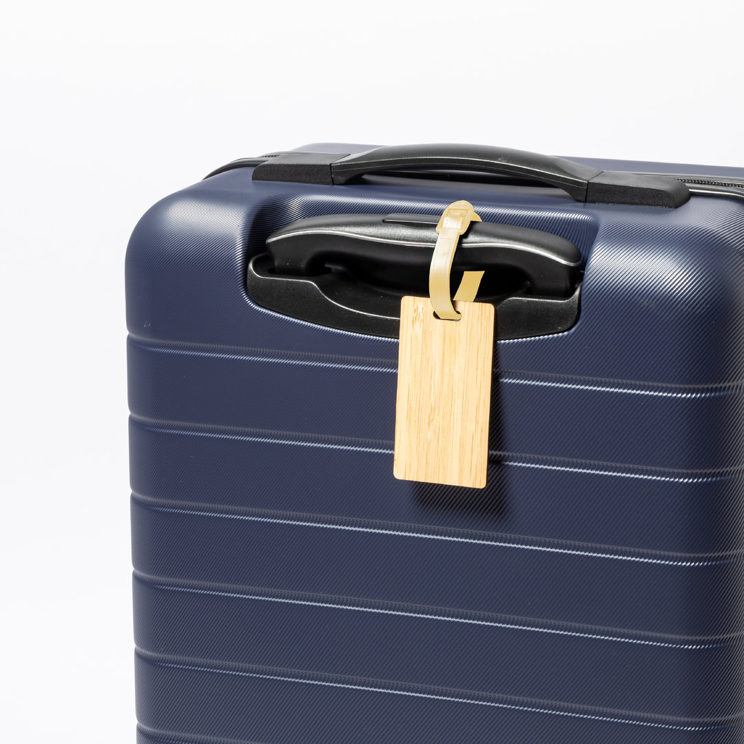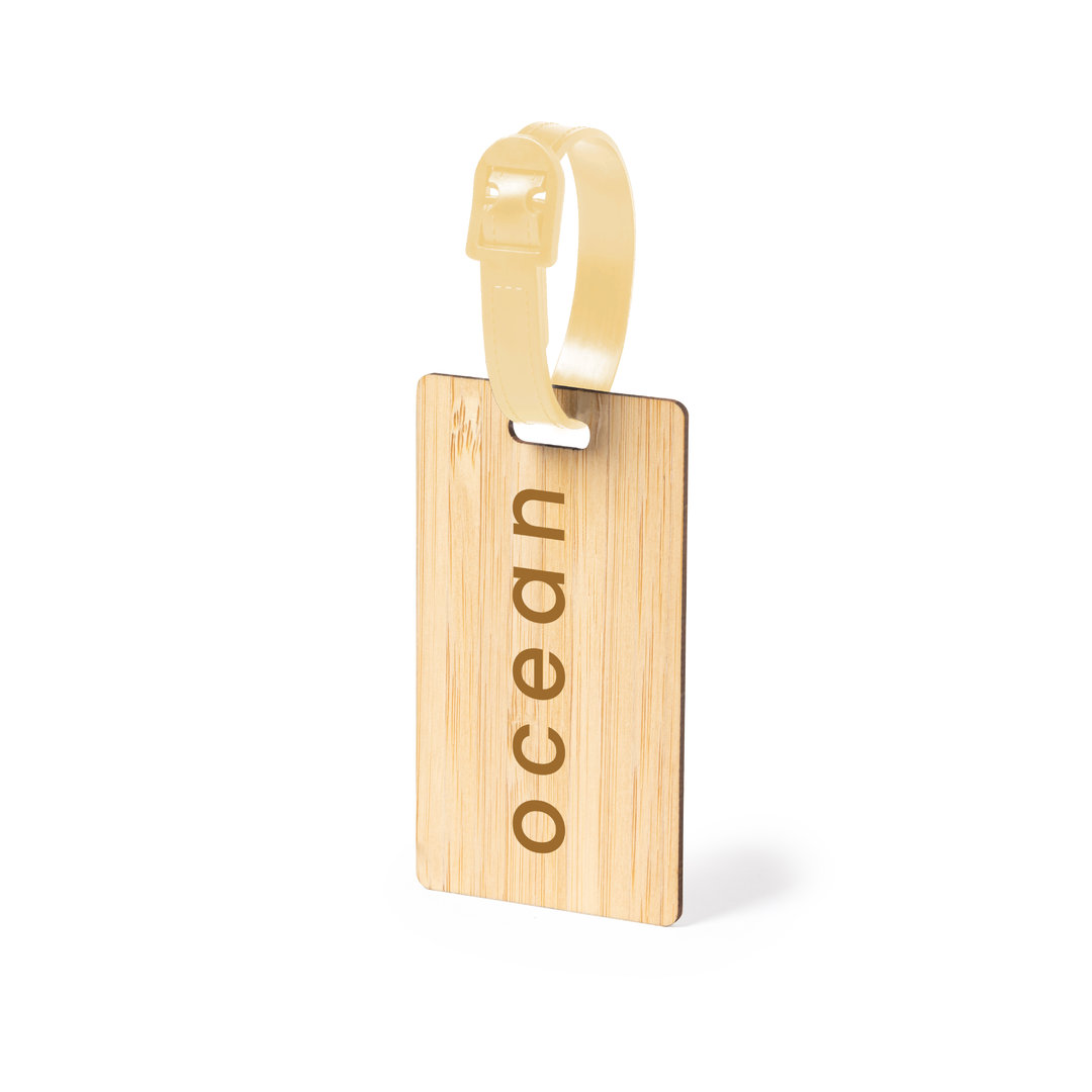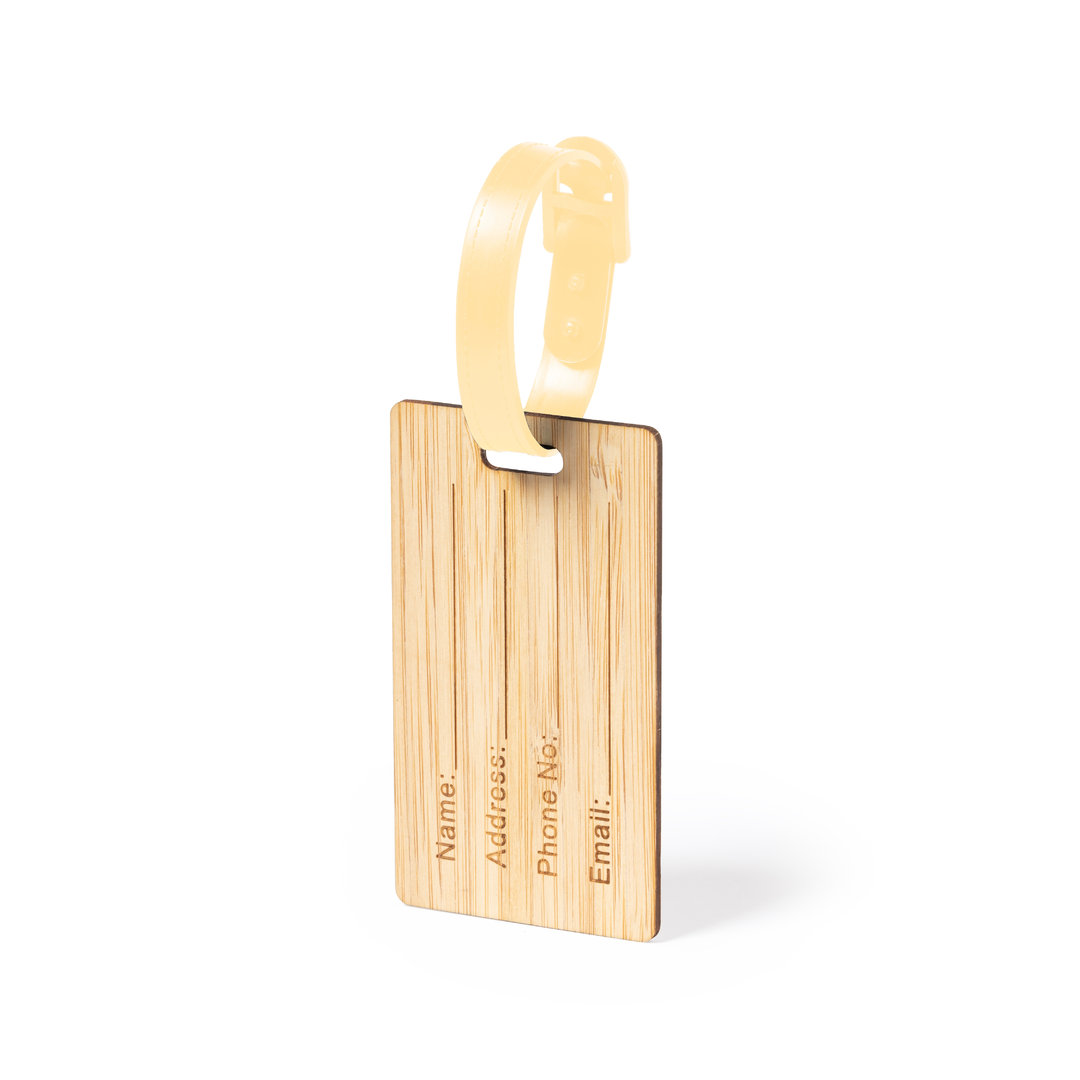 Linie Natur Gepäckanhänger aus Bambus. Riemen mit Metallschnallenverschluss und ID-Daten in Englisch, mit leerer Gegenseite für die Veredelung.