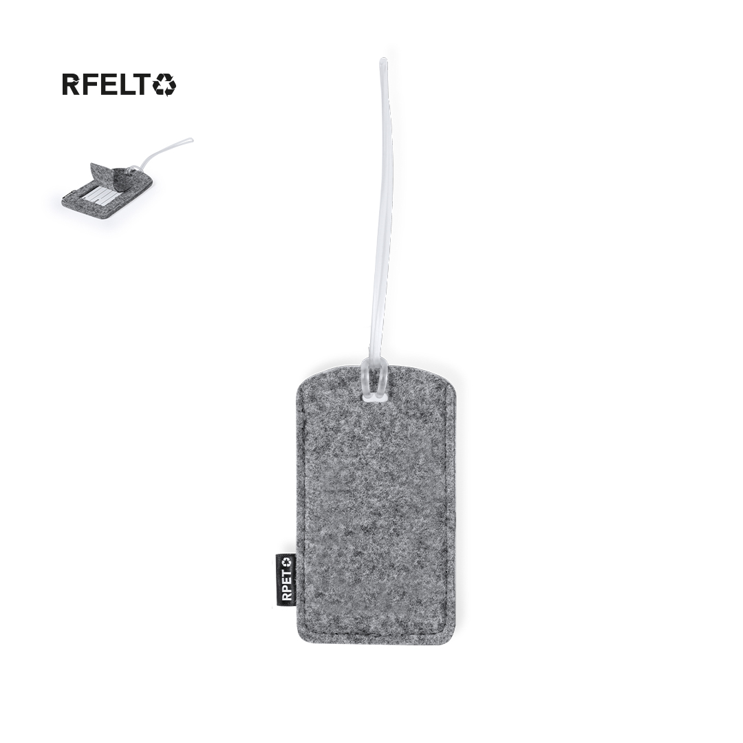 Gepäckidentifikator aus RPET-Filz. Kann mithilfe des flexiblen Riemens und mit einer Karte für grundlegende Informationen an jedem Koffer befestigt werden. Hergestellt aus RPET-Filz, mit Fenster und RPET-Etikett. RPET-Filz ist das Ergebnis der Kombination der Recyclingprozesse von Kunststoffmaterialien mit der tausendjährigen Technik der Filzherstellung. Das Ergebnis ist ein Öko-Trendmaterial, das nicht nur recycelten Ursprungs ist, sondern auch recycelbar ist.