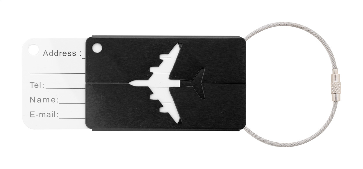 Kofferanhänger mit Flugzeugmotiv aus Aluminium und Schnur aus Metall.