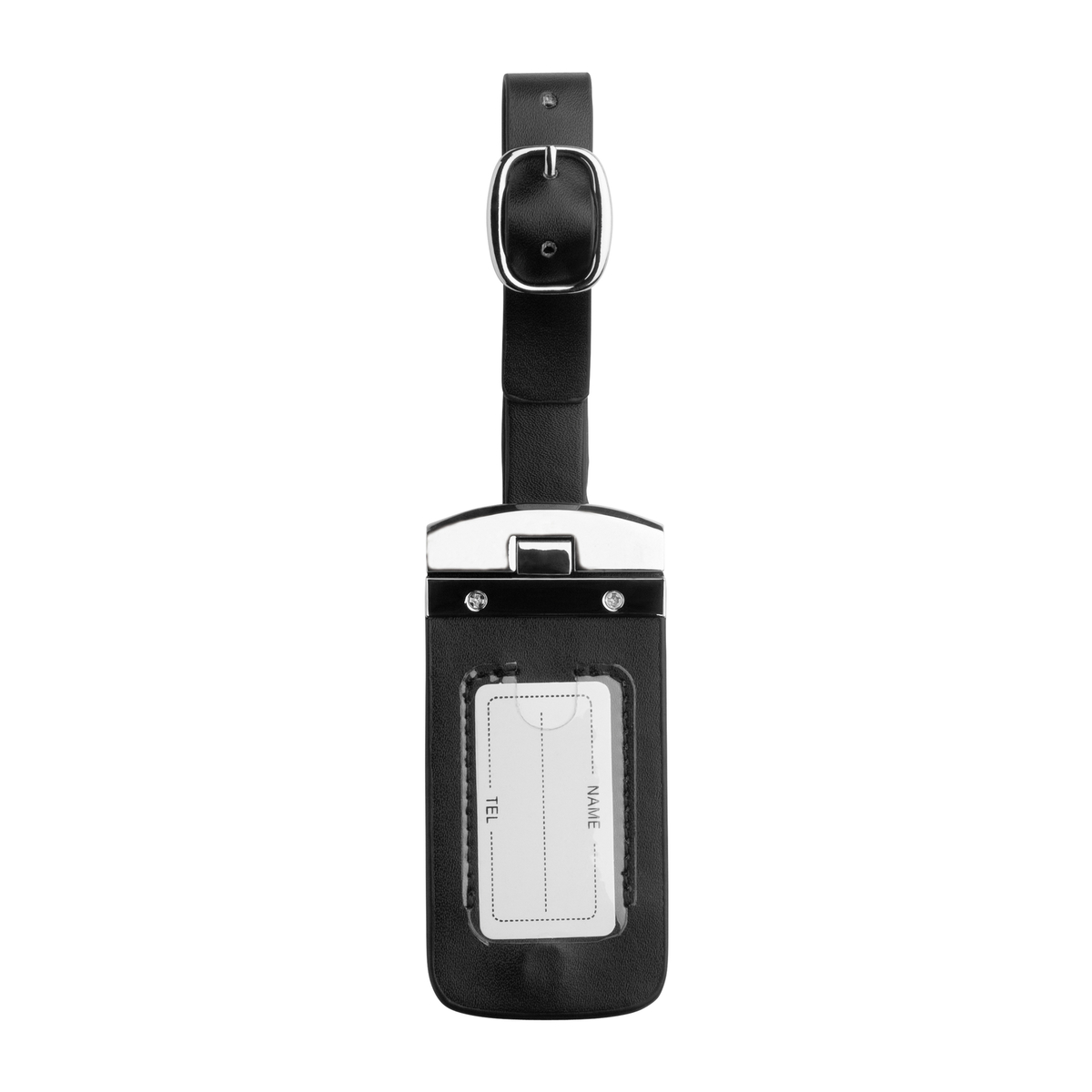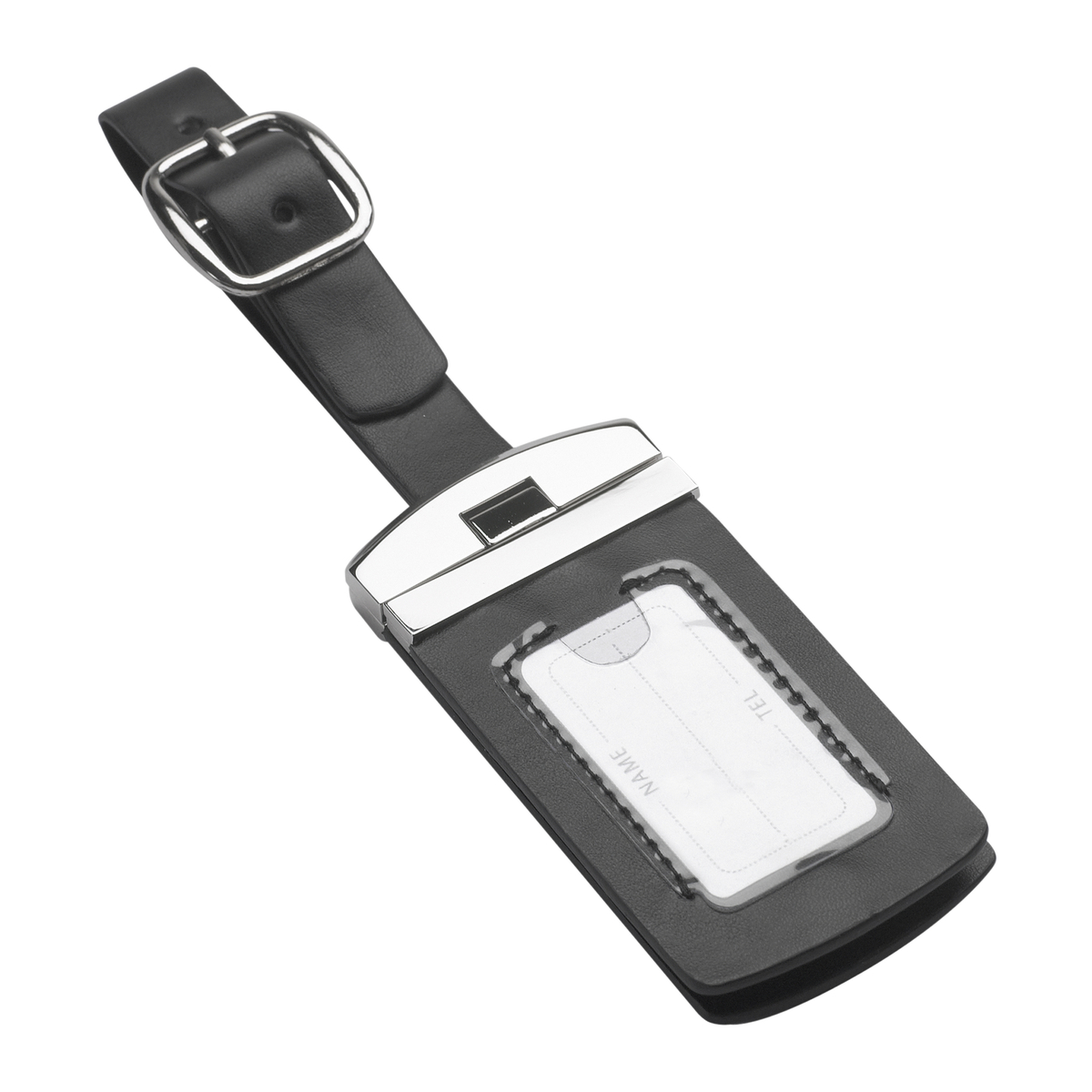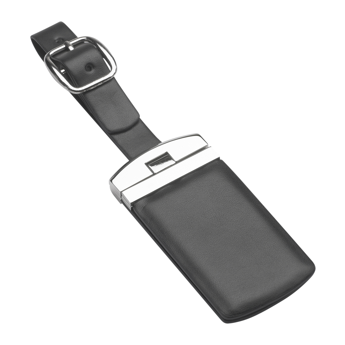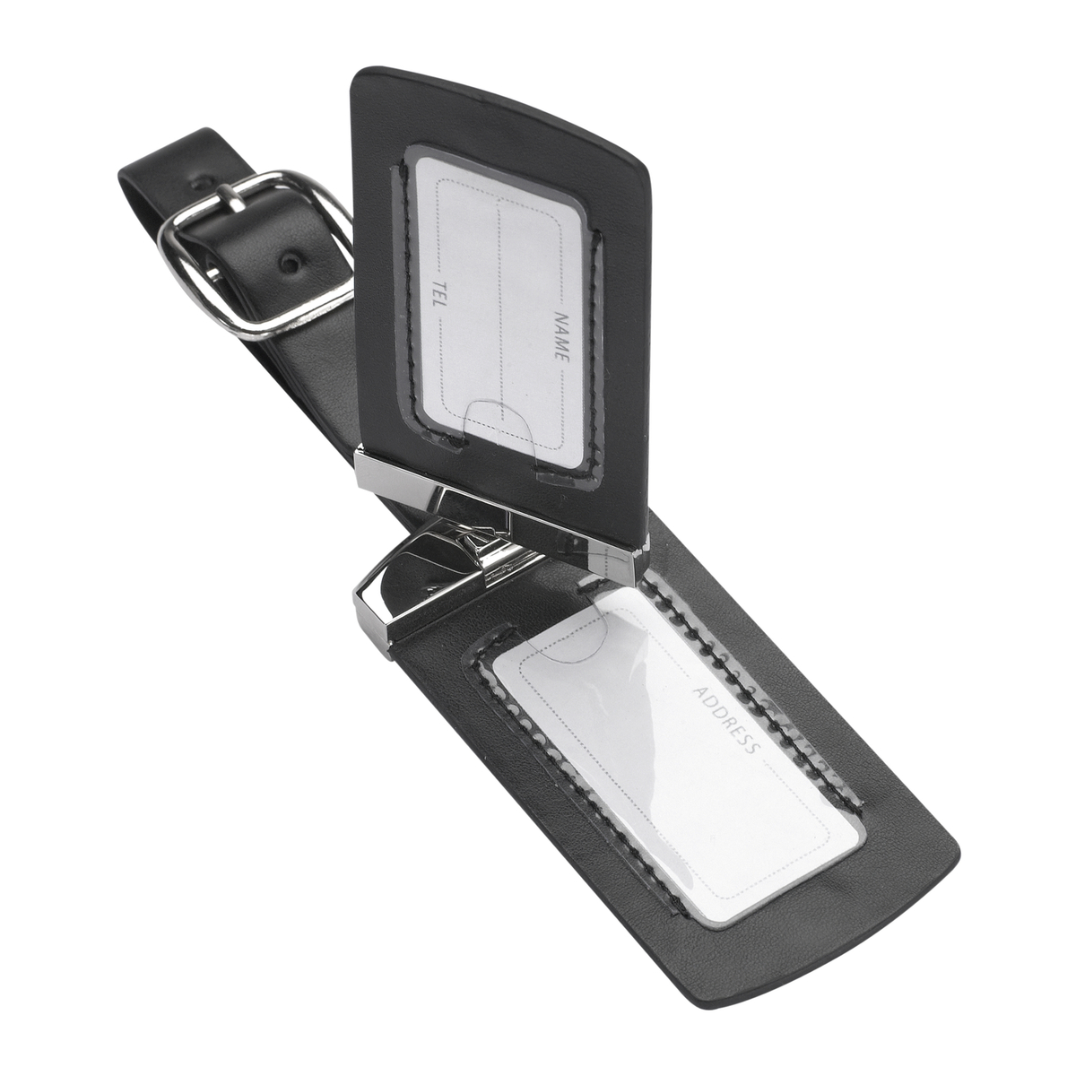 Der aufklappbare Kofferanhänger aus schwarzem Kunstleder und edlem Metall, bietet Ihnen zwei Adresslaschen, um Ihre Informationen zu hinterlegen. Mit einem Dornverschluss lässt sich der Kofferanhänger sicher an Ihrem Koffer befestigen. Der Anhänger kann mit einer Lasergravur oder einem einfarbigen Tampondruck veredelt werden.