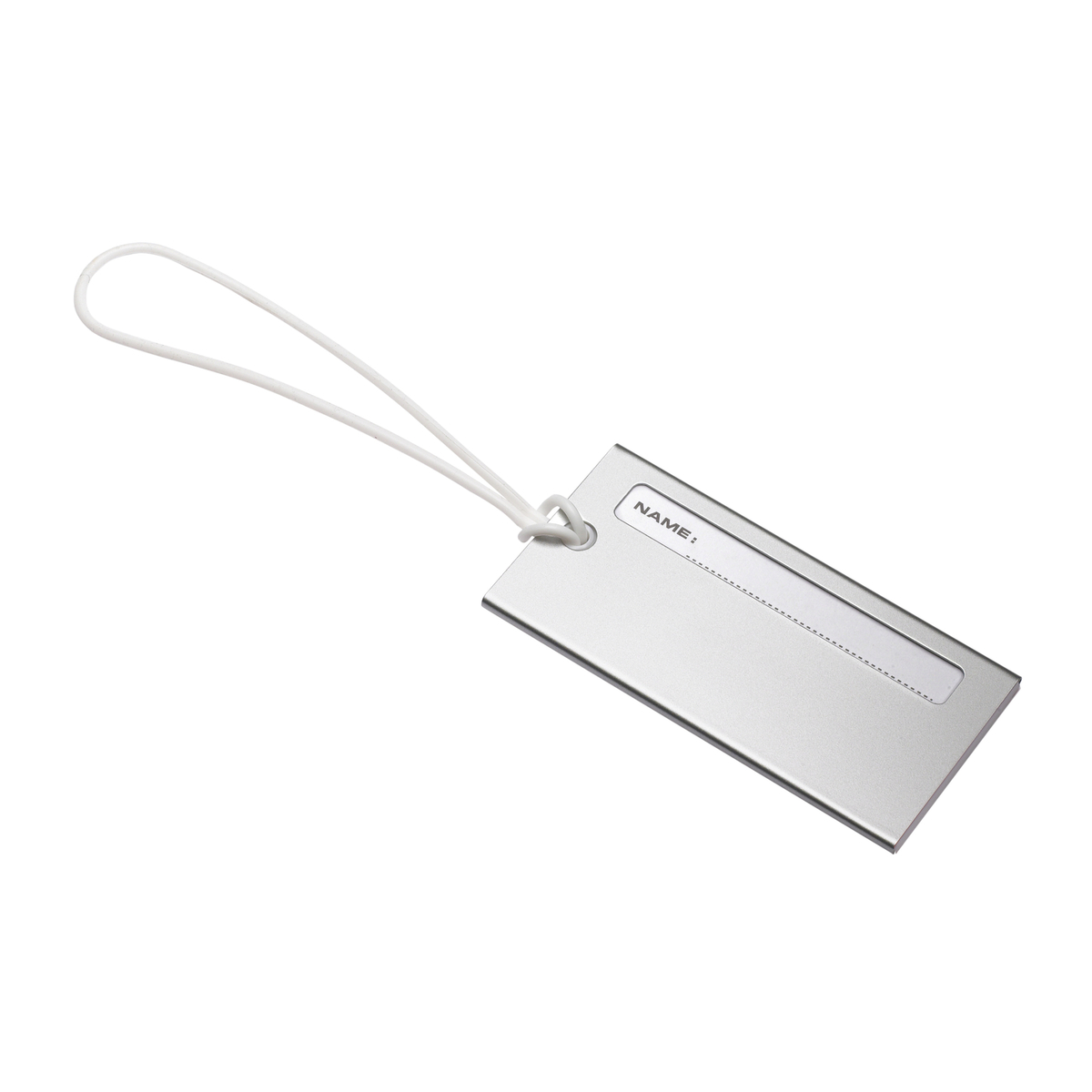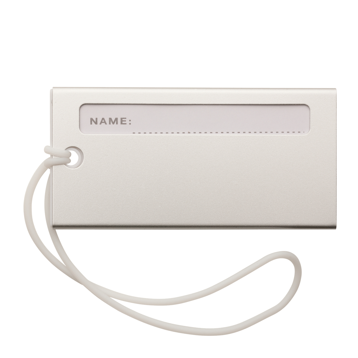 Der Gepäckanhänger ist aus Metall mit seitlichem Adresseinschub. Nach außen hin ist nur der Name sichtbar, alle weiteren Daten bleiben unter dem robusten Metall-Case verborgen. Der Anhänger wird mit einem textilen Band zur Befestigung geliefert, das beispielsweise am Griff eines Gepäckstücks angebracht werden kann. Auf dem Anhänger ist Platz für eine edle Lasergravur oder einen einfarbigen Tampondruck.