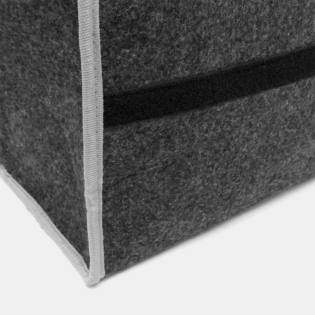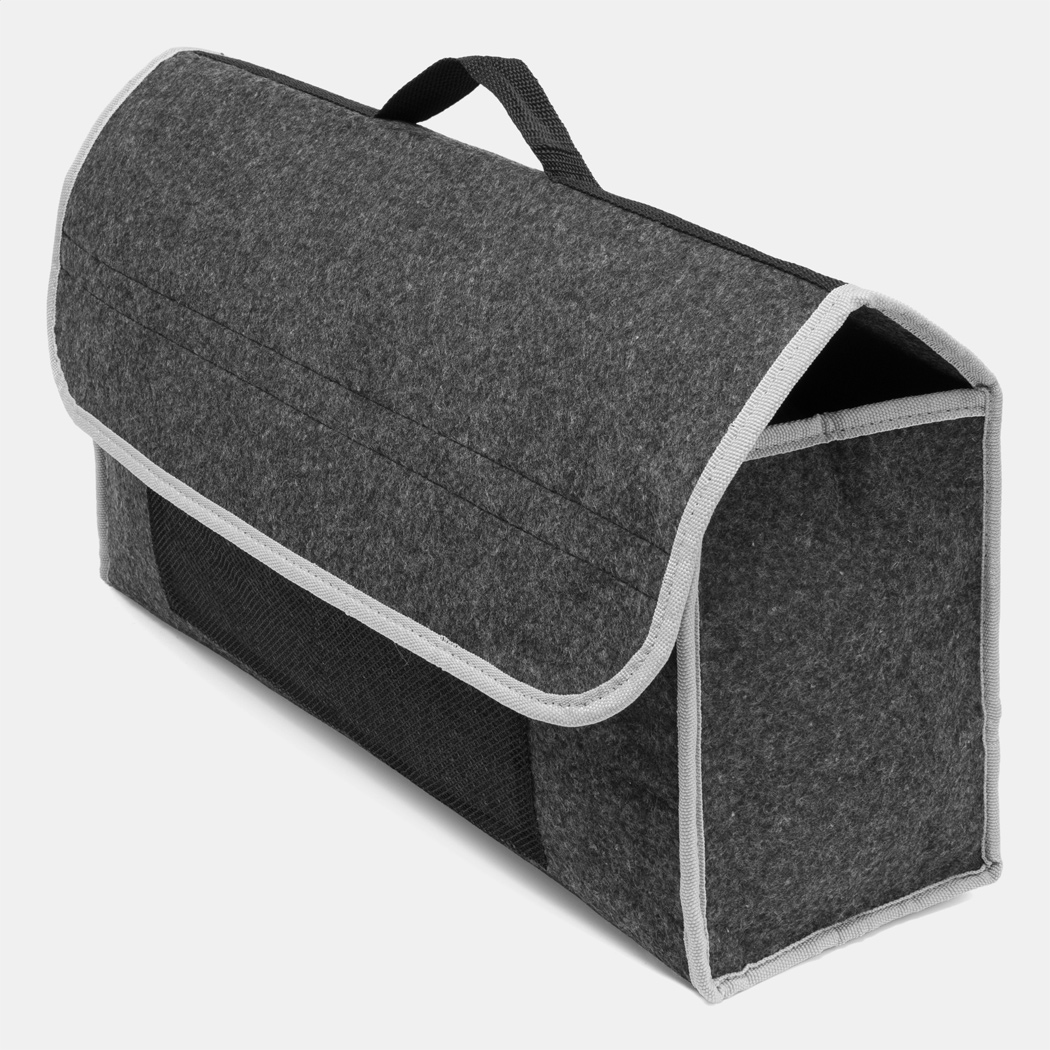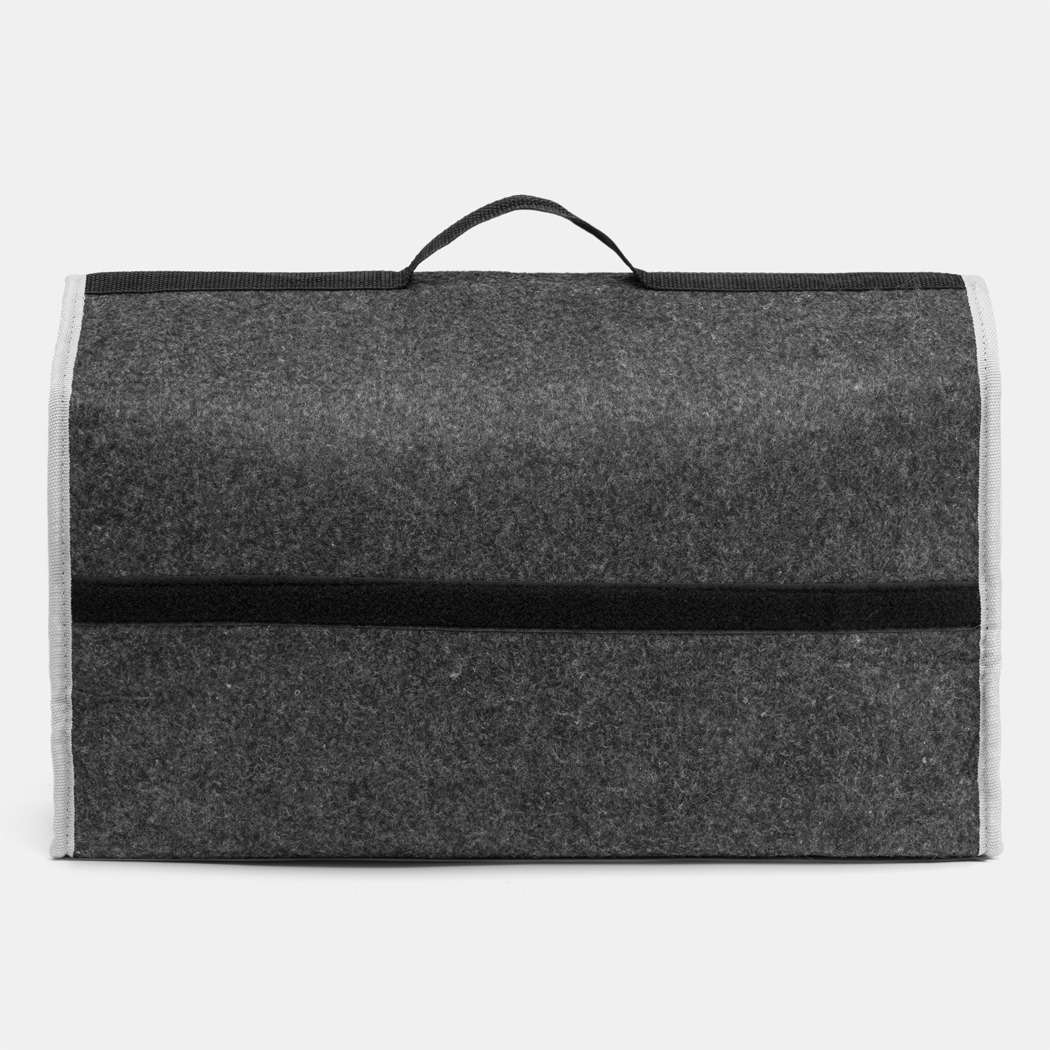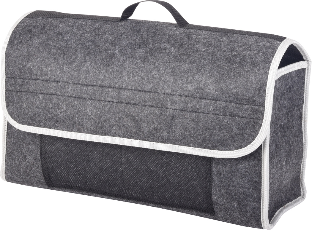 Kofferraumtasche CAR ASSISTANT: großer Innenraum, Deckel mit Klettverschluss, Tragegriff und 2 Netzsteckfächern an der Vorderseite, sichere Befestigung im Kofferraum durch Klettverschluss am Boden und an der Rückseite