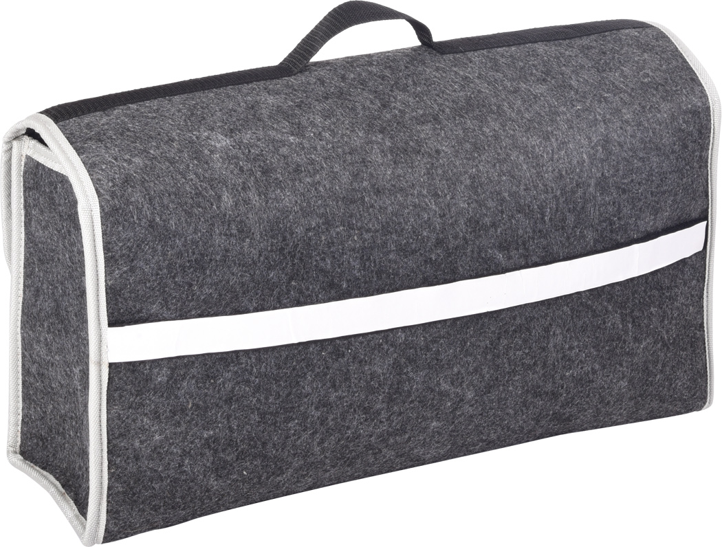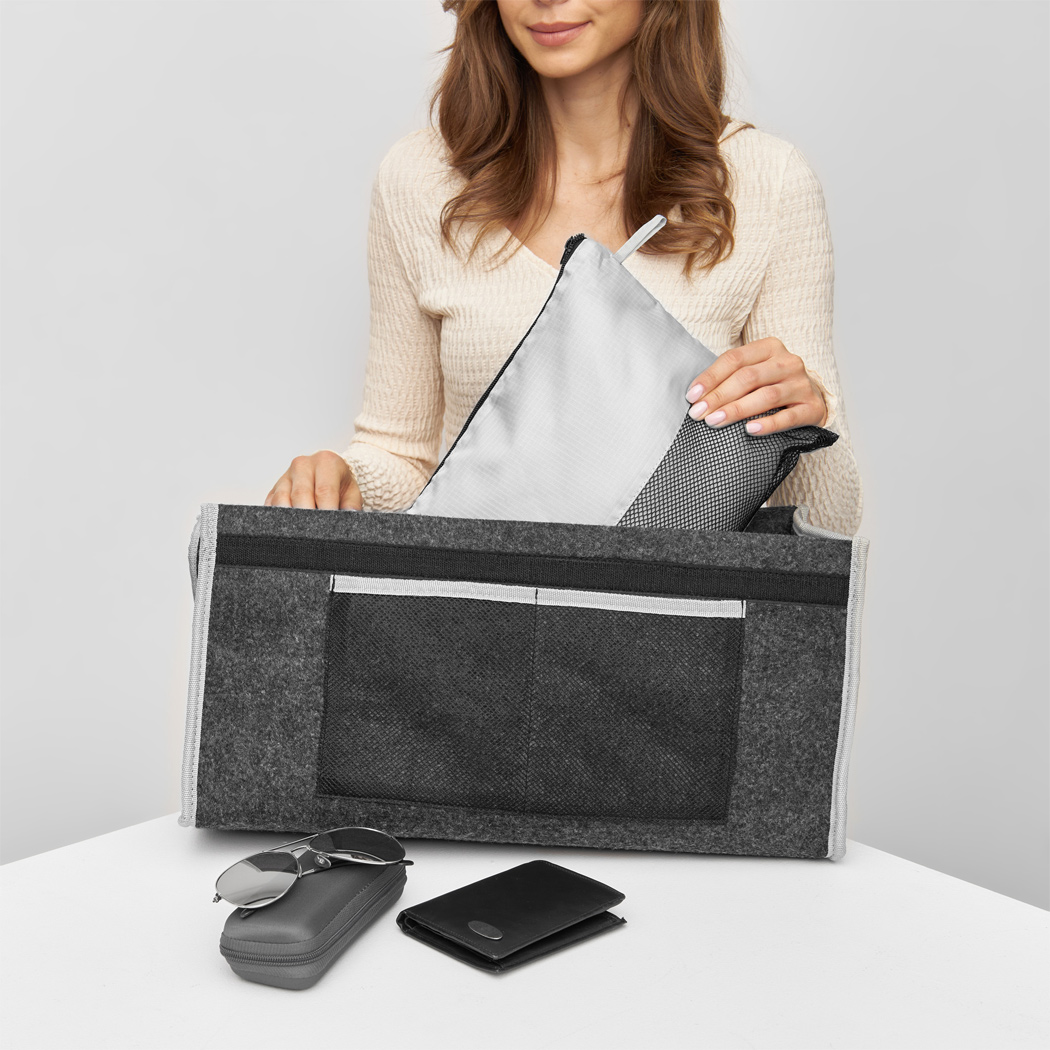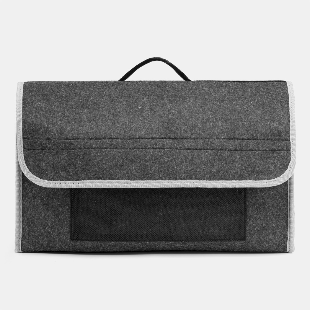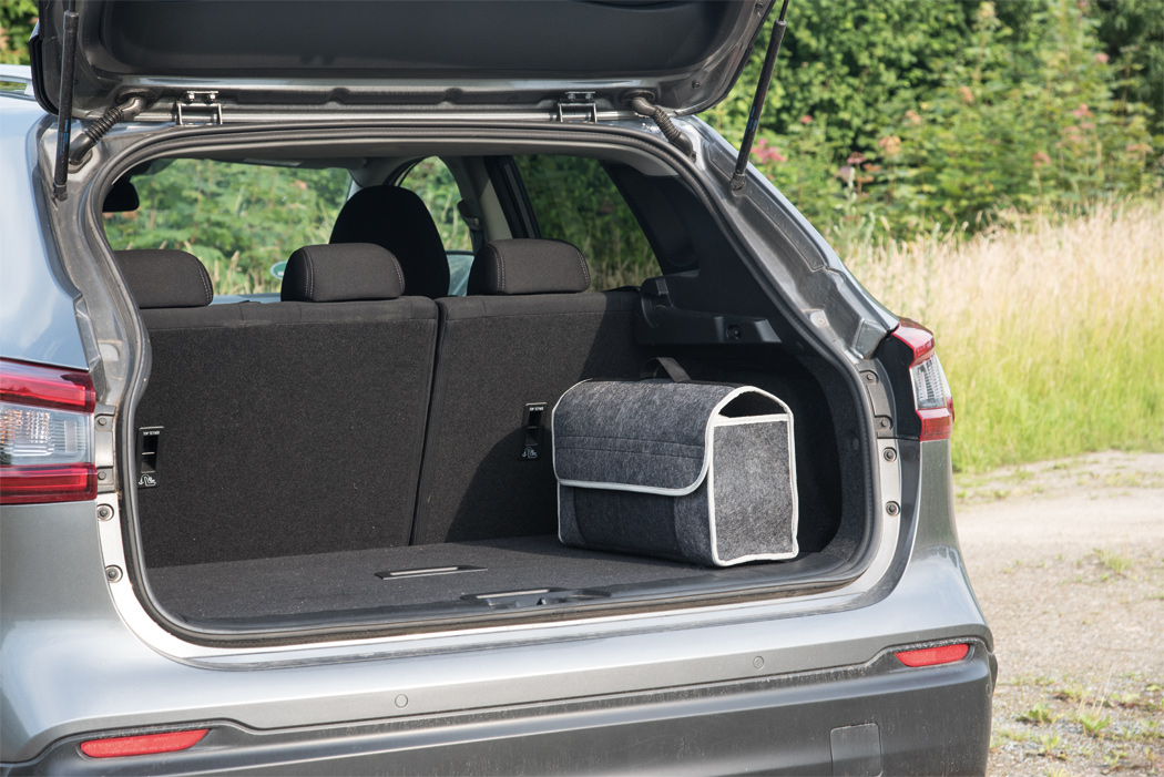 Kofferraumtasche CAR ASSISTANT: großer Innenraum, Deckel mit Klettverschluss, Tragegriff und 2 Netzsteckfächern an der Vorderseite, sichere Befestigung im Kofferraum durch Klettverschluss am Boden und an der Rückseite