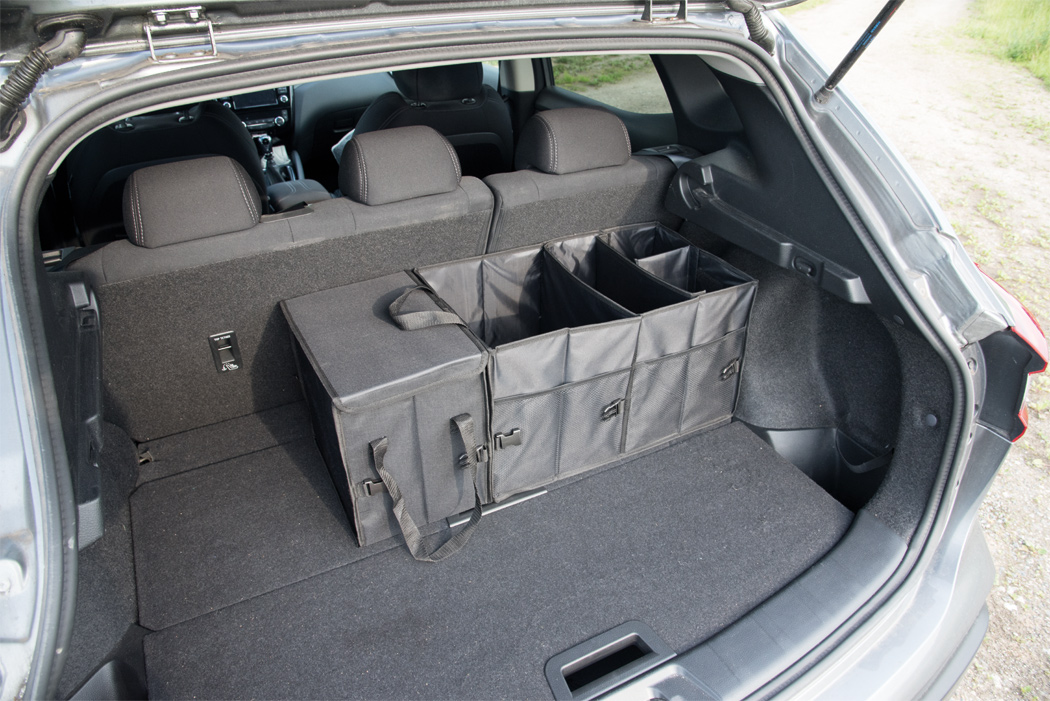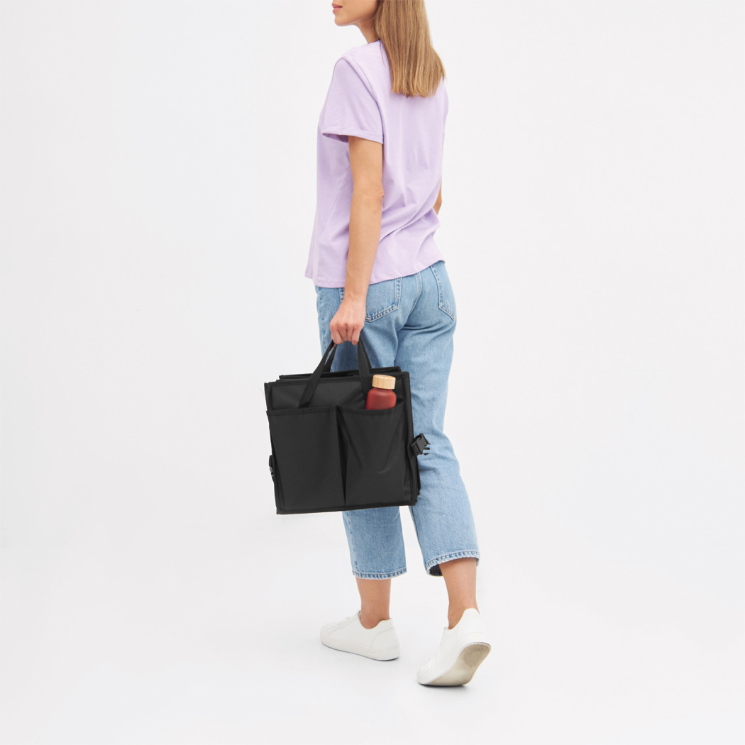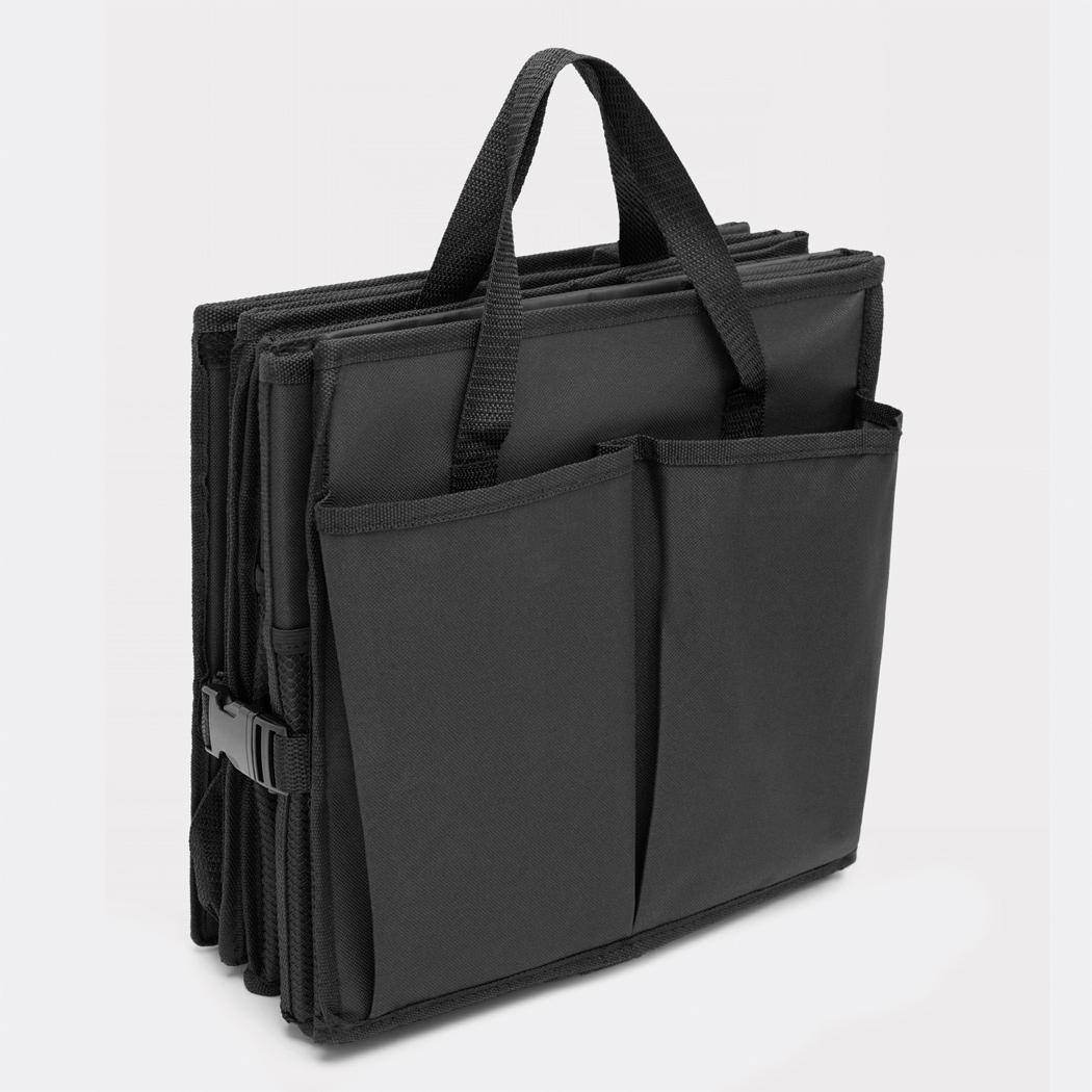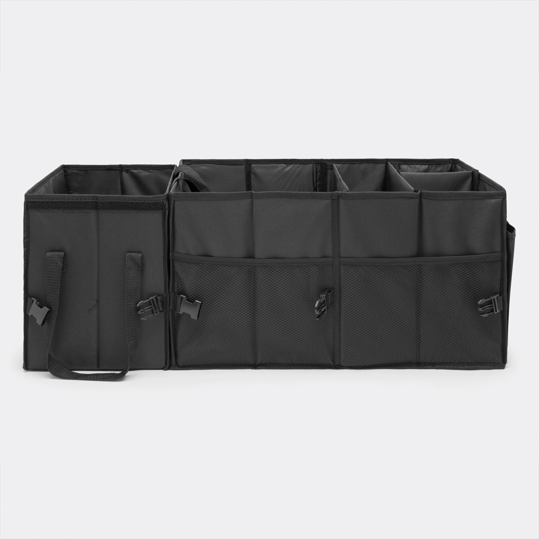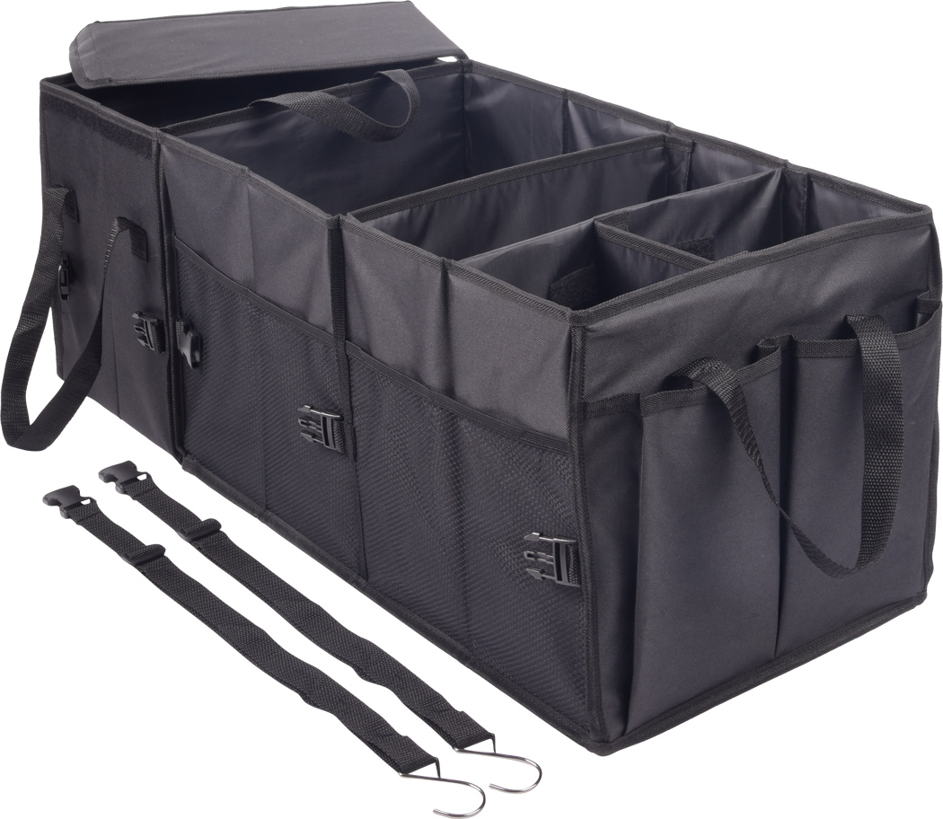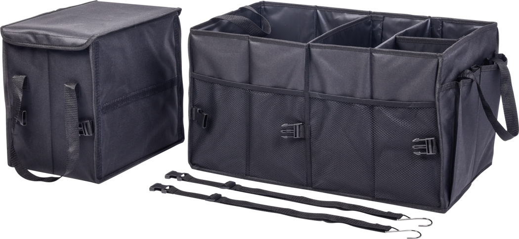 Kofferraumtasche SUPER GADGET: faltbares Design, bestehend aus 2 Taschen, die durch Klettverschluss miteinander verbunden werden können, 1 Tasche mit Deckel und Tragegriffen, 1 große Tasche mit 3 flexiblen Zwischenwänden, Tragegriffen, 2 seitlichen Steckfächern und Netzvorfächern, verstärkte Bodenplatten, 2 Gurte und zahlreiche Clips, Klettverschluss am Boden für eine Befestigung im Auto