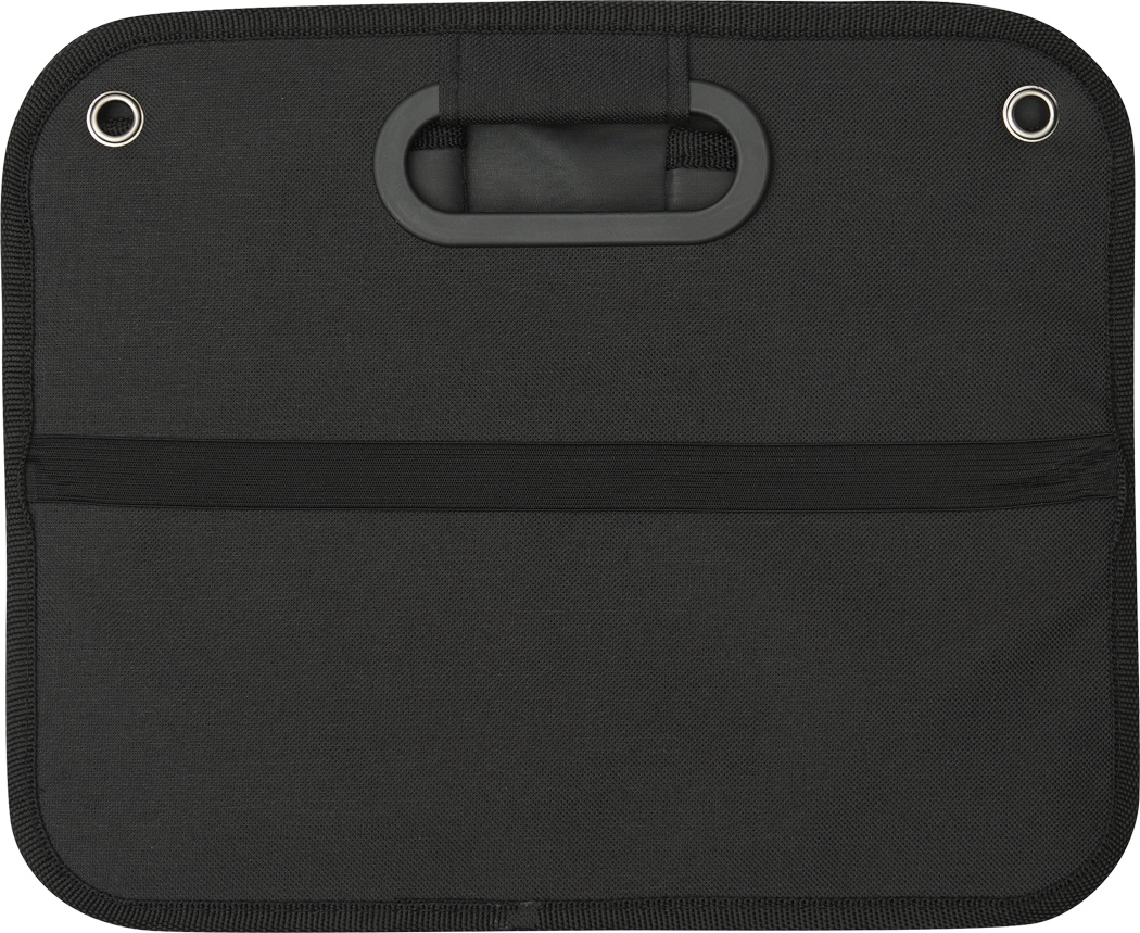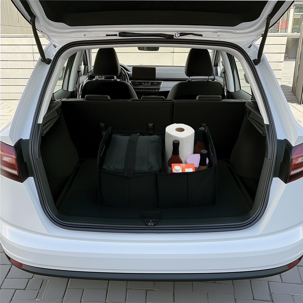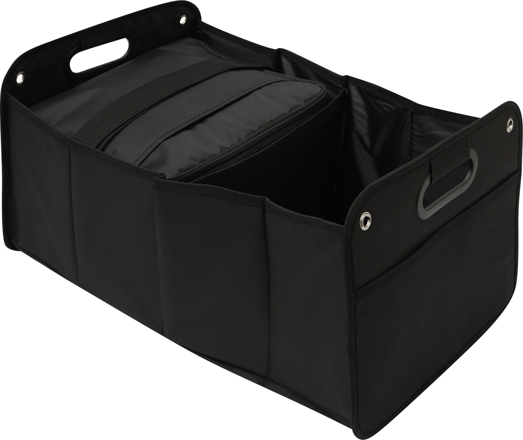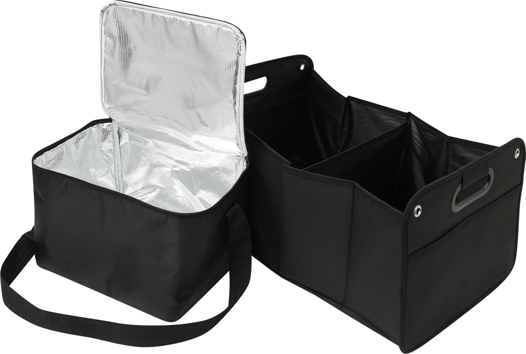 Kofferraumtaschen-Set ISO-GADGET, 2-teilig: bestehend aus 1.) separat entnehmbare Kühltasche mit verstellbarem Schultergurt und Einsteckfach auf dem Deckel, 2.) große faltbare Tasche mit 2 Fächern und Einlegeboden für viel Stauraum, sowie ein Netzeinsteckfach, 2 integrierte Tragegriffe, mit Klettverschluss am Boden für besten Halt im Kofferraum sowie 4 Metall-Befestigungsösen – bei Nichtgebrauch durch elastischen Gurt platzsparend faltbar – beide Taschen sind auch unabhängig voneinander nutzbar, die Kühltasche lässt sich passgenau in der Kofferraumtasche verstauen