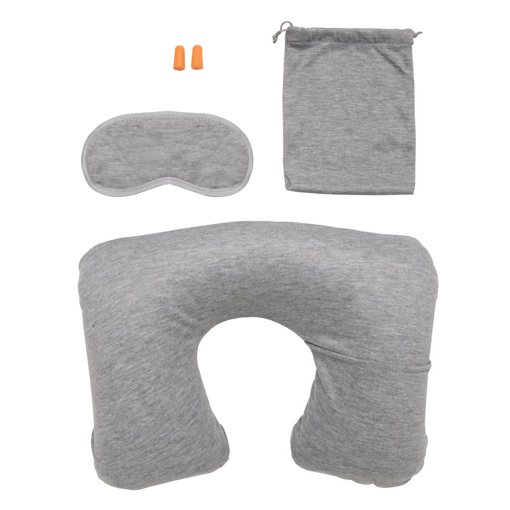 Dieses Jersey Reise-Set mit aufblasbarem Nackenkissen, einer Schlafmaske und Ohrstöpseln kommt im passenden Etui. Der Clou ist das kleine Einsteckfach am Nackenkissen für z. B. Ihr Smartphone oder Ihre Kopfhörer.
