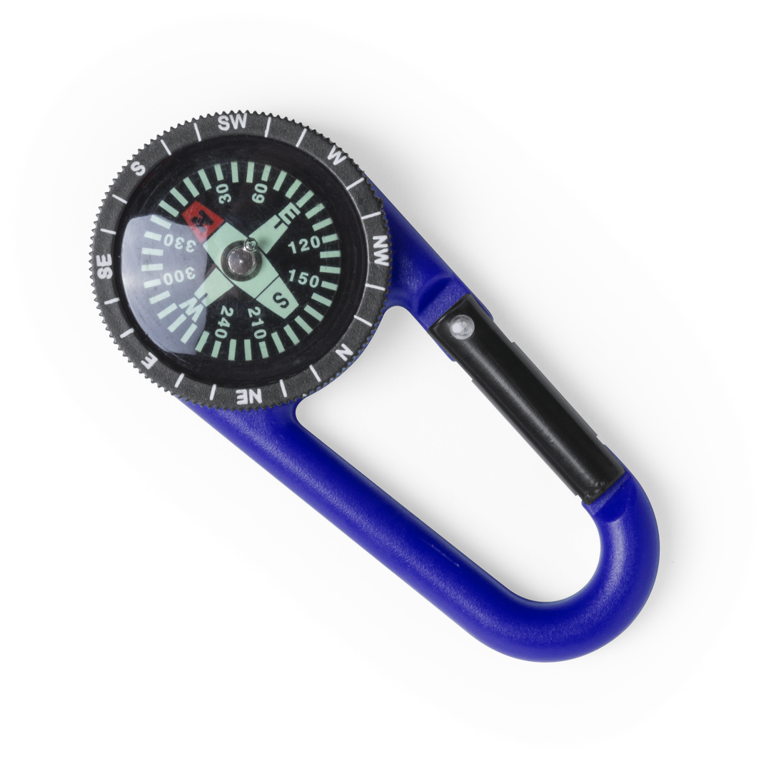 Kompass mit Karabiner in kräftigen Farben und robuster Ausführung.